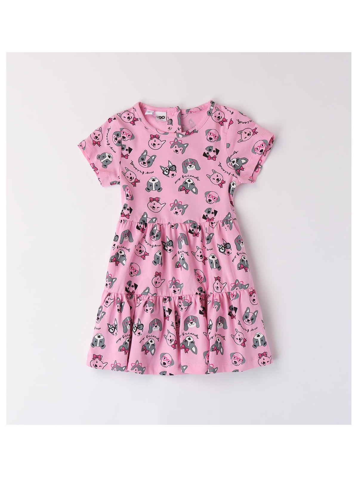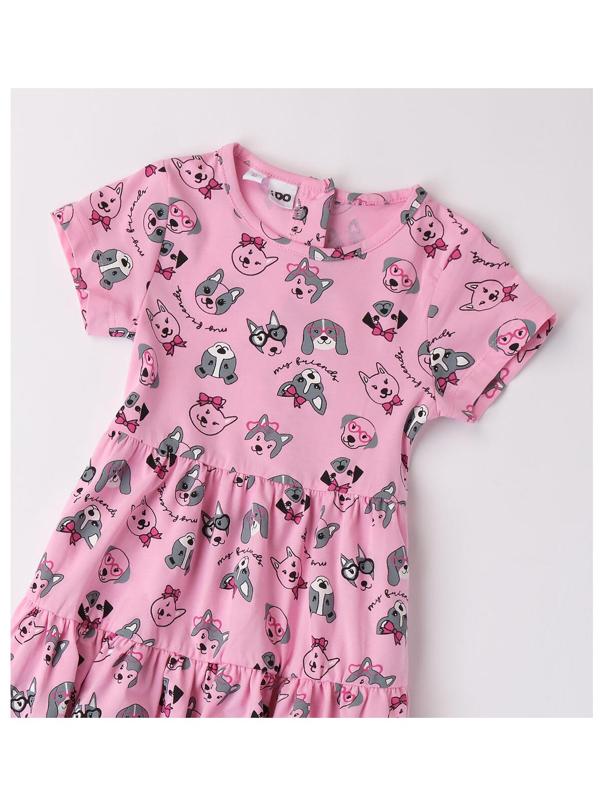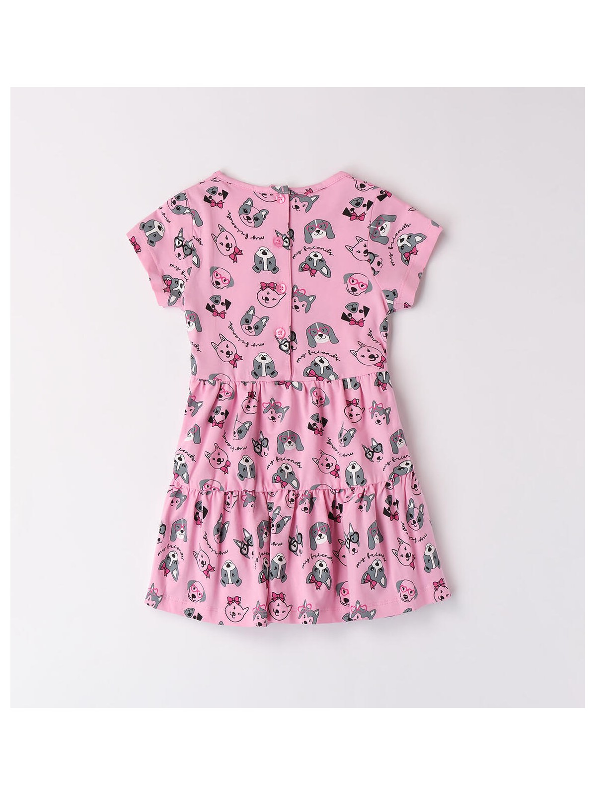 Comodo abito per bambina iDO con stampa cagnolini realizzato in jersey stretch di cotone. Gonna a balze, lunghezza al ginocchio
