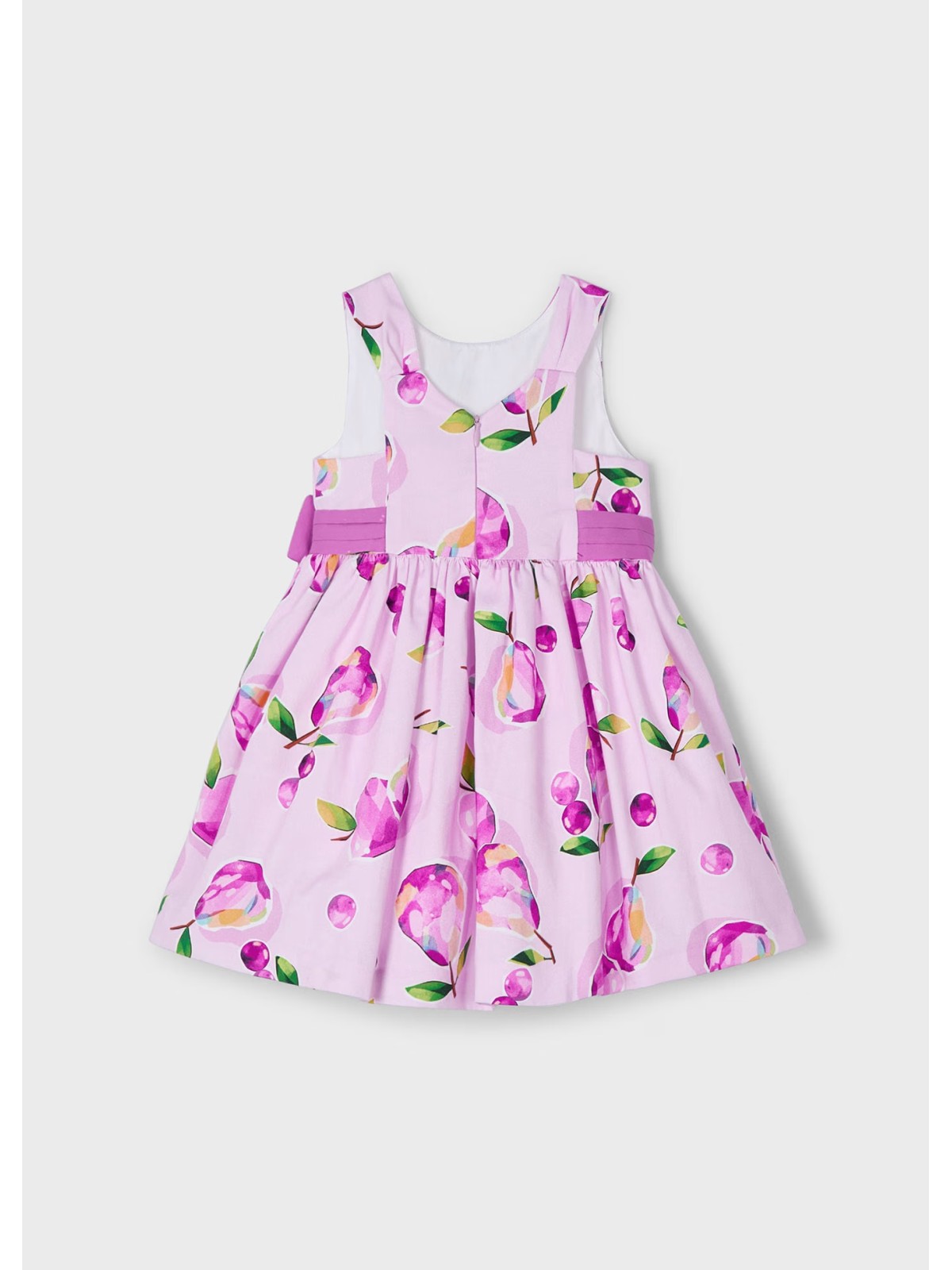 Abito bambina giromanica fantasia ciliegie , con cintura in vita e fiocco , apertura sul retro con zip.