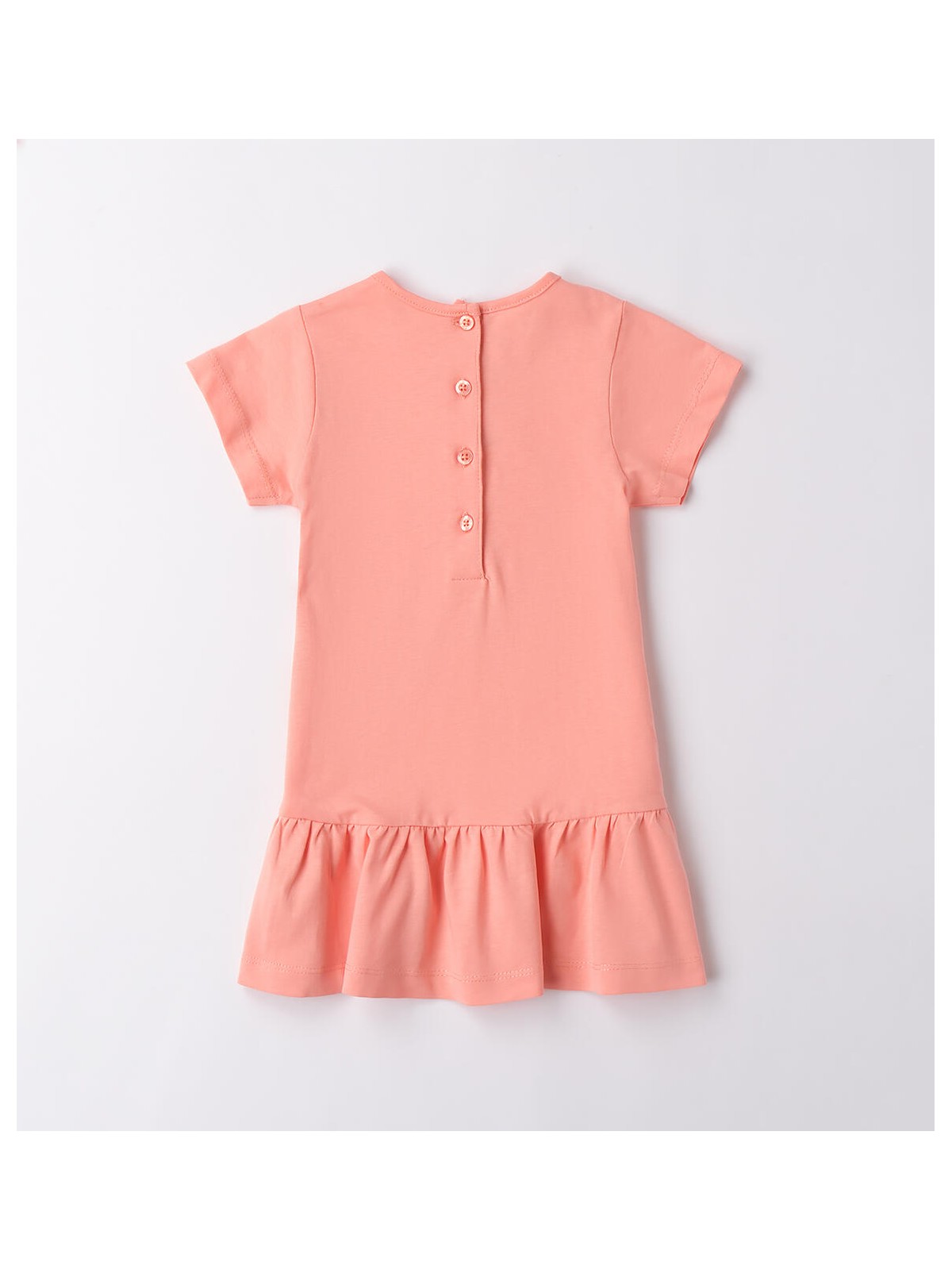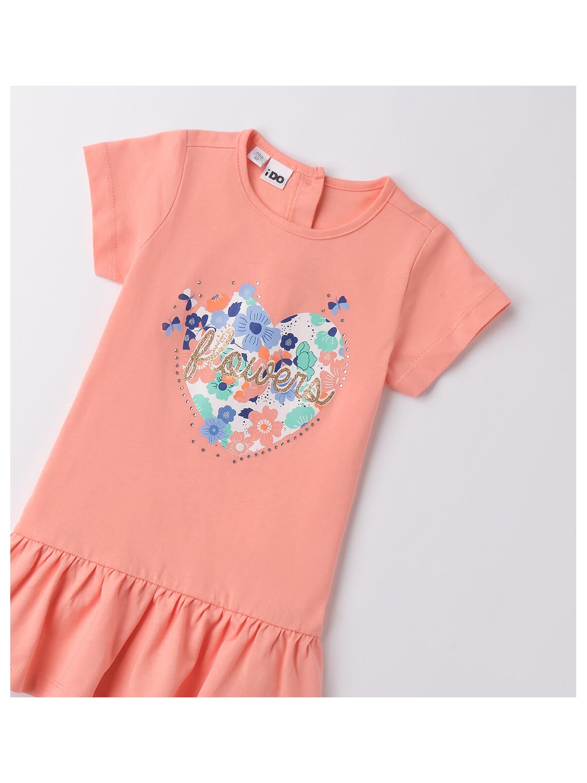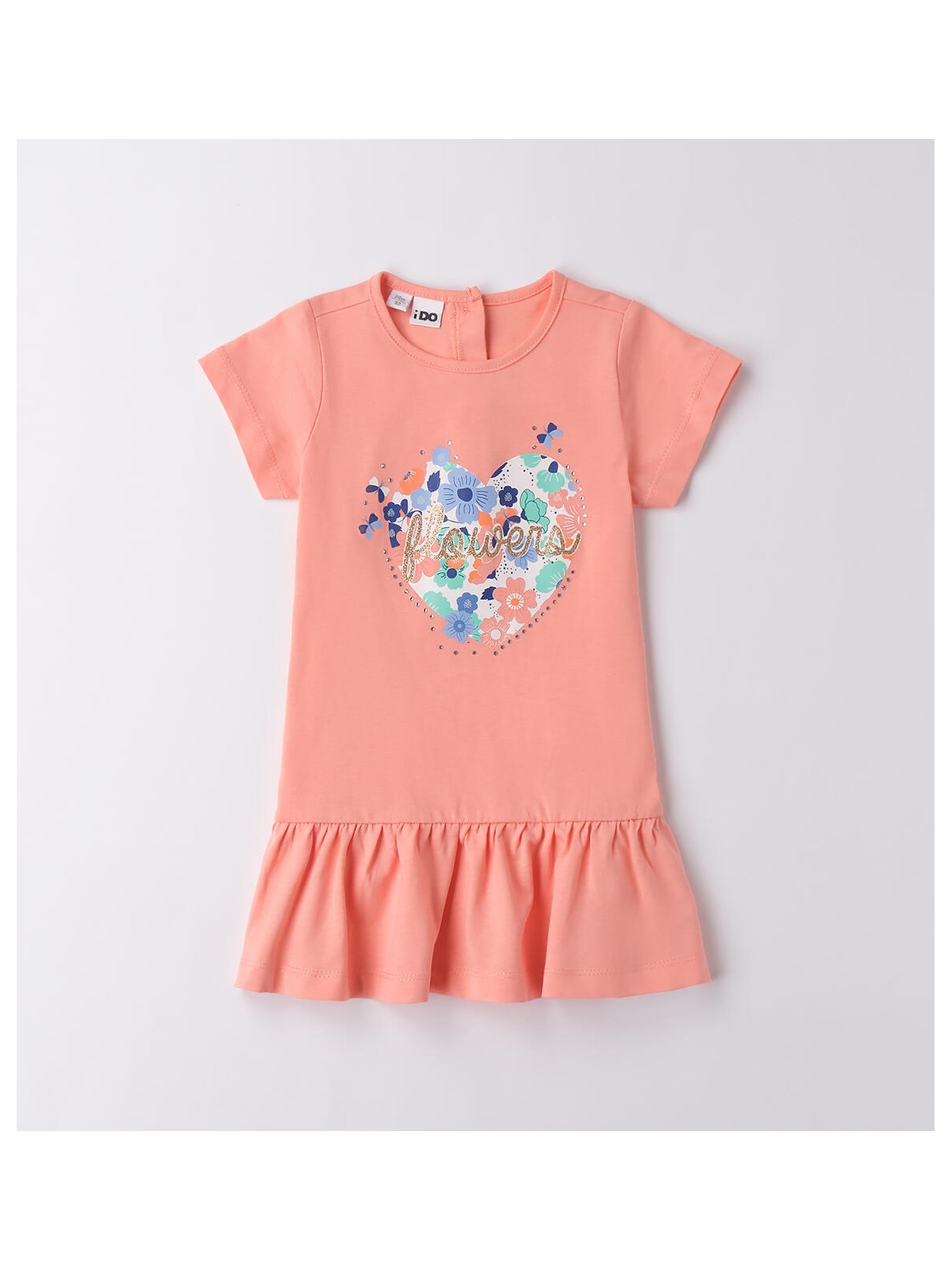 Abito estivo bambina iDO da 9 mesi a 8 anni realizzato in jersey 100% cotone. Il modello presenta apertura sul retro con bottoni, balze sul fondo e stampa cuore. Lunghezza sopra al ginocchio