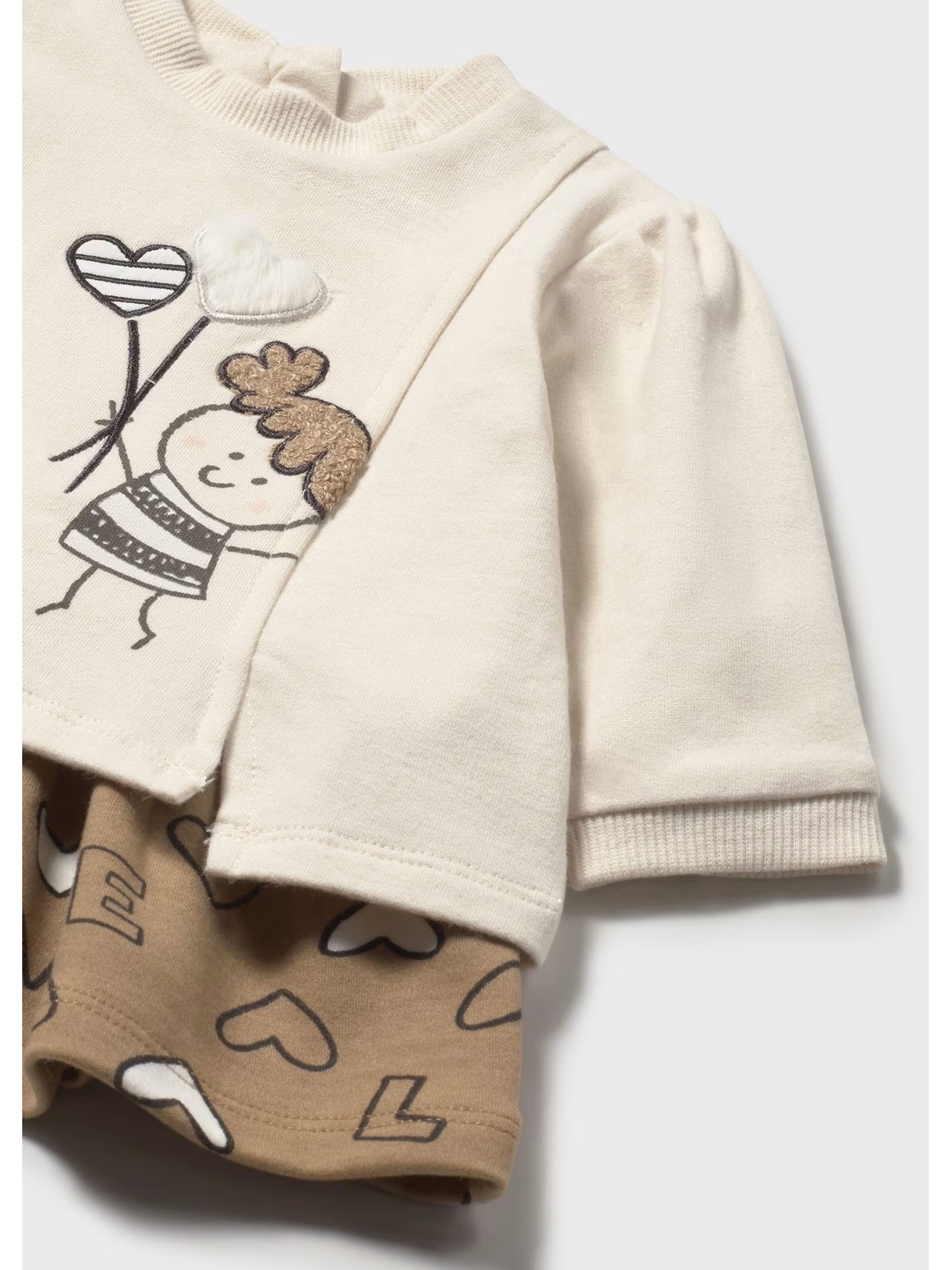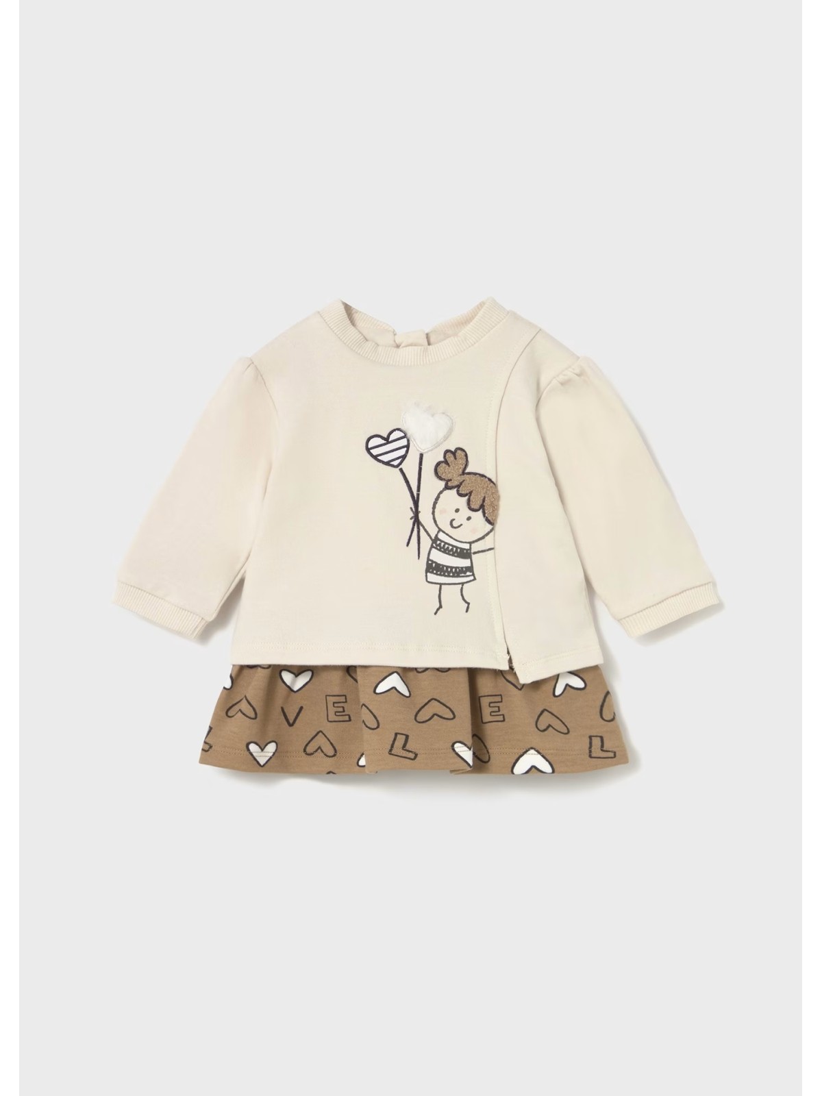 Vestito manica lunga per neonata. Girocollo. Chiusura con cerniera nella parte posteriore per un vestibilità rapida e comoda. Elementi decorativi: applicazioni decorative, ricami