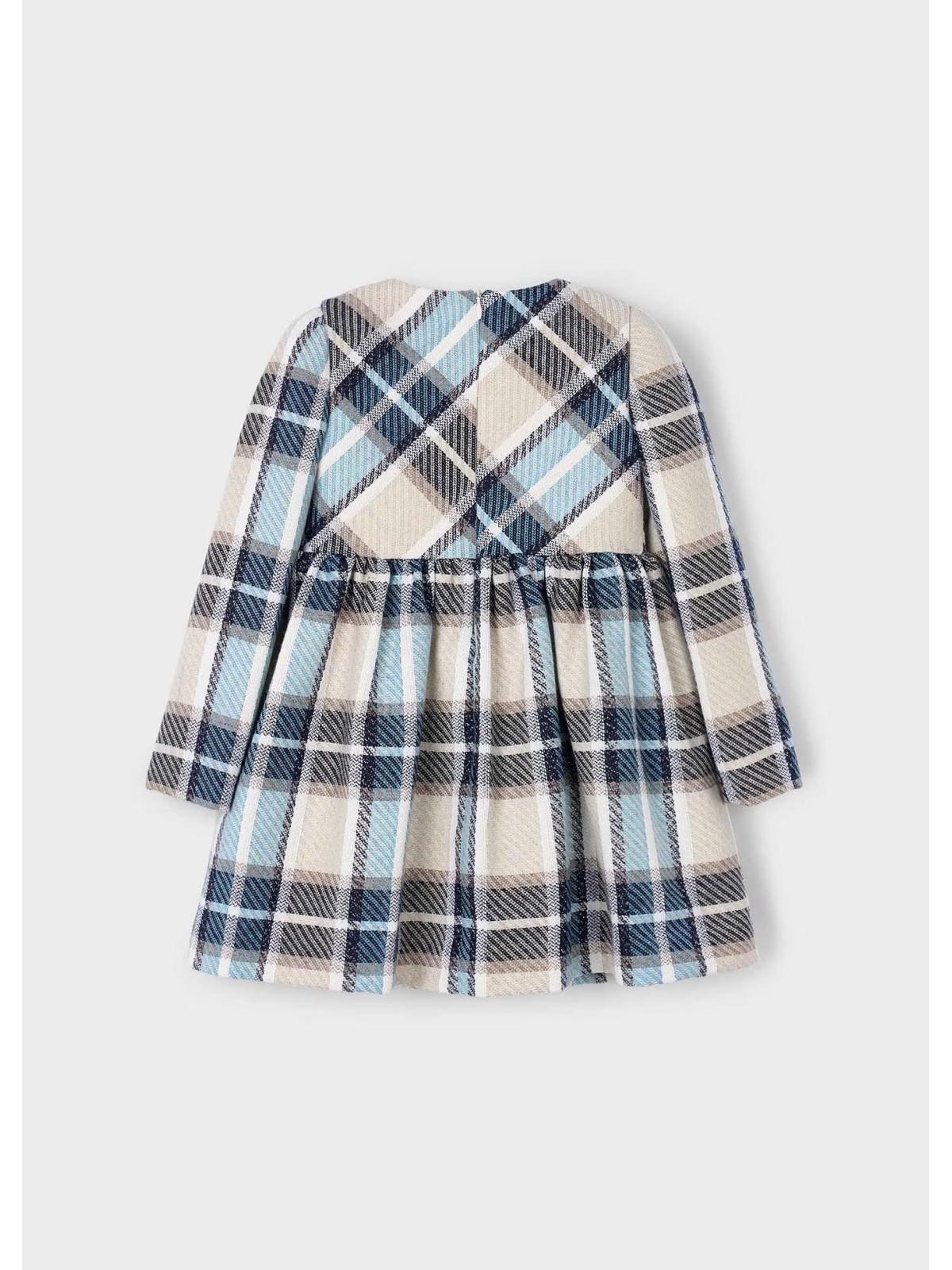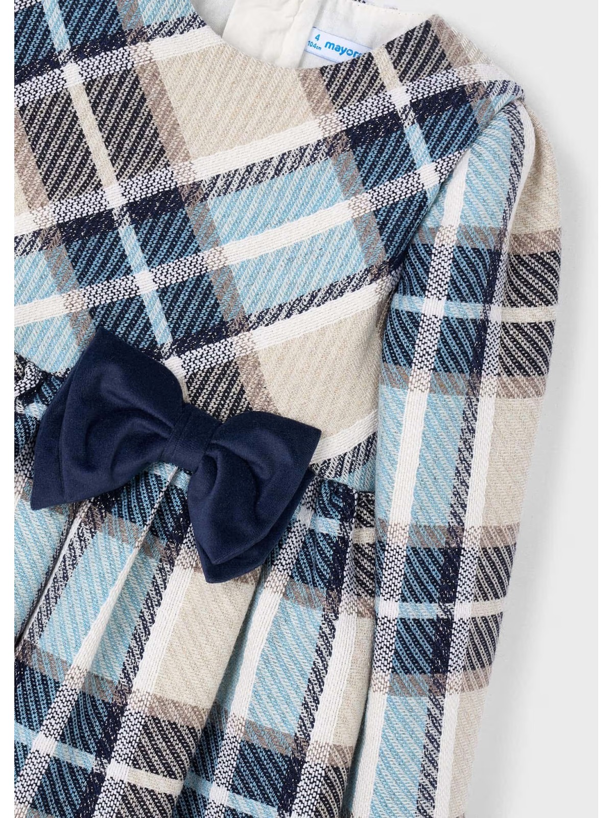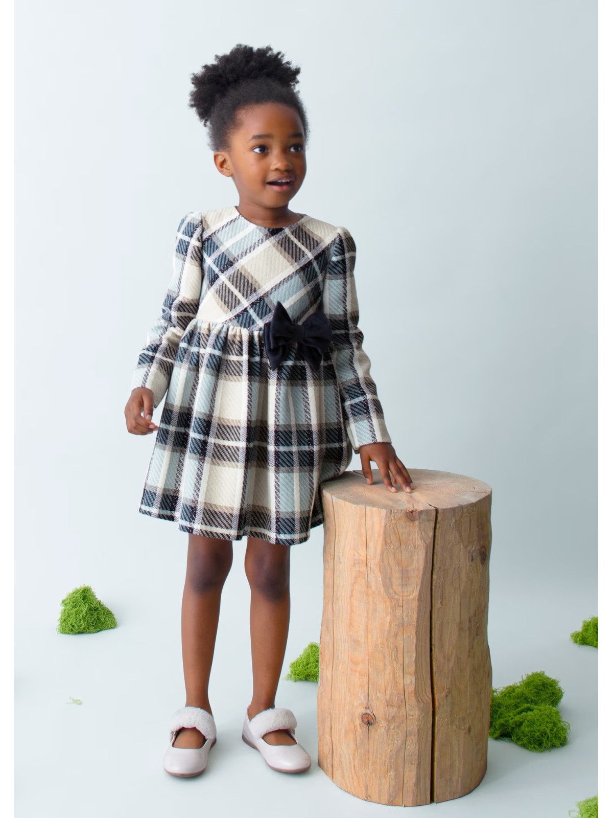 Vestito manica lunga per bambina. Chiusura centrale posteriore con cerniera nascosta. Confezione in velluto elegante e classico. Modello con fodera interna. Modello con riccio. Elementi decorativi: fiocco. Trama a quadri.