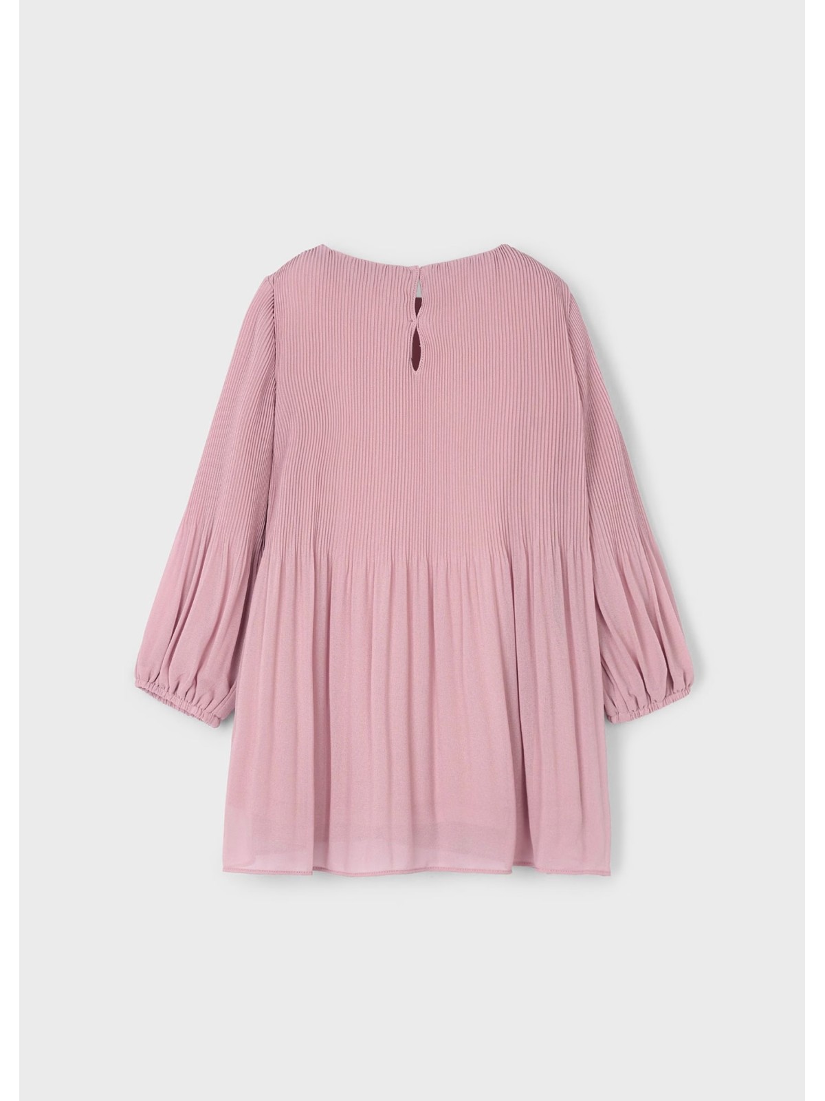 Vestito manica lunga per bambina con polsini elasticizzati. Piccola apertura sulla schiena con chiusura con bottone per facilitare la vestibilità del capo. Chiffon leggero. Morbida fodera interna in poliestere. Modello dal design plissettato.