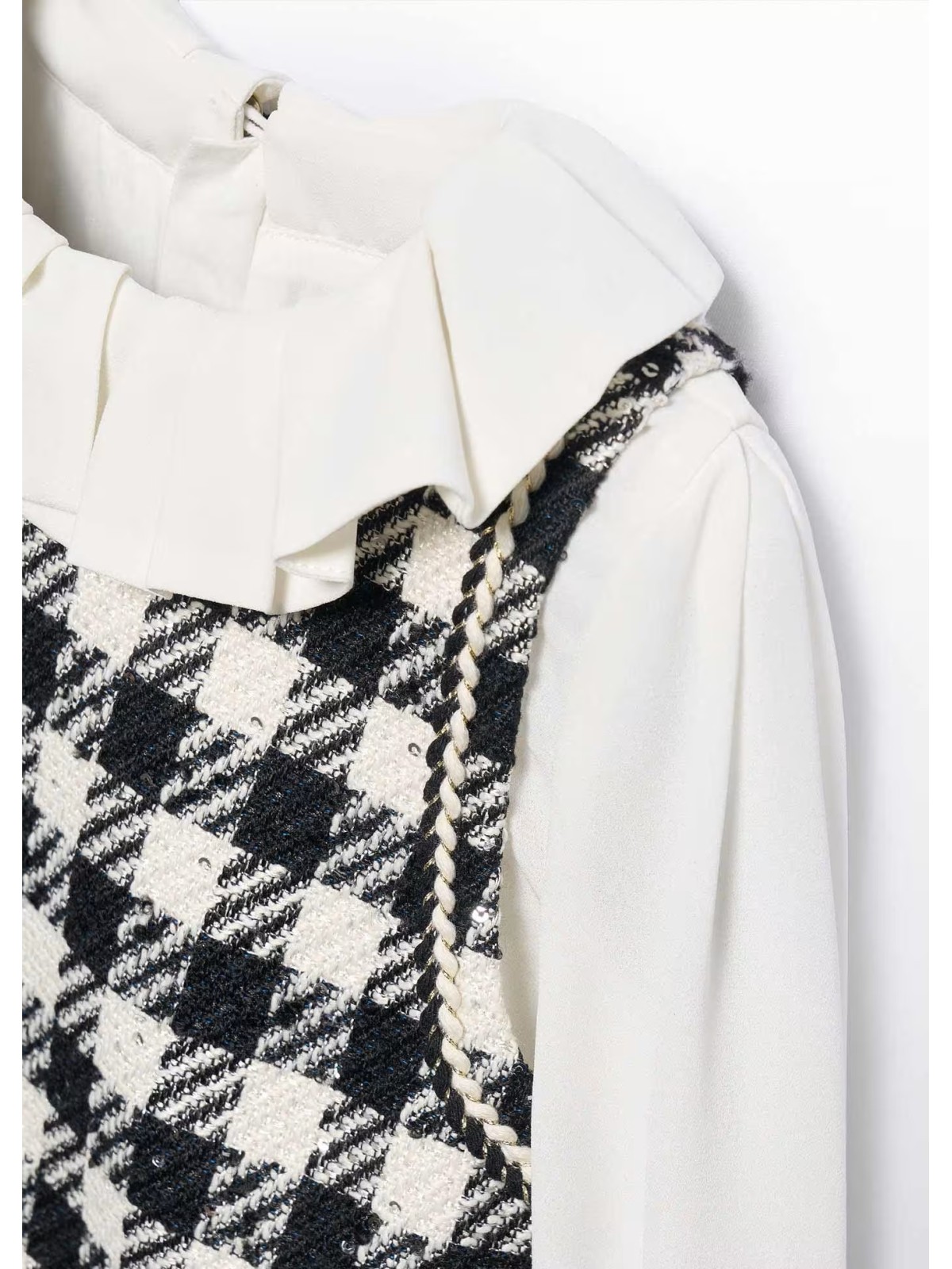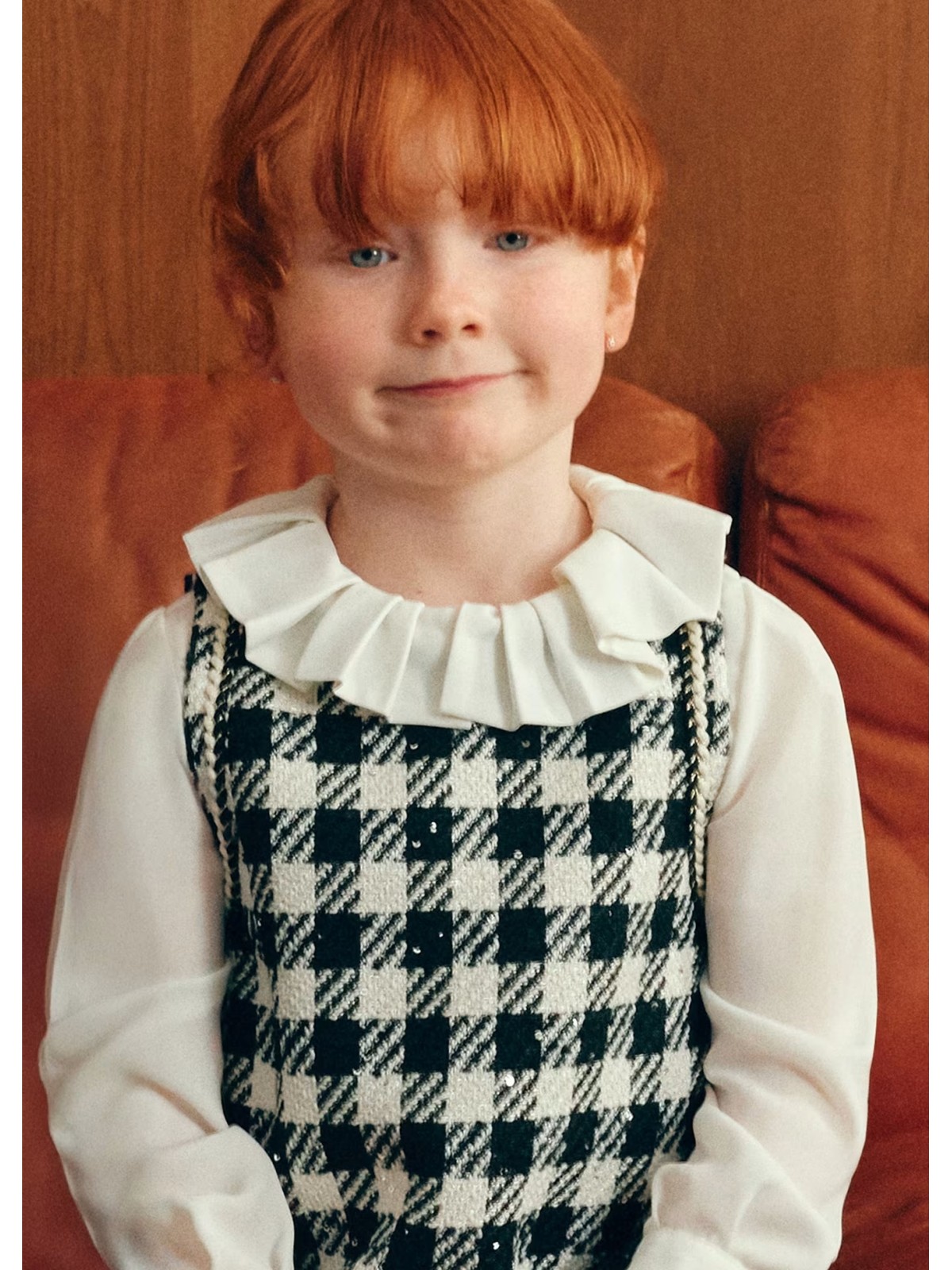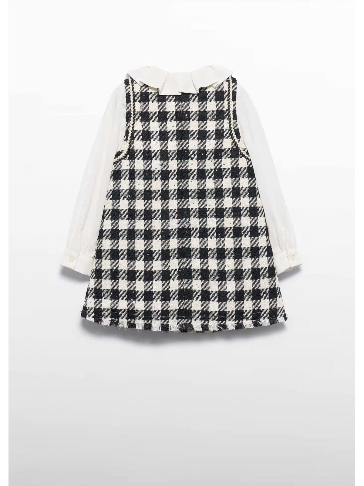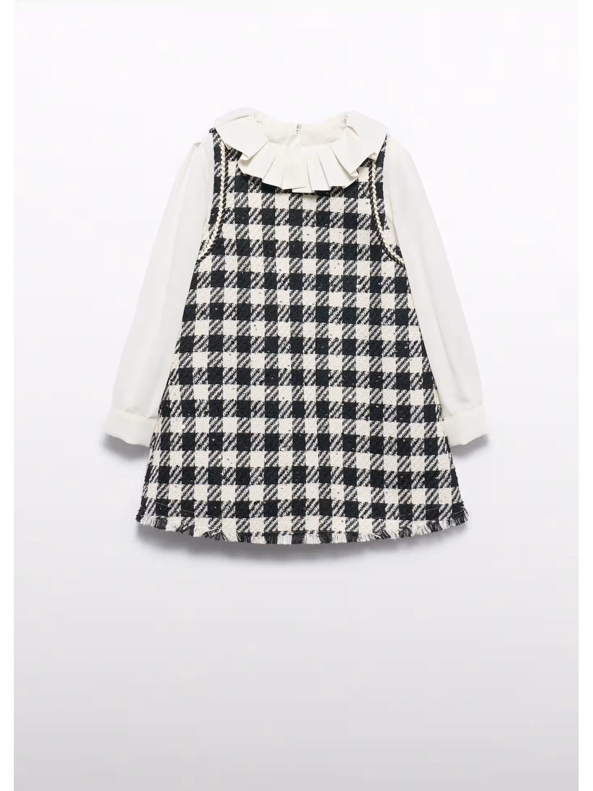 Vestito manica lunga per bambina con polsini elasticizzati nella parte interna. Colletto bebè. Chiusura con cerniera nella parte posteriore per un vestibilità rapida e comoda. Fantasia quadri.