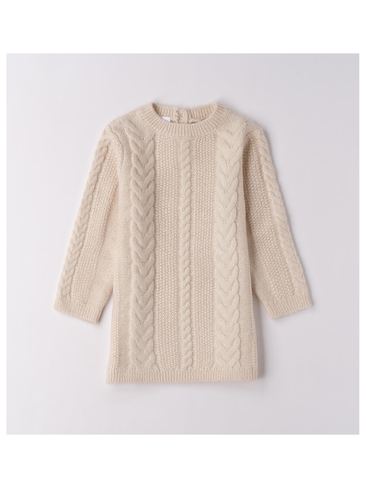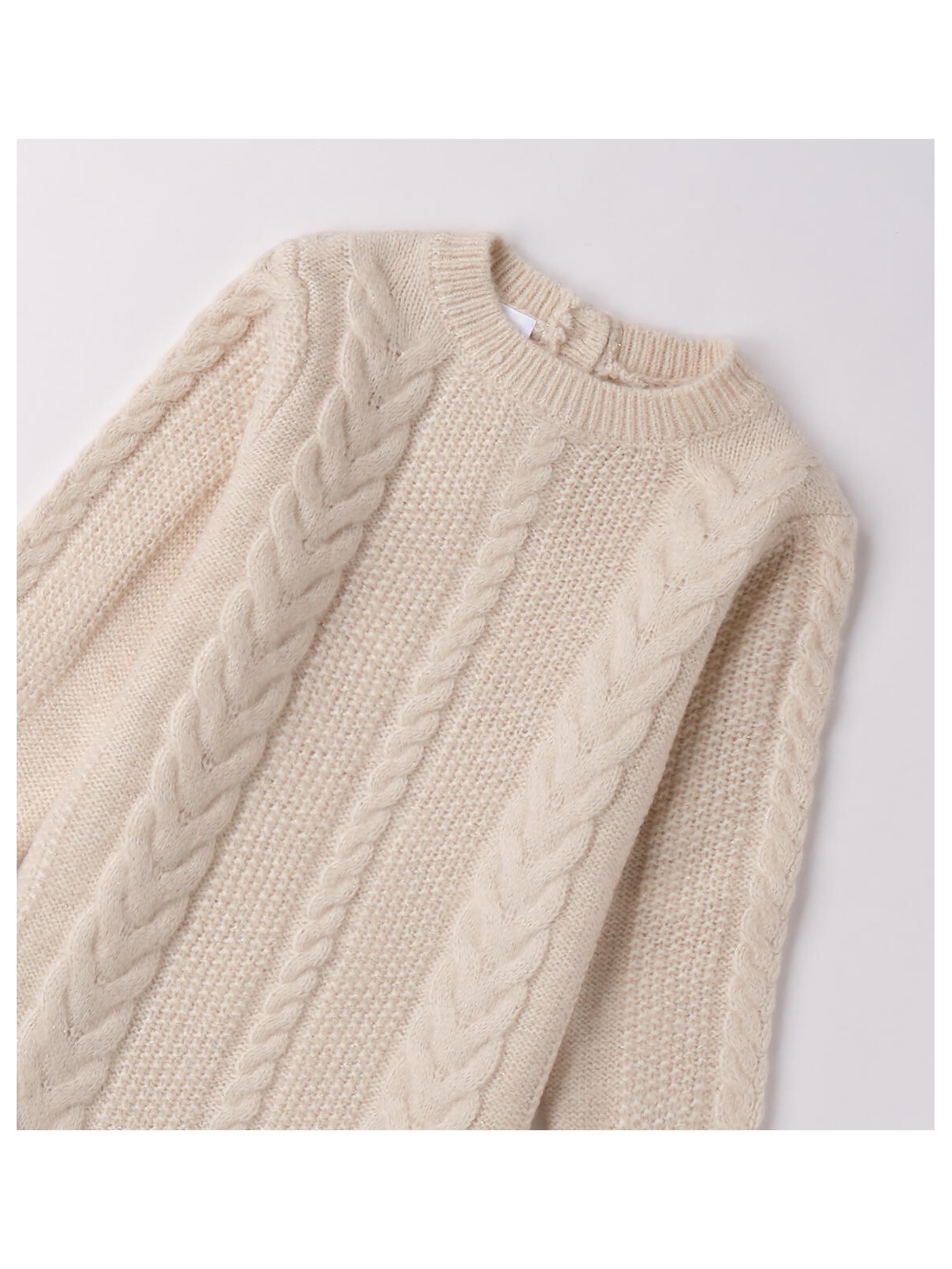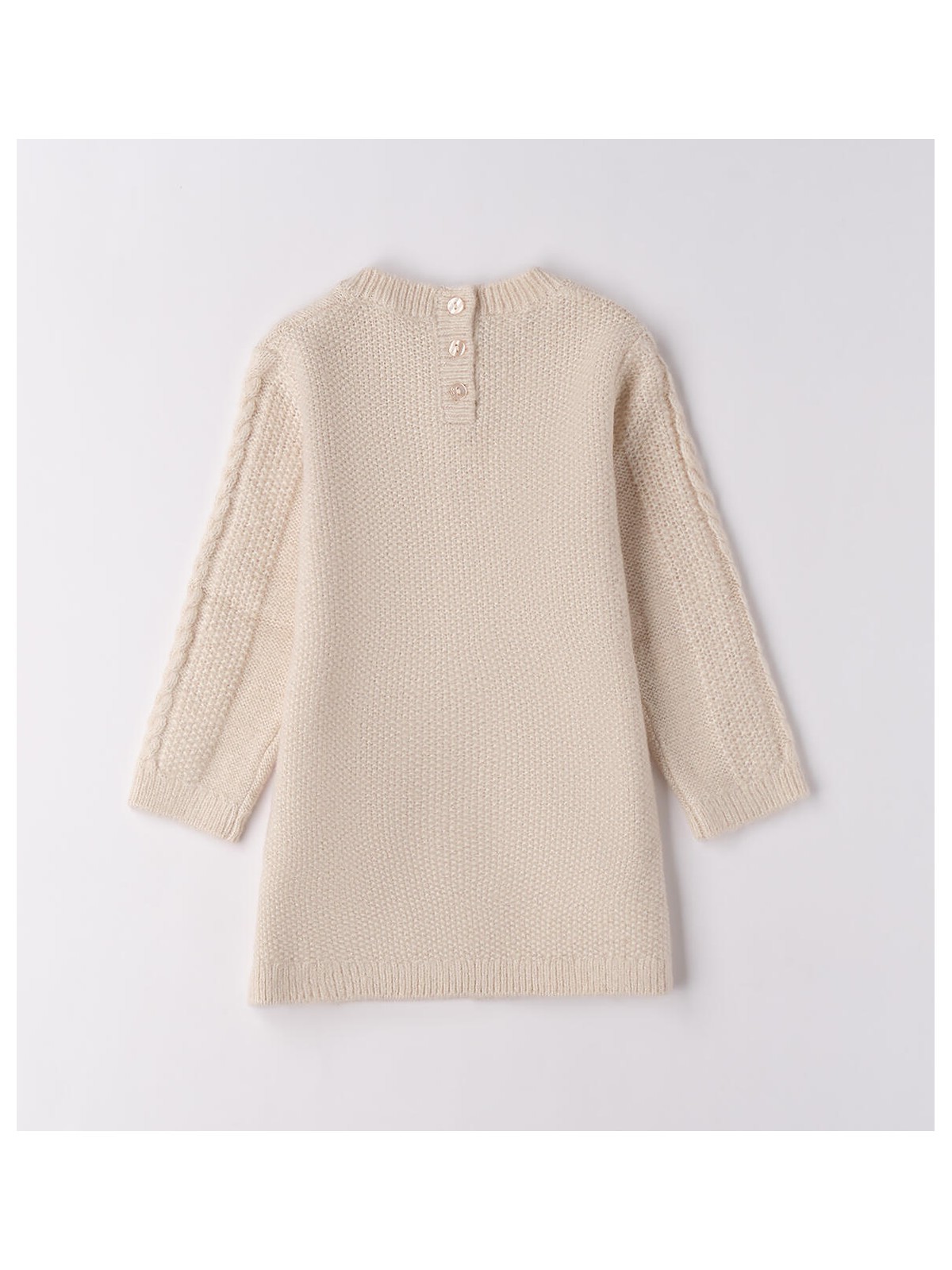 Abito per bambina realizzato in morbidissimo tricot lurex, lavorazione treccia. Il modello presenta apertura sul retro con bottoni. Lunghezza mini