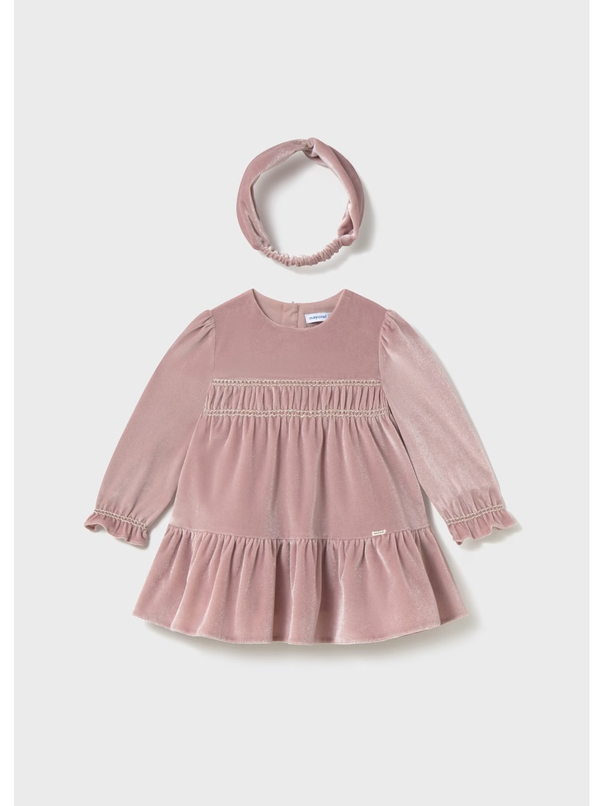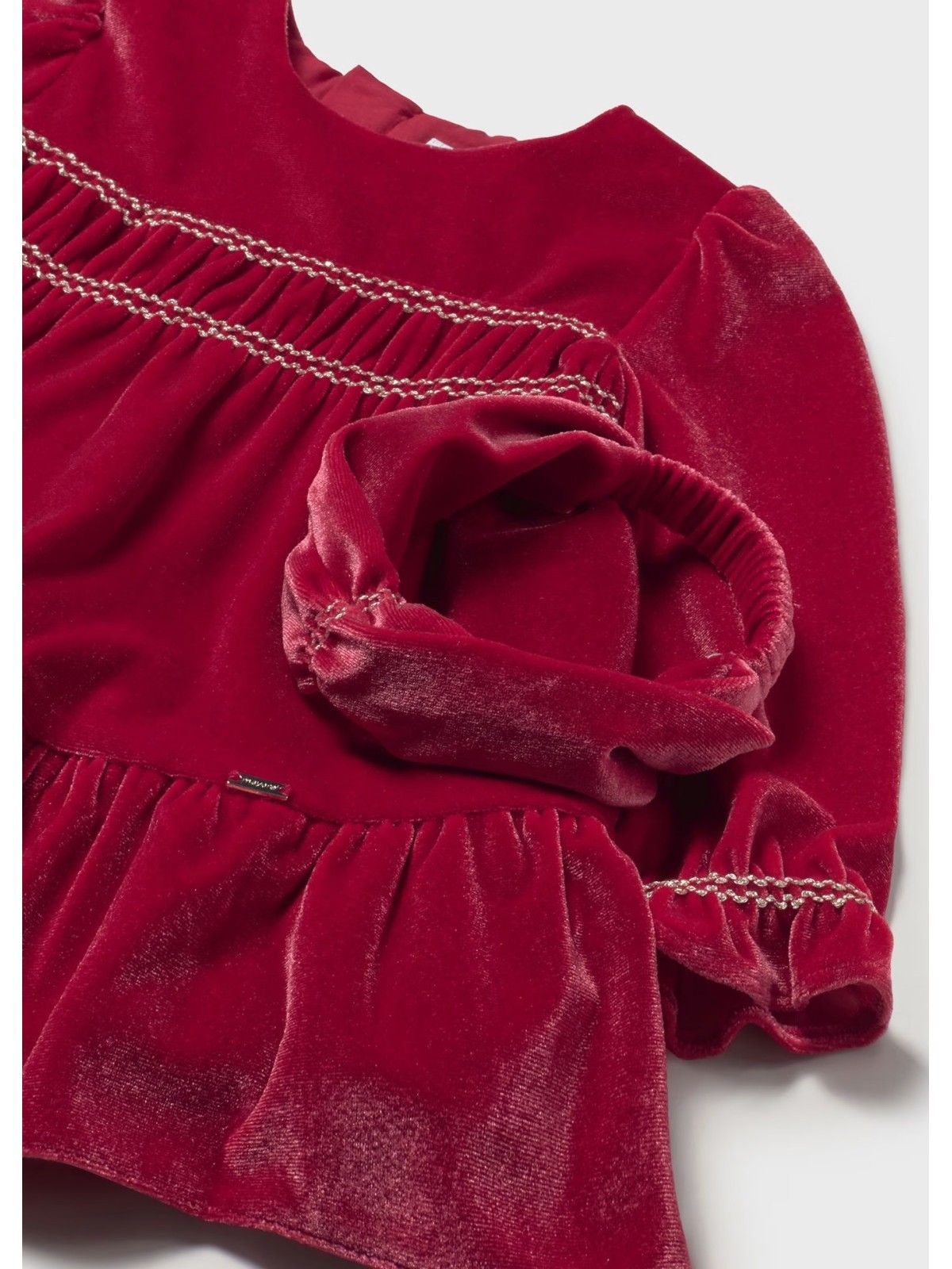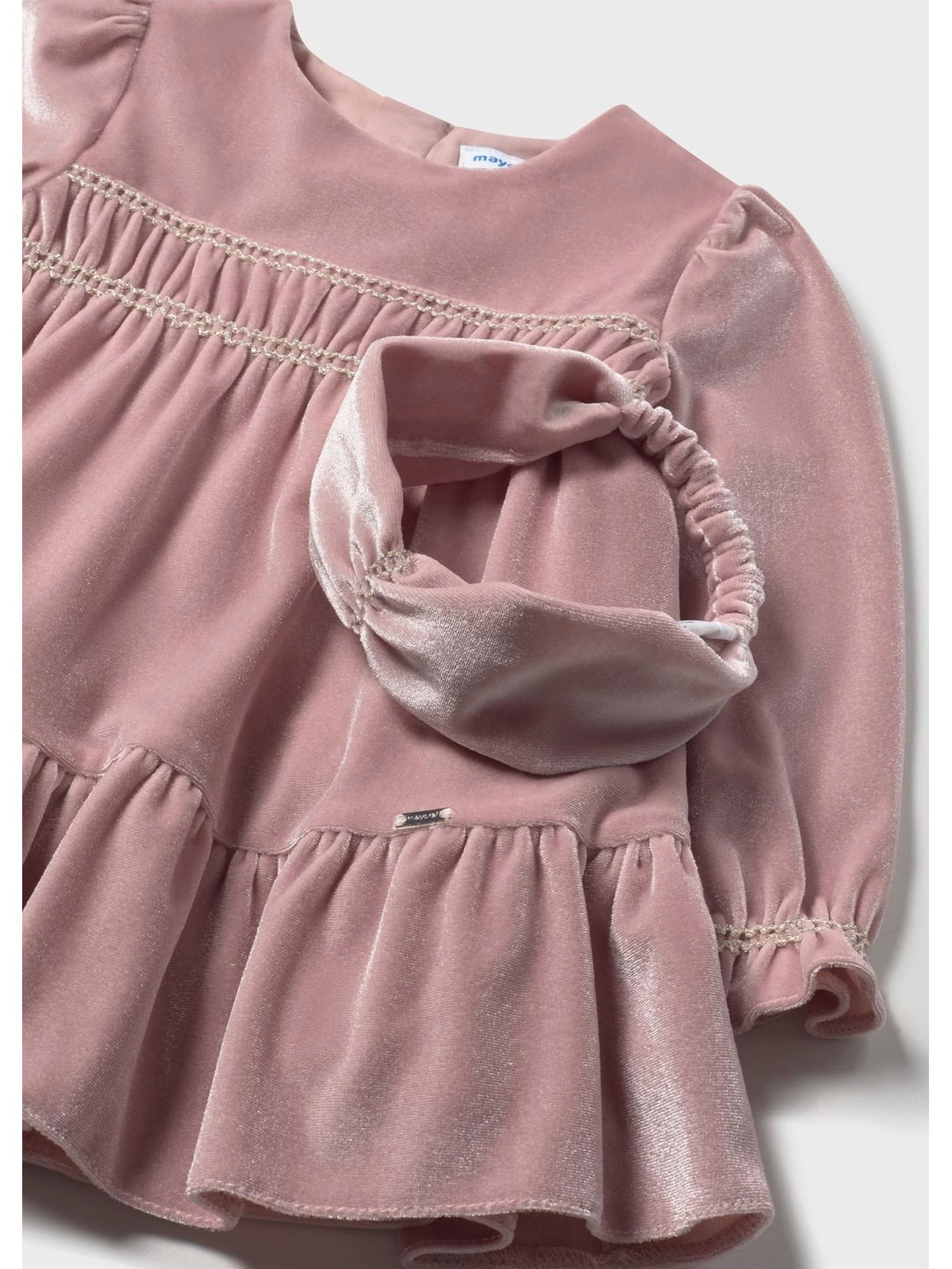 Vestito abbinato a un delizioso cerchietto per bebé. Vestito manica lunga per bebé con volant sul bordo della manica. Chiusura centrale posteriore con cerniera nascosta. Confezione in velluto elegante e classico. Questo modello presenta dettagli nido d'ape. Modello con riccio e volant.