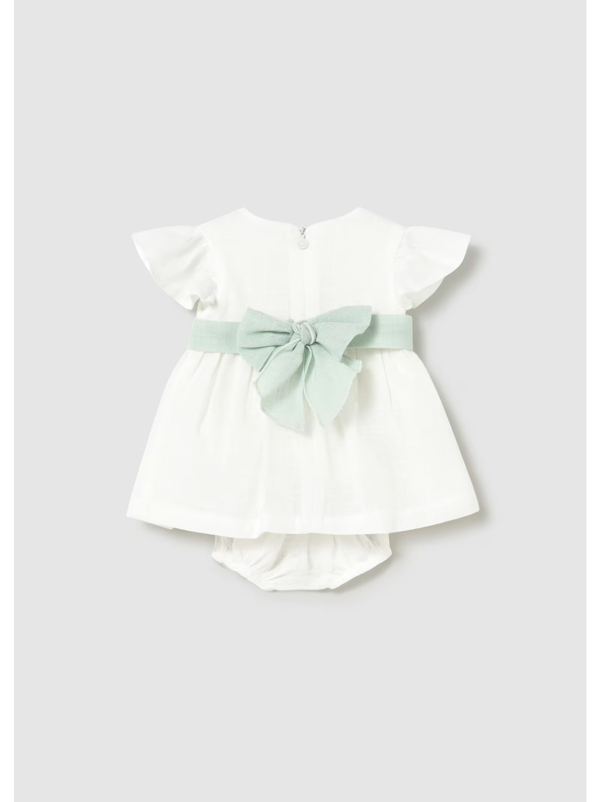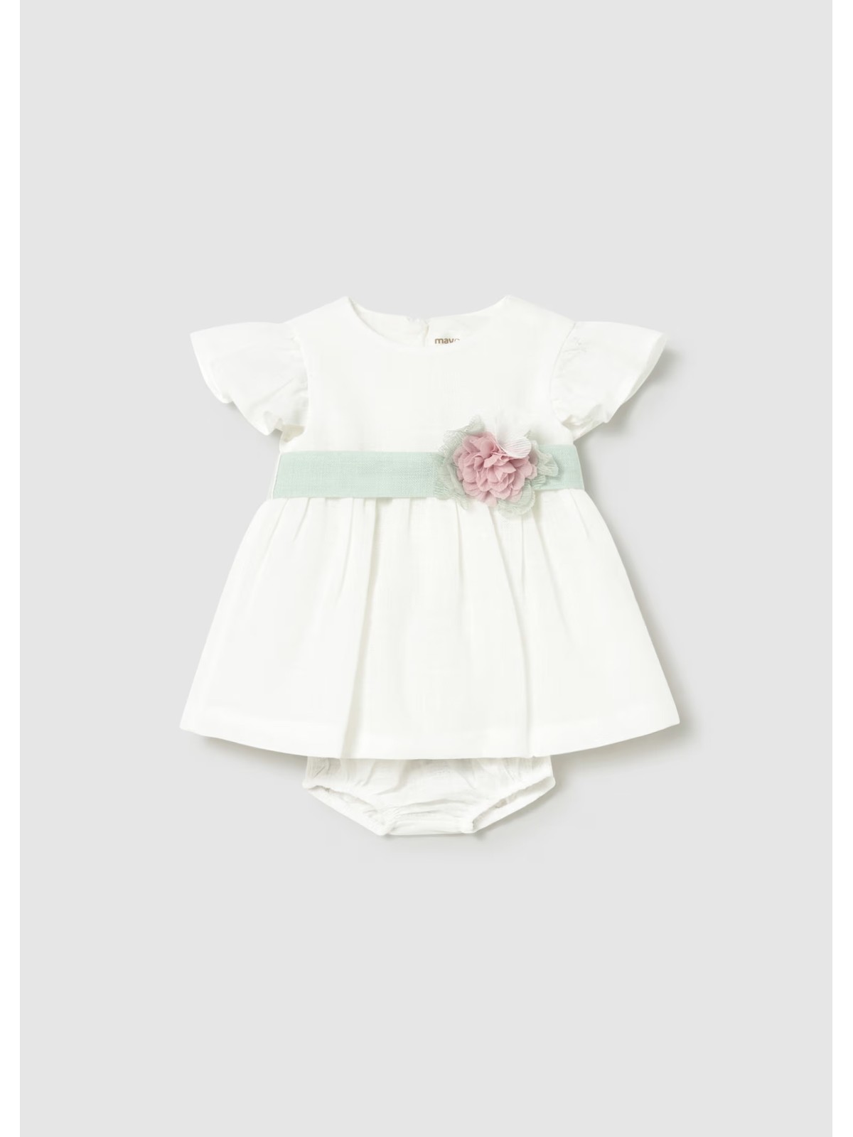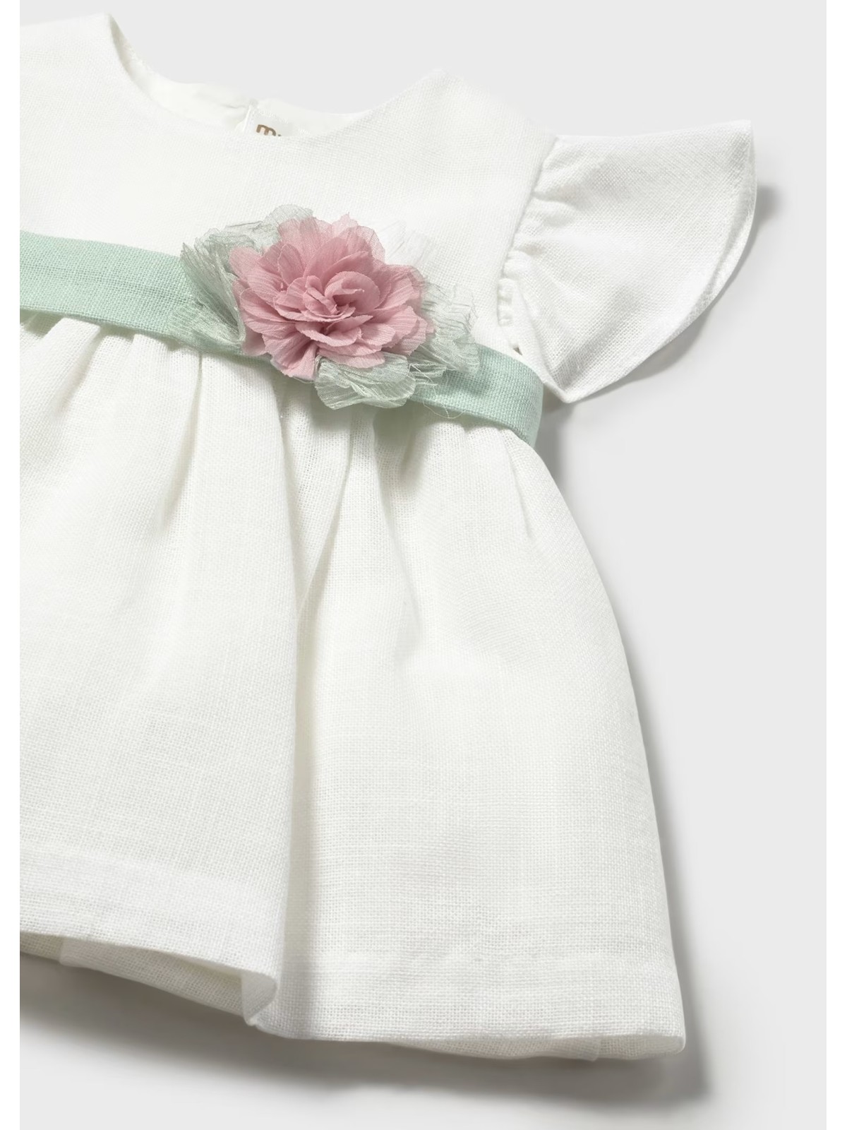 Abito mezzamanica da battesimo girocollo i tinta unita. Applicazioni dI cintura e fiocchi , chiusura sul retro con bottoni.Coulotte abbinata