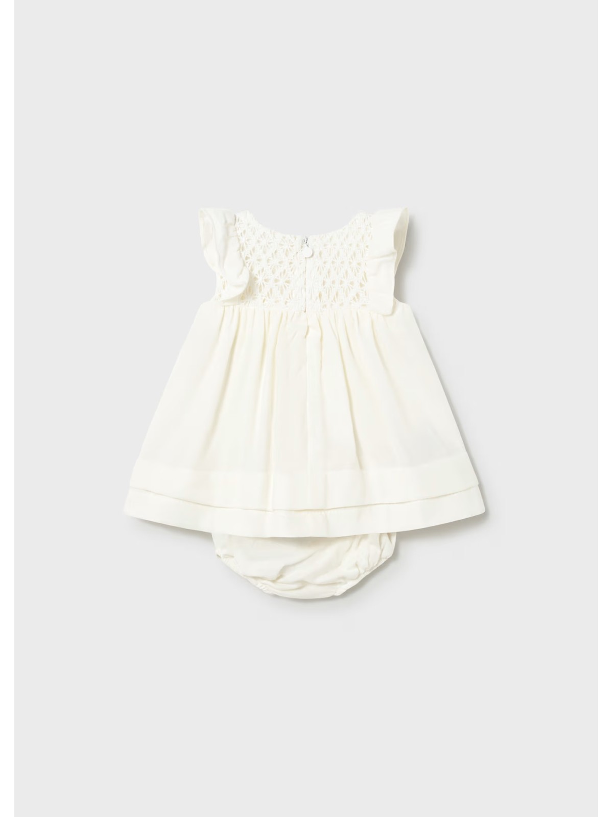 Vestito per neonata con lavorazione sul davanti effetto uncinetto , apertura con bottoni sul retro.Colulotte abbinata.