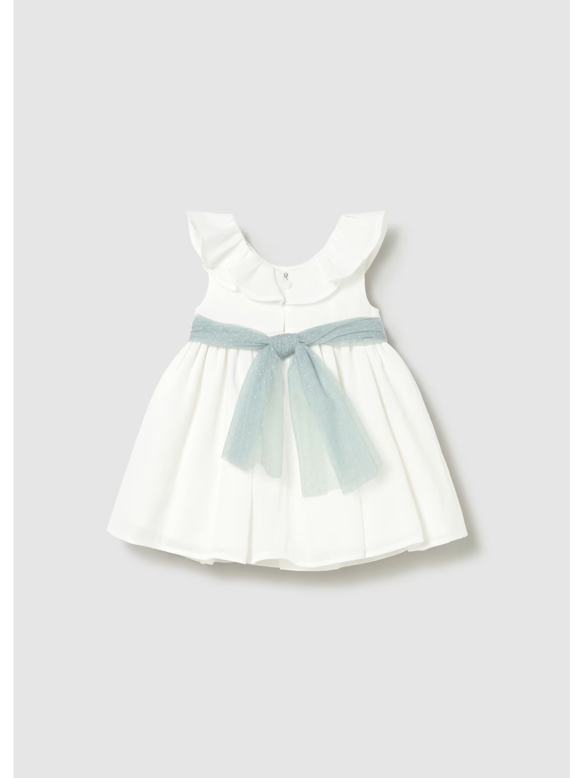 Vestito neonata tinta unita manica aletta , con fusciacca e fiori , apertura sul retro con zip.