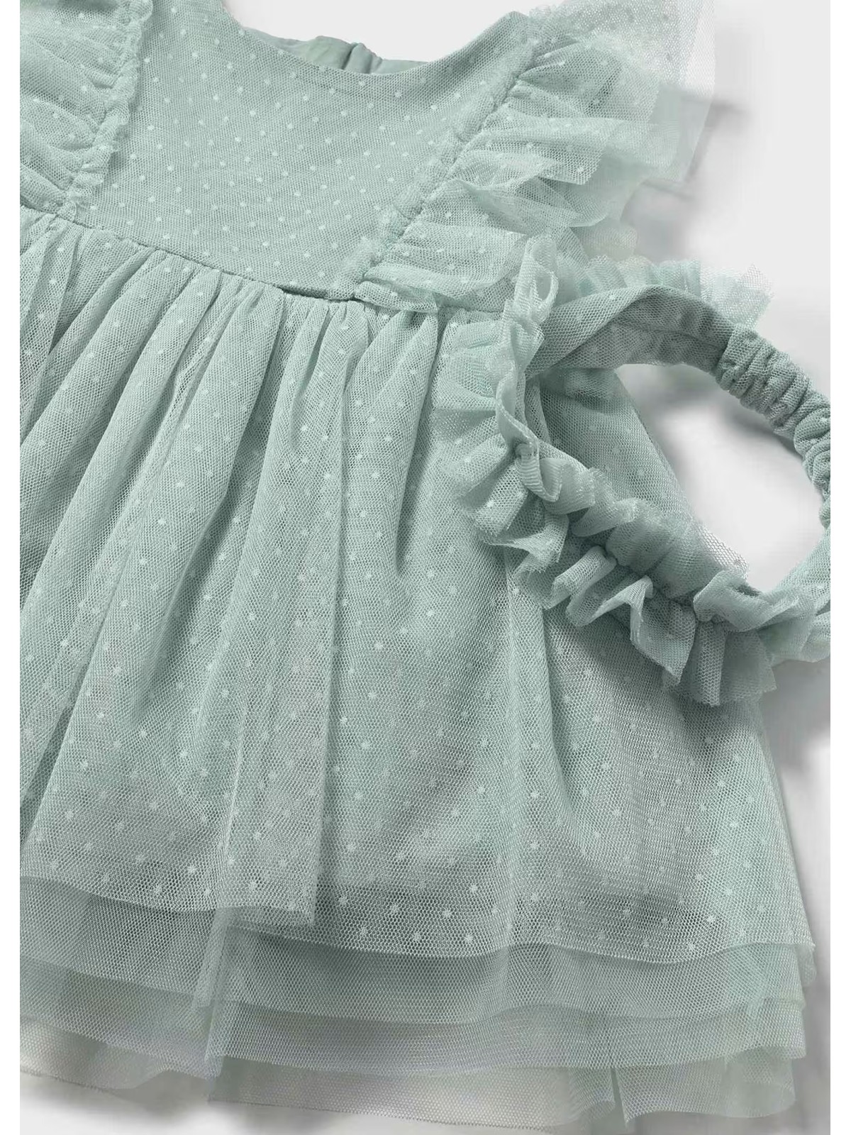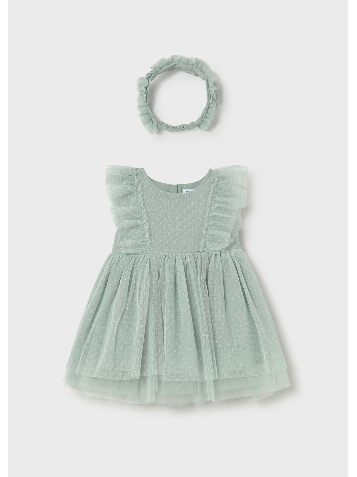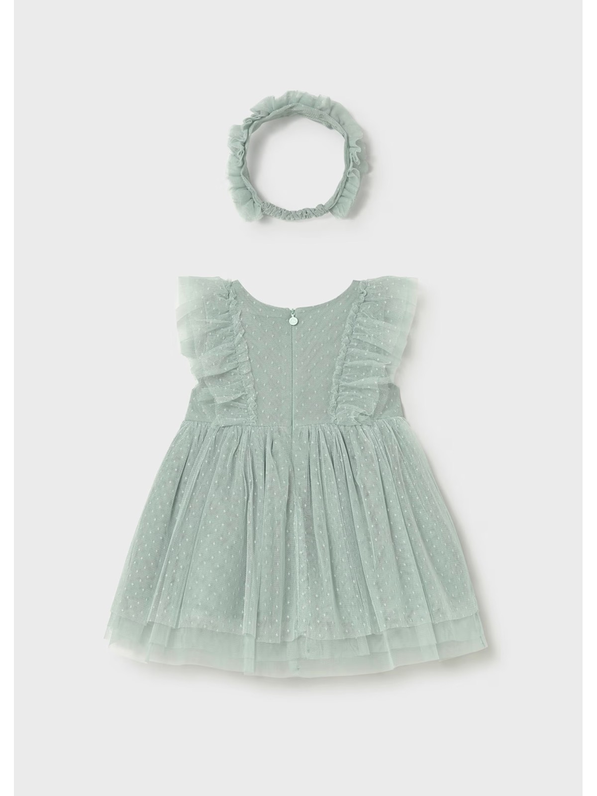 Vestito abbinato a una deliziosa fascia per capelli . Vestito mezza manica per bebé. Apertura posteriore con cerniera invisibile. Confezione in tulle leggero e vaporoso. Fascia da cerimonia per bebé, ideale come accessorio per le occasioni
