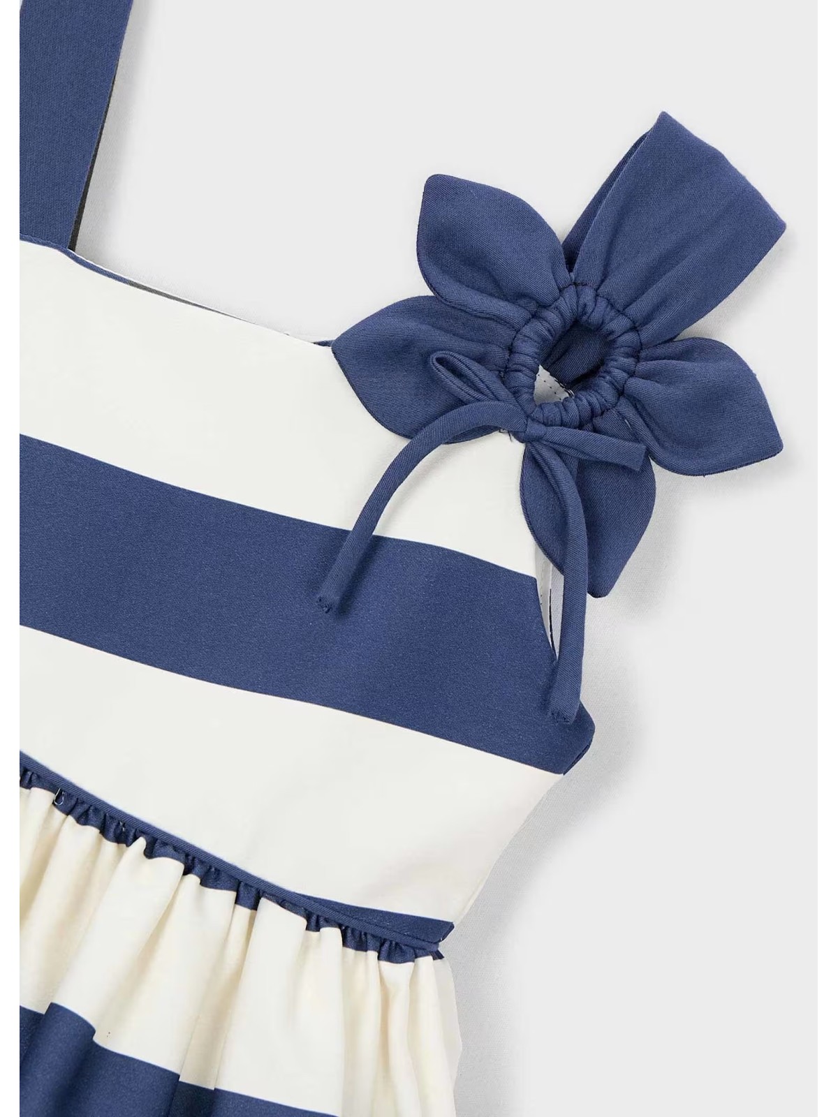 Delizioso abito per bambina dal design elegante e fresco, perfetto per occasioni speciali e giornate estive. Modello asimmentrico epresenta una raffinata fantasia a righe blu e bianche che dona un look classico e senza tempo. Il corpetto è impreziosito da una spallina singola decorata con un fiore in tessuto, dettaglio romantico che rende l’abito ancora più speciale. La gonna ampia garantisce comfort e libertà di movimento, creando un effetto voluminoso e molto elegante.