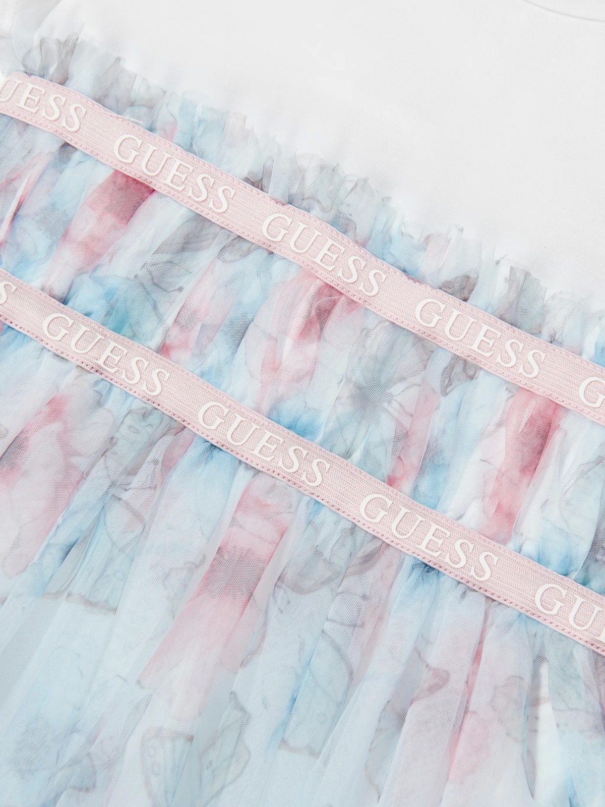 Guess vestito per bambina . Modello Flared realizzato in una combinazione di due materiali diversi. Parte superiore in jersey elastico, e sotto in tulle. Il modello viene fornito con coulotte fino a 24 mesi