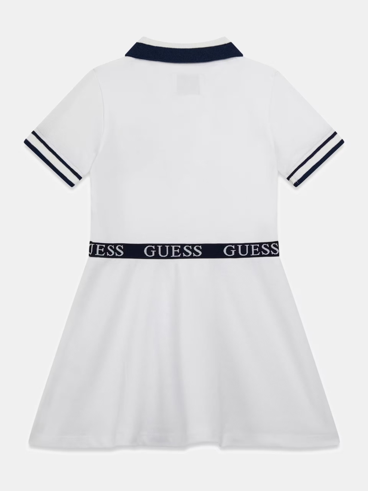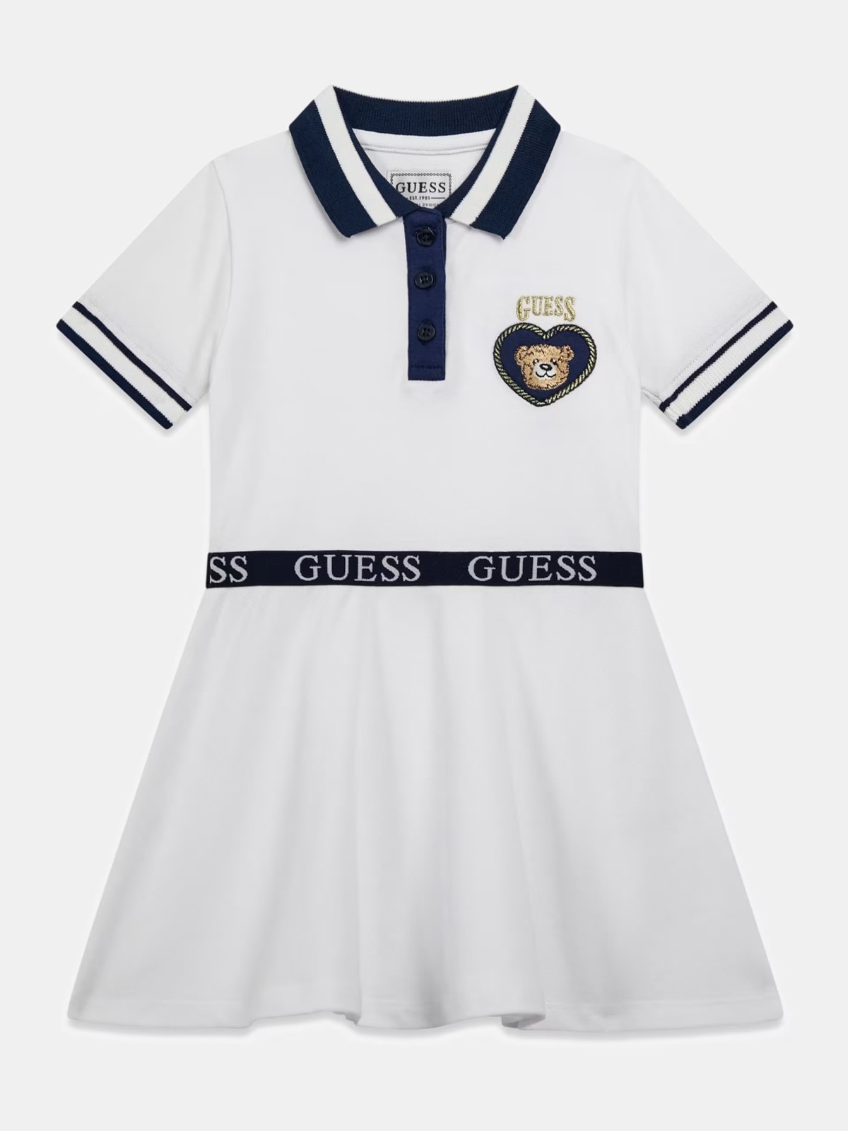 Vestito bambina Guess con logo ricamato in petto, mezze maniche collo a polo e chiusura con bottoni. Realizzato in piquet di cotone.