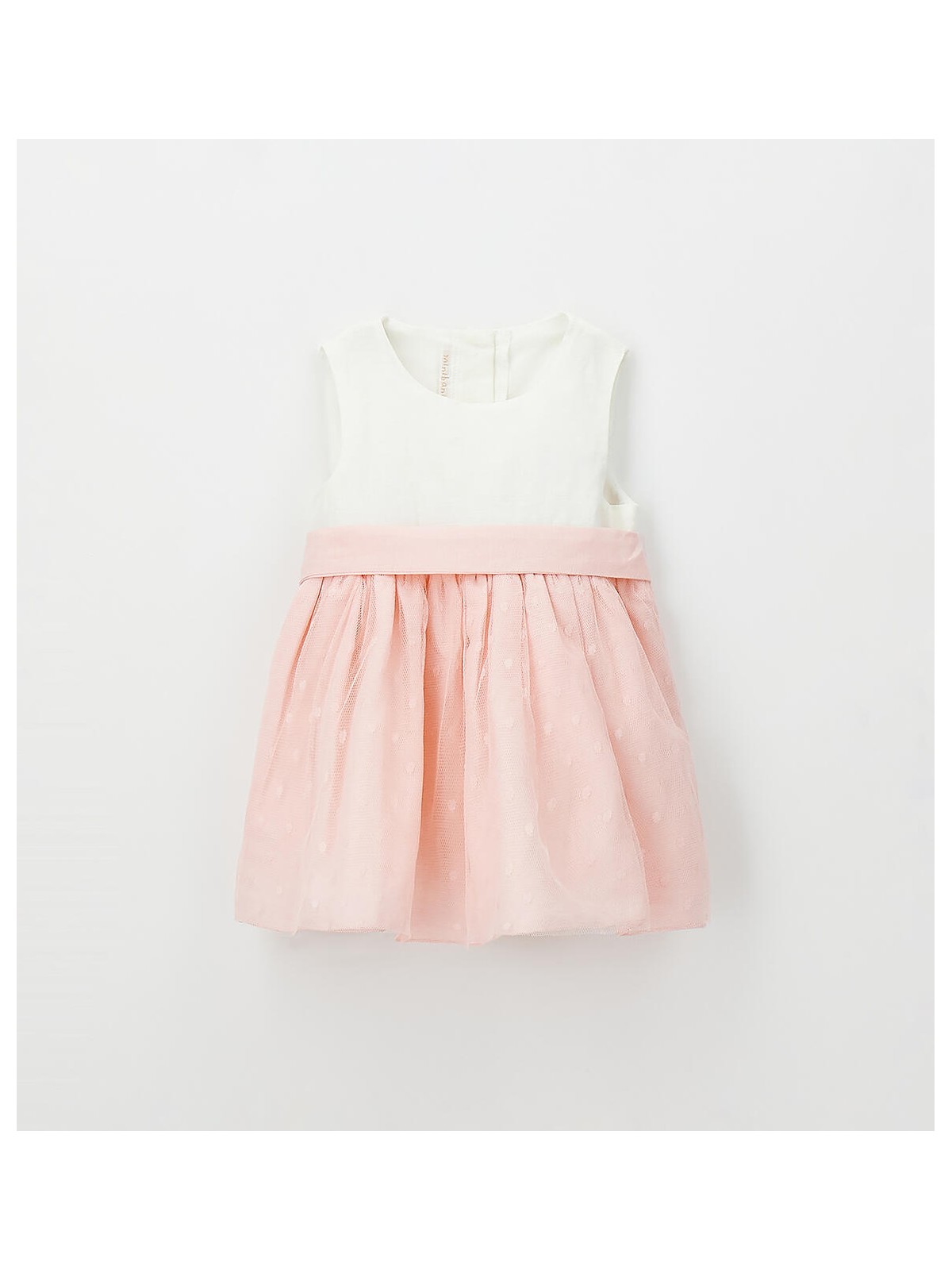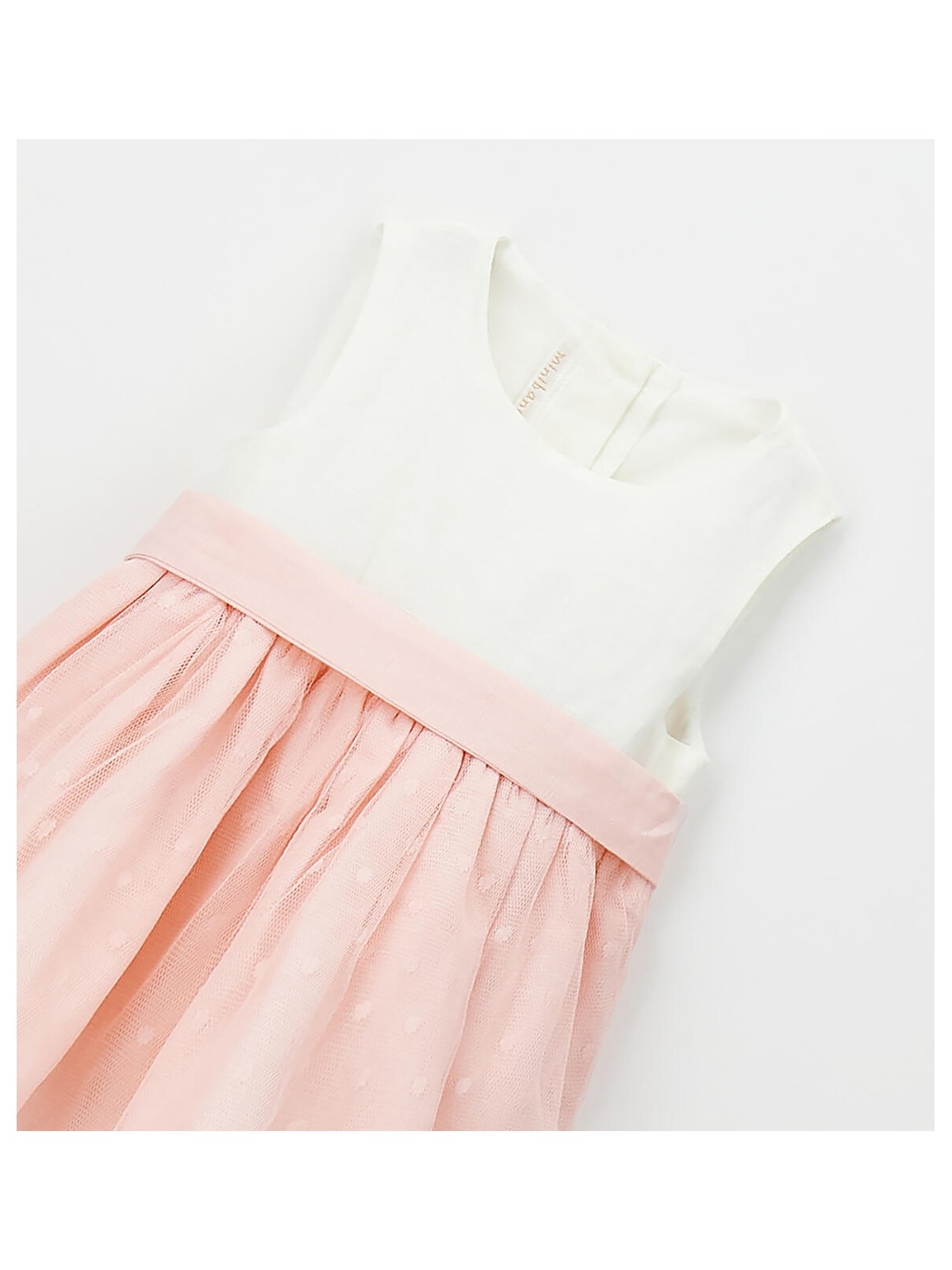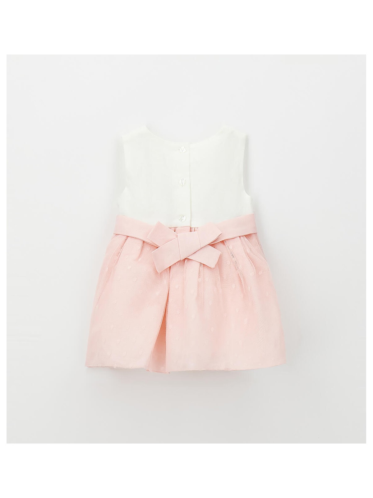 Abito giromanica elegante per neonata Minibanda realizzato in lino e cotone con gonna in tulle ricamata a pois. Fodera in cotone. Lunghezza al ginocchio. Apertura dietro con bottoni e cintura in vita