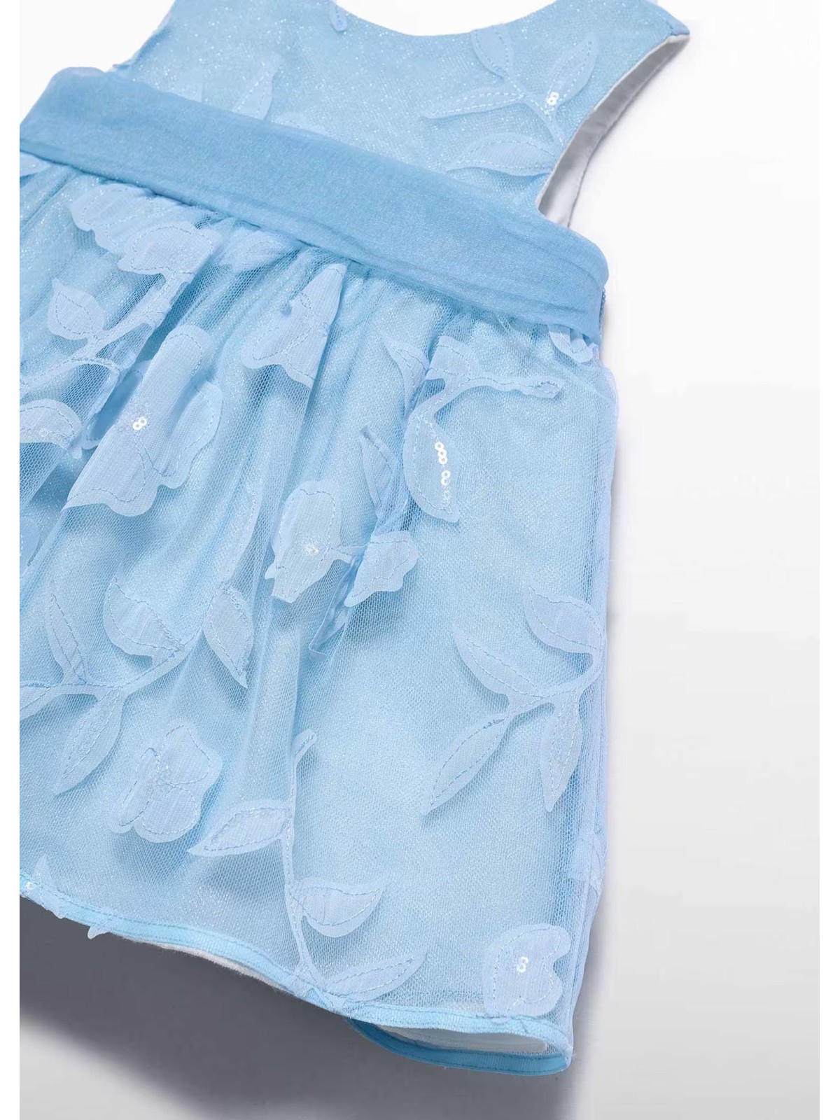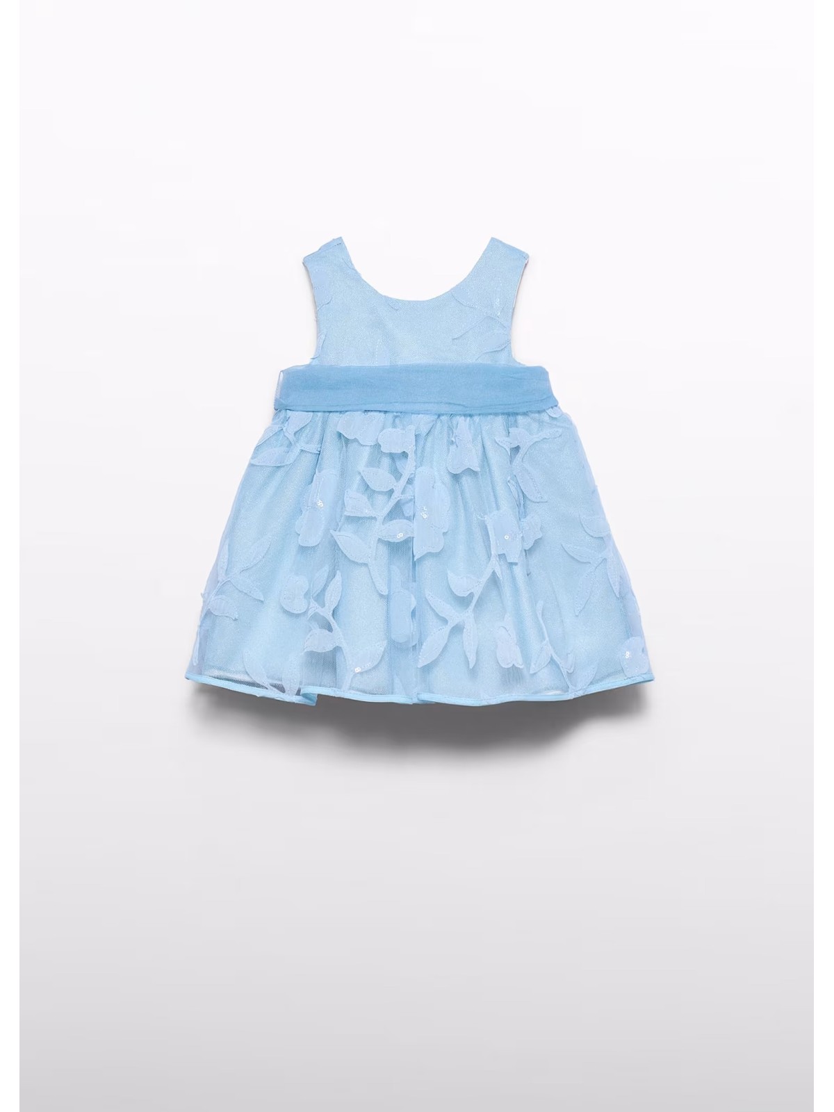 Vestito giromanica per neonata. Chiusura con cerniera nella parte posteriore per un vestibilità rapida e comoda. Fiori traforati neonata e fusciacca in vita.