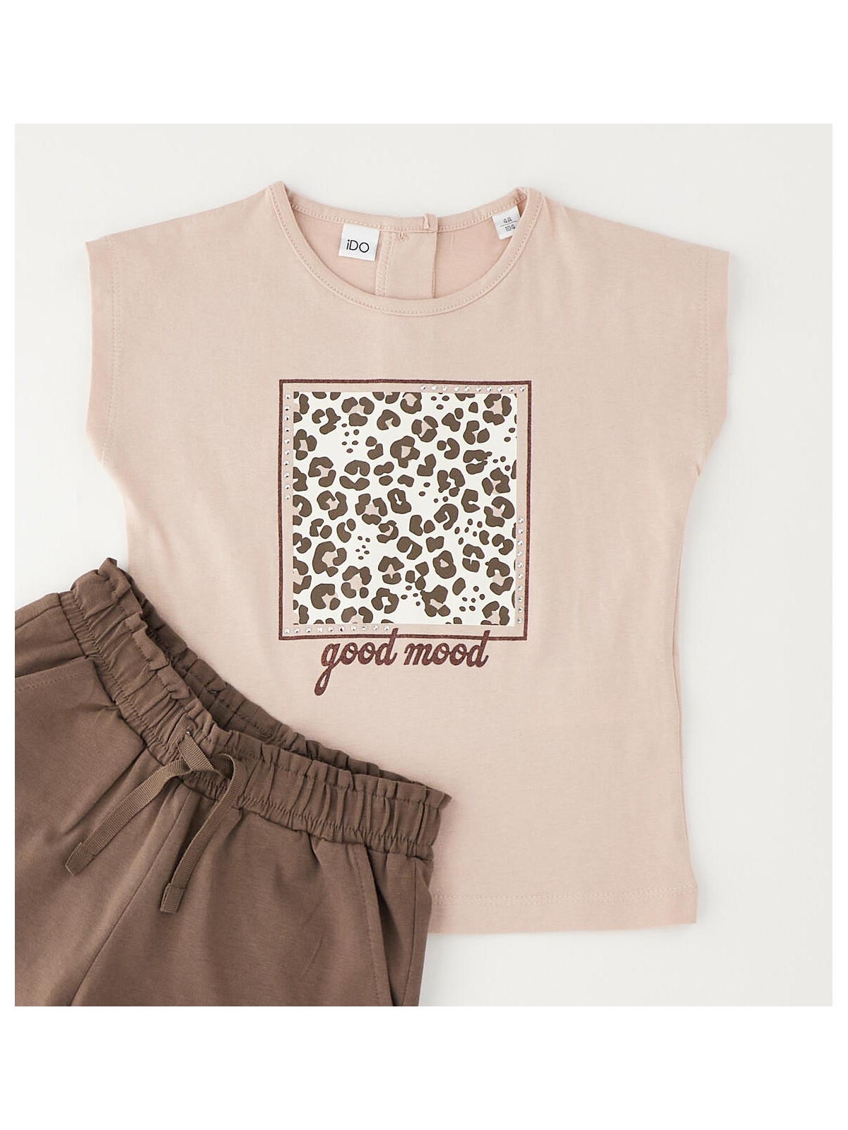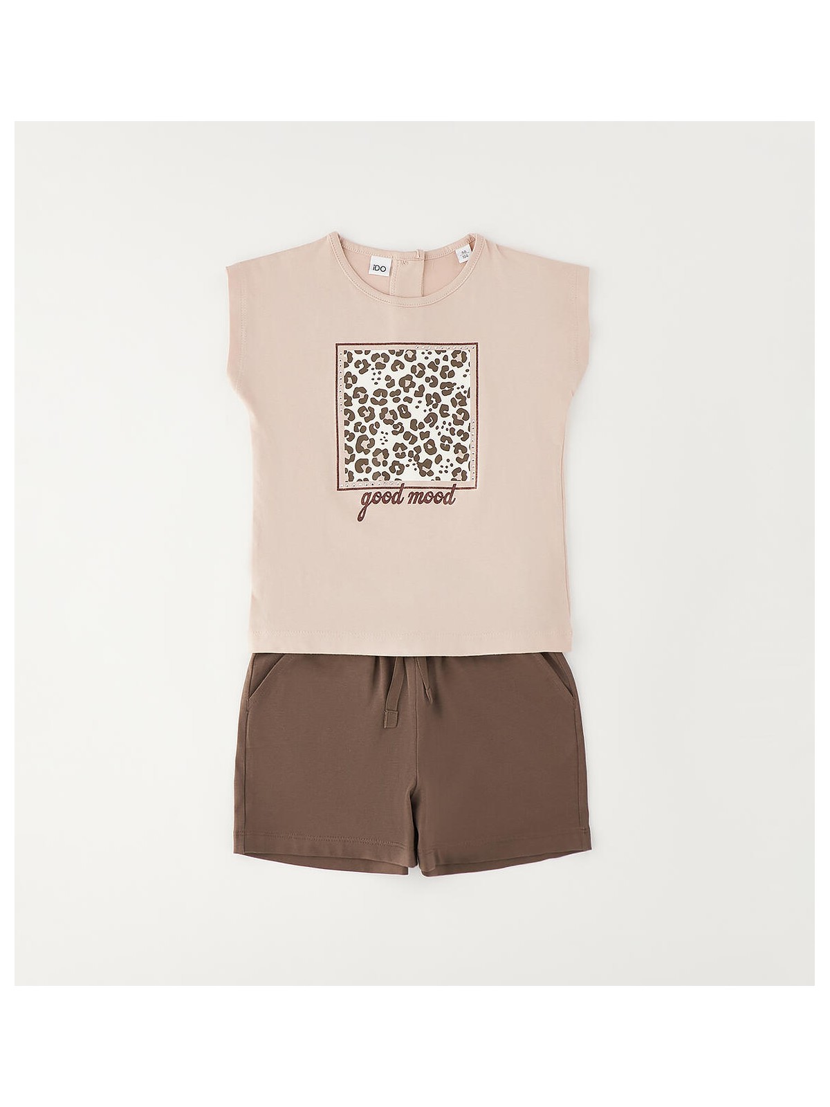 Completo manica corta per bambina iDO realizzato in jersey di cotone. T-shirt con stampa animalier, pantaloncino corto con elastico in vita e coulisse