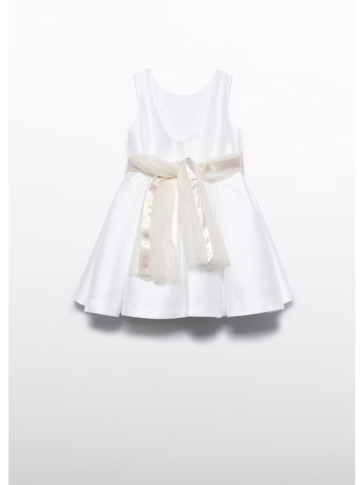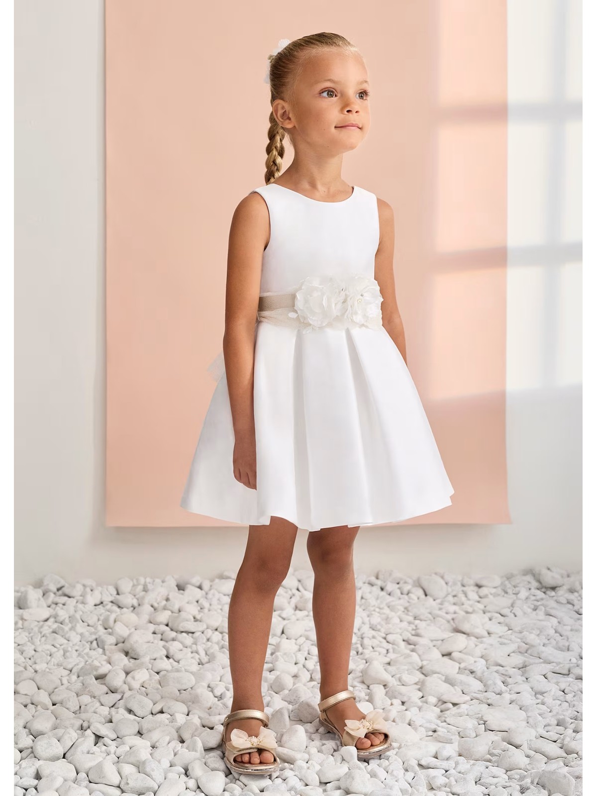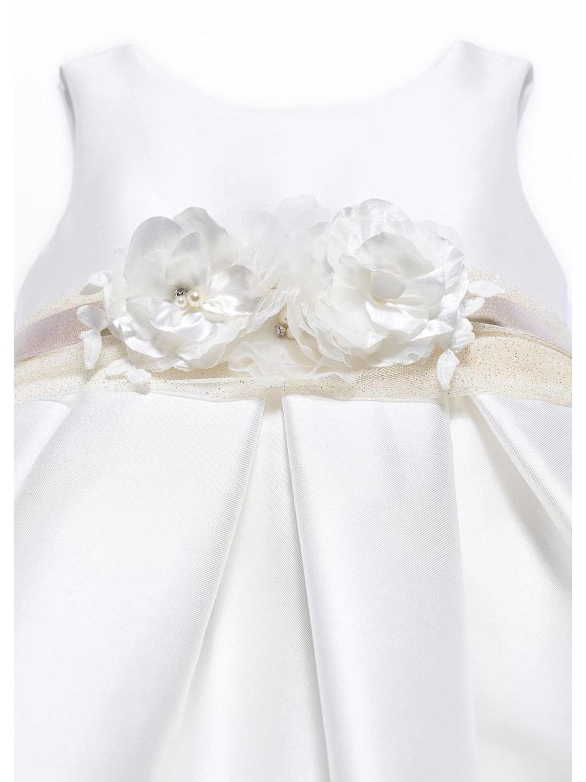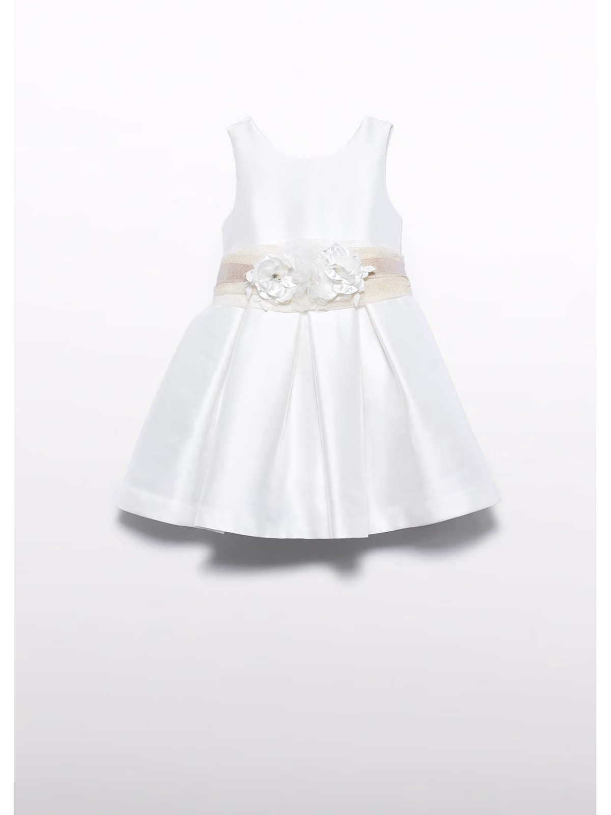 Bellissimo abito giromanica, in mikado per bambina. Scollo posteriore e chiusura con zip invisibile. Fascia in vita e fiori applicati nella parte anteriore.