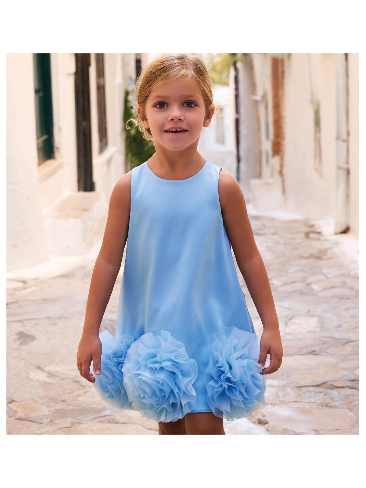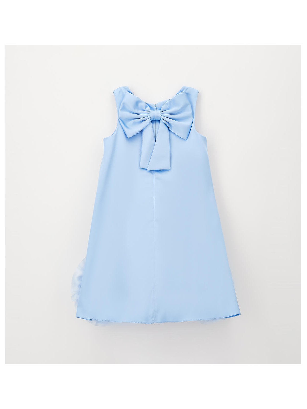 Abito elegante per ragazza Sarabanda realizzato in satin con applicazione sul fondo in organza. Inserto in tulle nel sotto gonna. Fodera in cotone. Apertura dietro con zip invisibile e fiocco dietro. Lunghezza sopra al ginocchio.