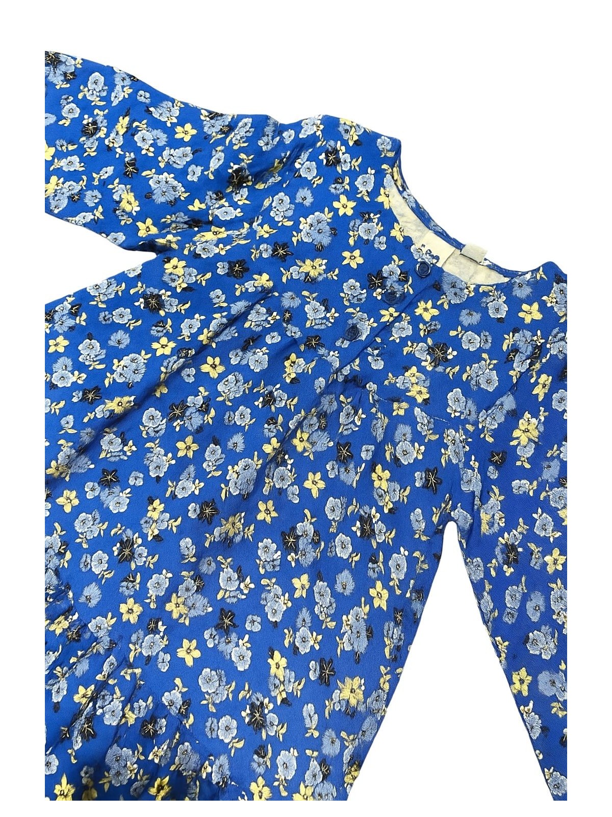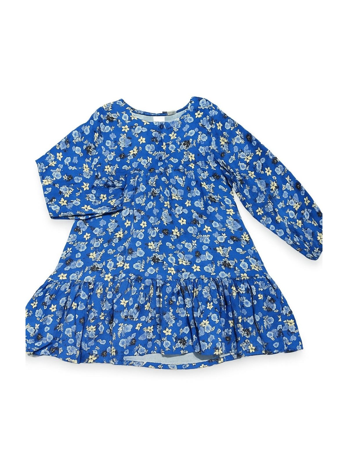 Abito per bambina iDO, a maniche lunghe, realizzato in twill viscosa dalla fantasia floreale. Fodera in cotone. Balza arricciata sul fondo e apertura davanti con bottoni. Lunghezza al ginocchio