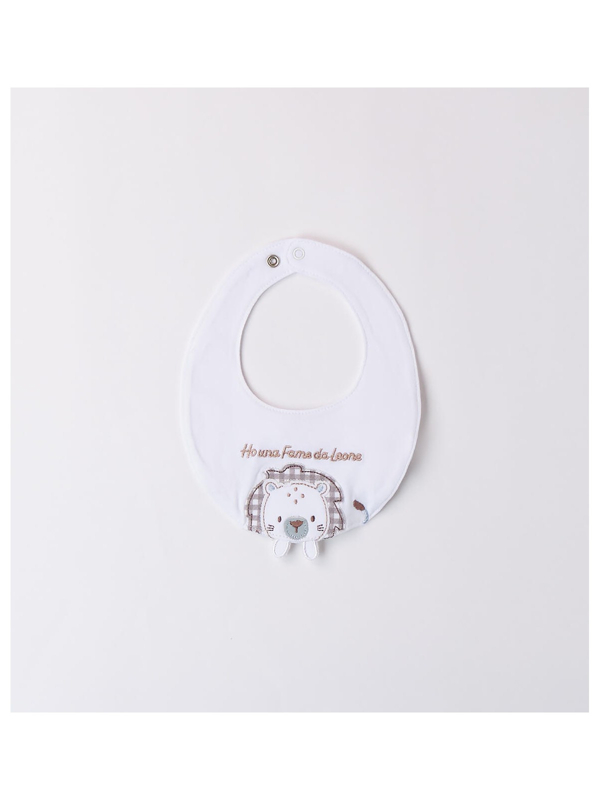 Bavaglio per neonato realizzato in jersey stretch di cotone con applicazione ricamo leone. Chiusura con bottone a pressione.