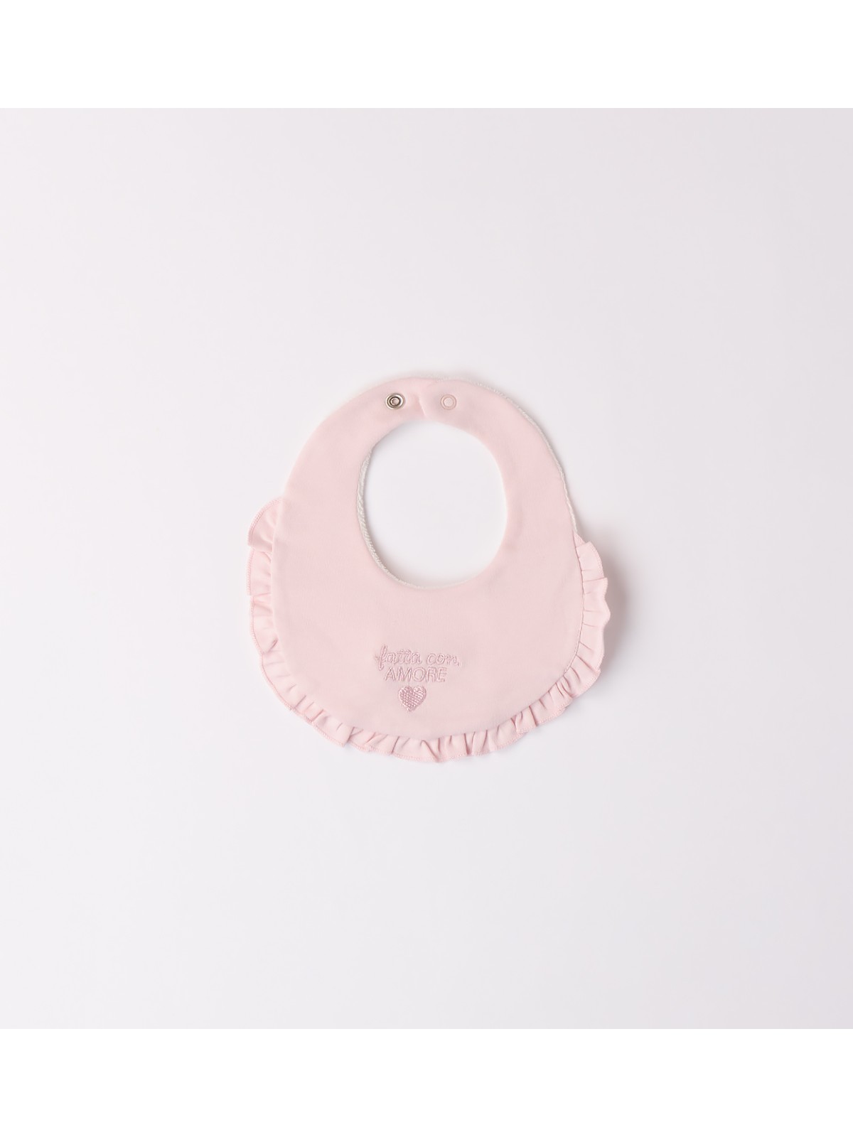 Bavetta neonata realizzato in jersey stretch di cotone, apertura con bottone a pressione e ruches in arricchimento. Ricamo frontale