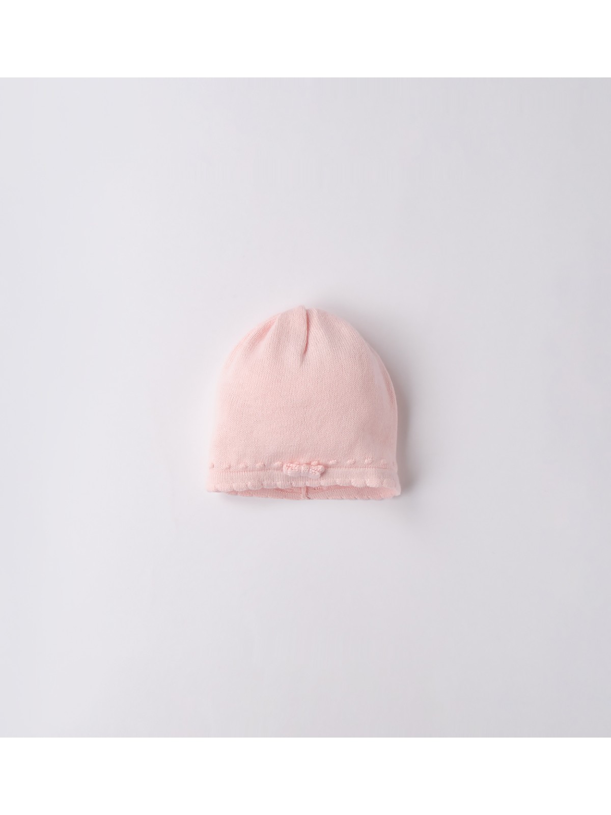 Cappellino per neonato realizzato in lana e cotone. Modello cuffia con fantasia tinta unita, con applicazione fiocco centrale.