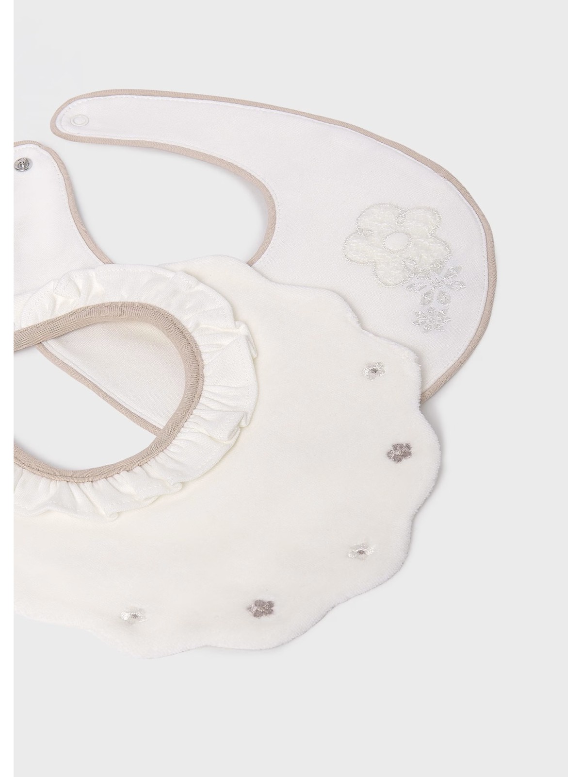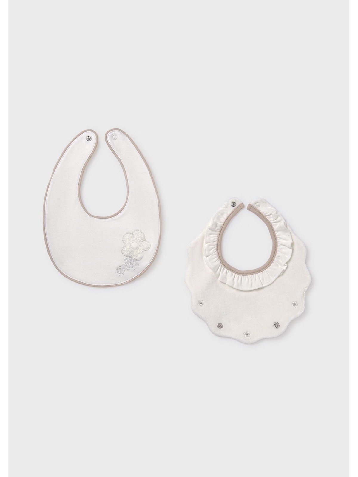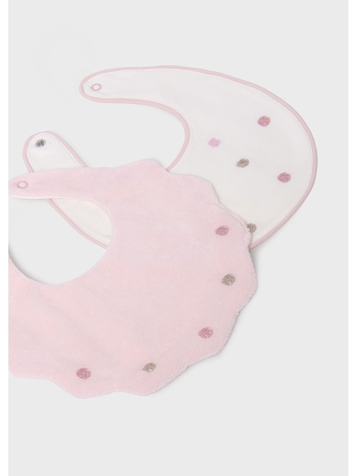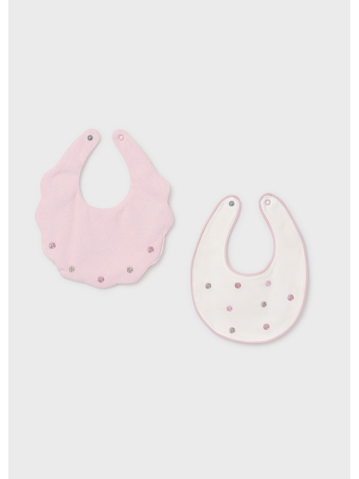 Dolce e comodo bavaglino bebé, quattro varianti disponibili. Bottone a pressione sul colletto per facilitare la vestibilità del capo. Elementi decorativi: ricam