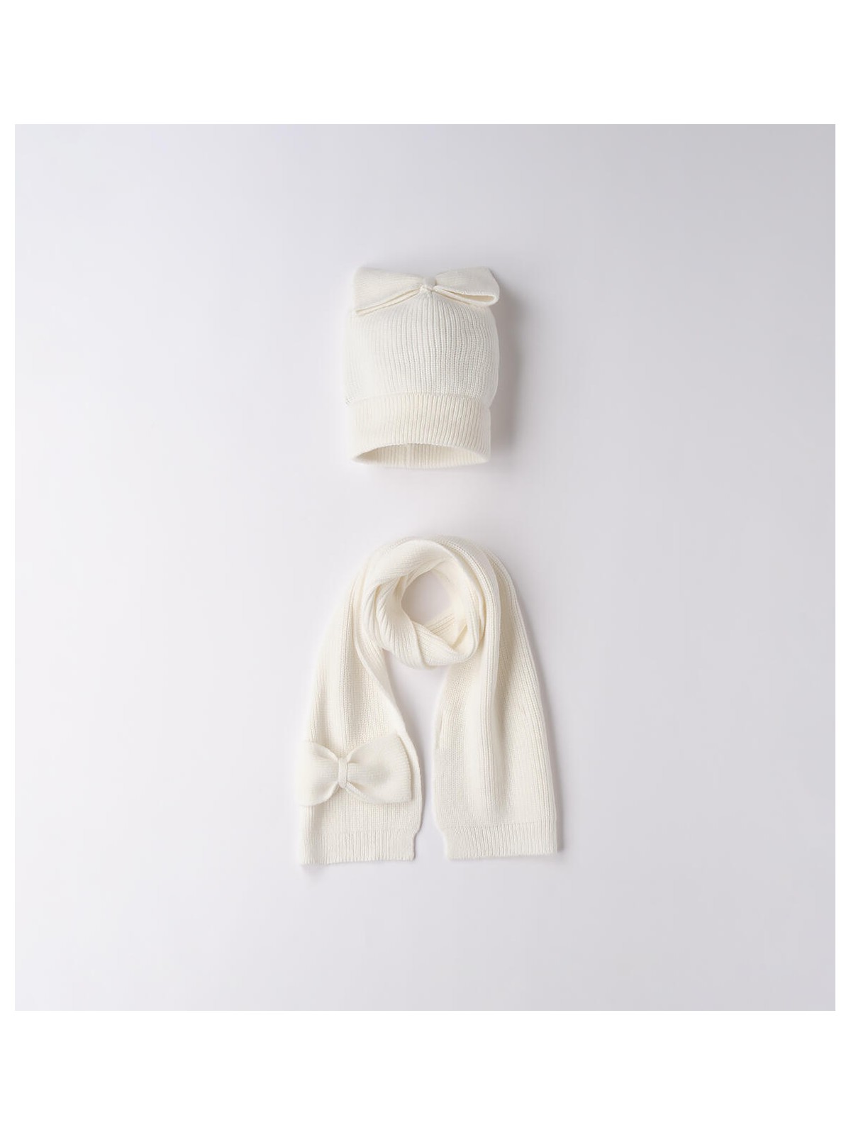 Kit per bambina Sarabanda composto da cappello e sciarpa realizzati in morbido tricot e impreziositi da fiocco