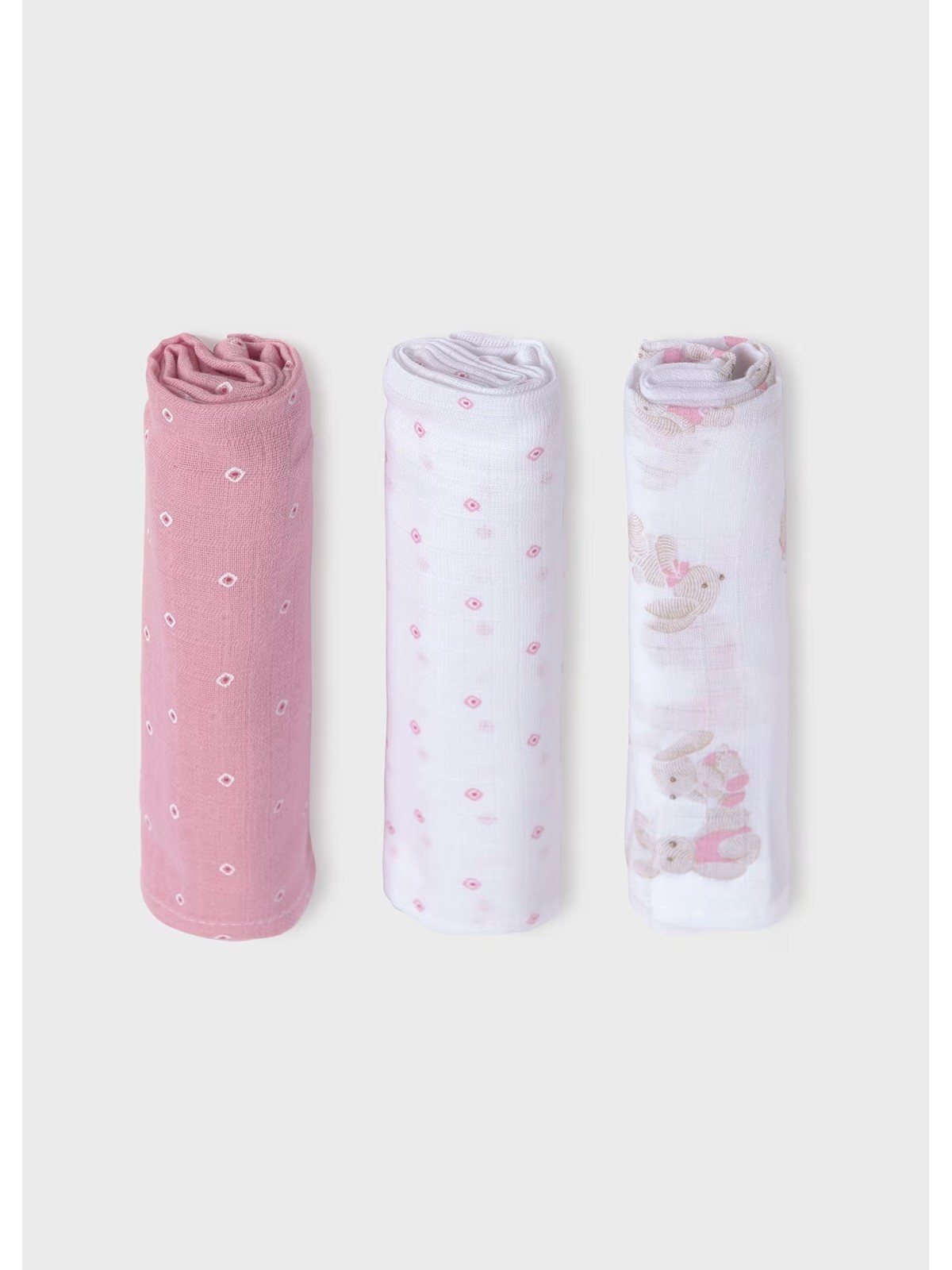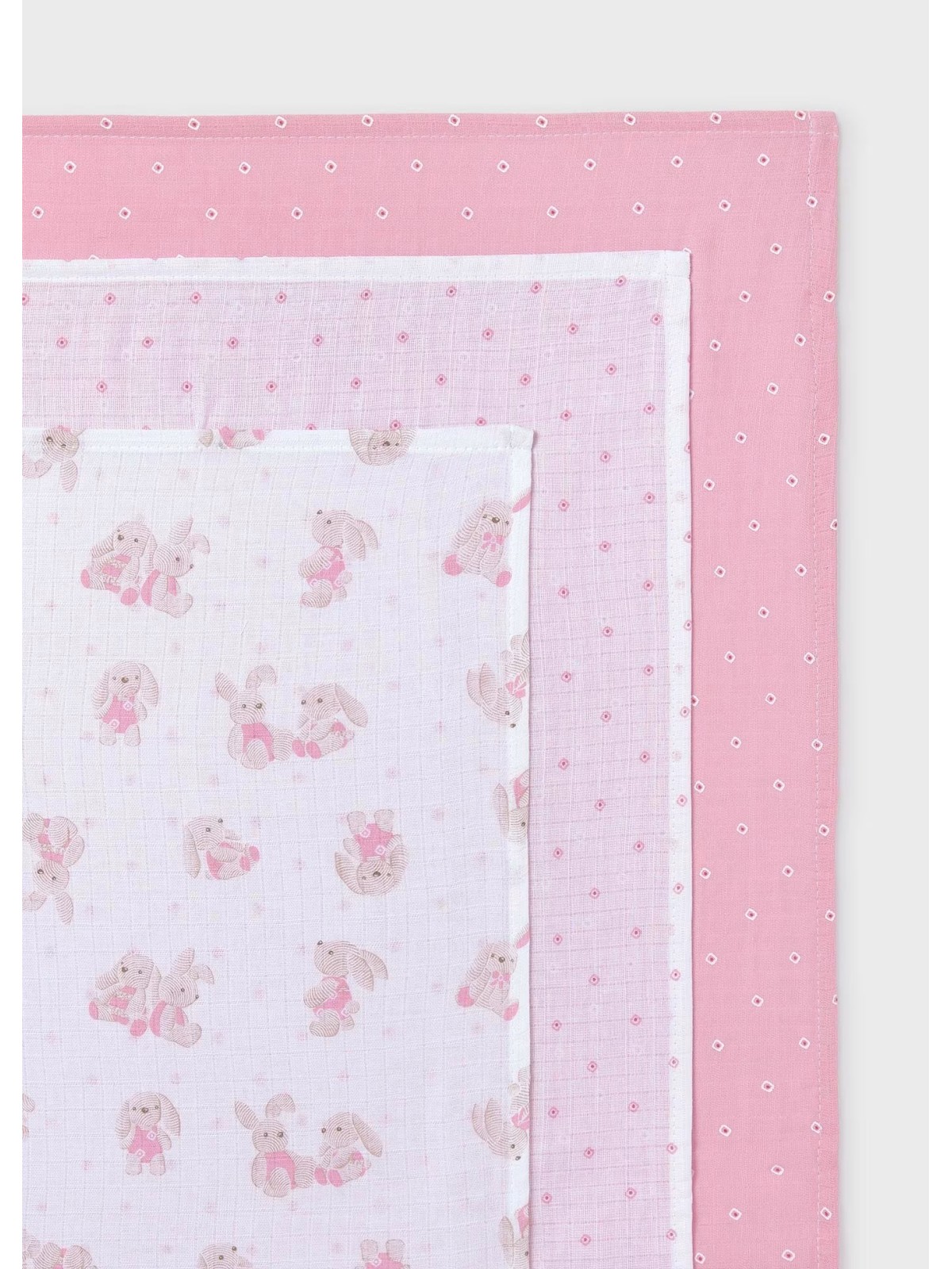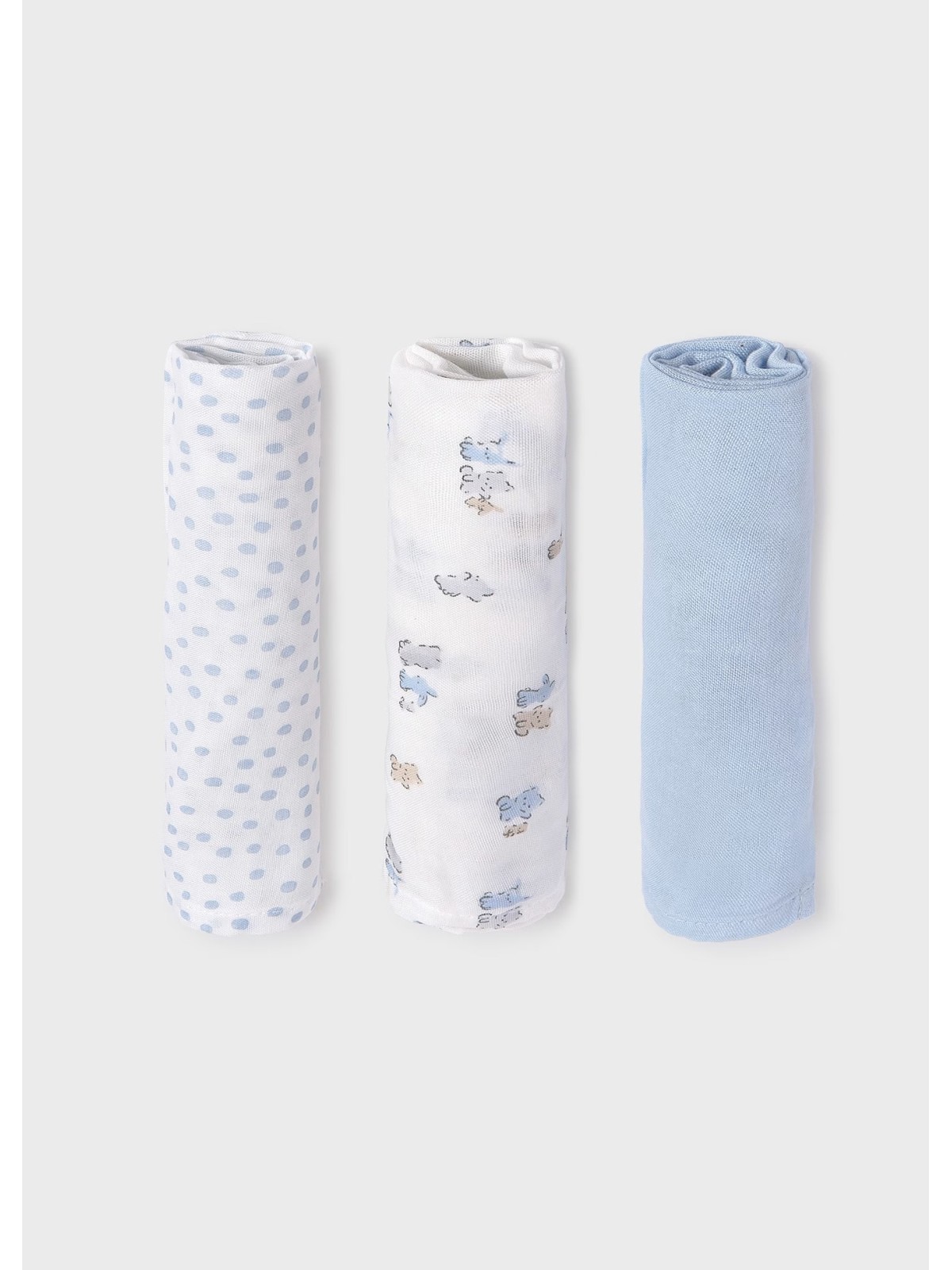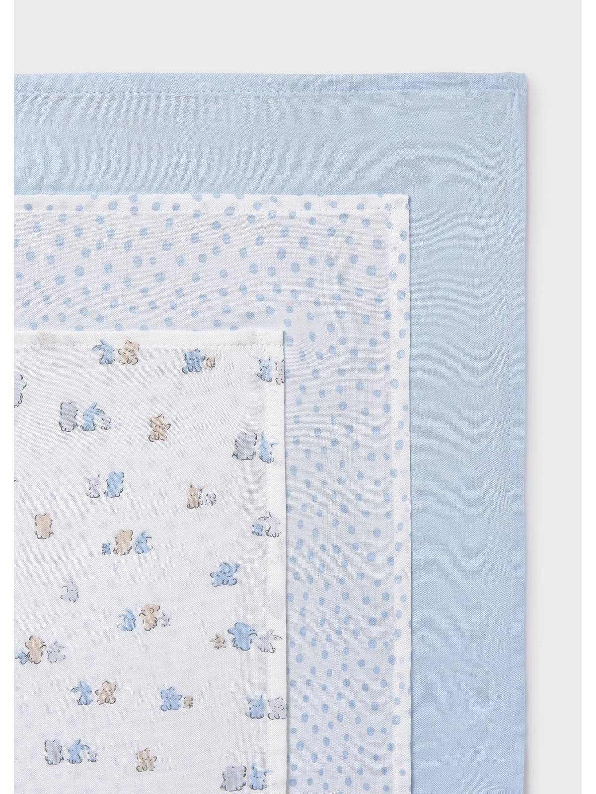 Originale completo per neonato tre pezzi. Tessuto 100% cotone. Set di tre quadrati in garza utili per la cura del tuo/a piccolo/a. Design stampato. Questo articolo è spedito all'interno di una confezione della linea Newborn, ideale come regalo.