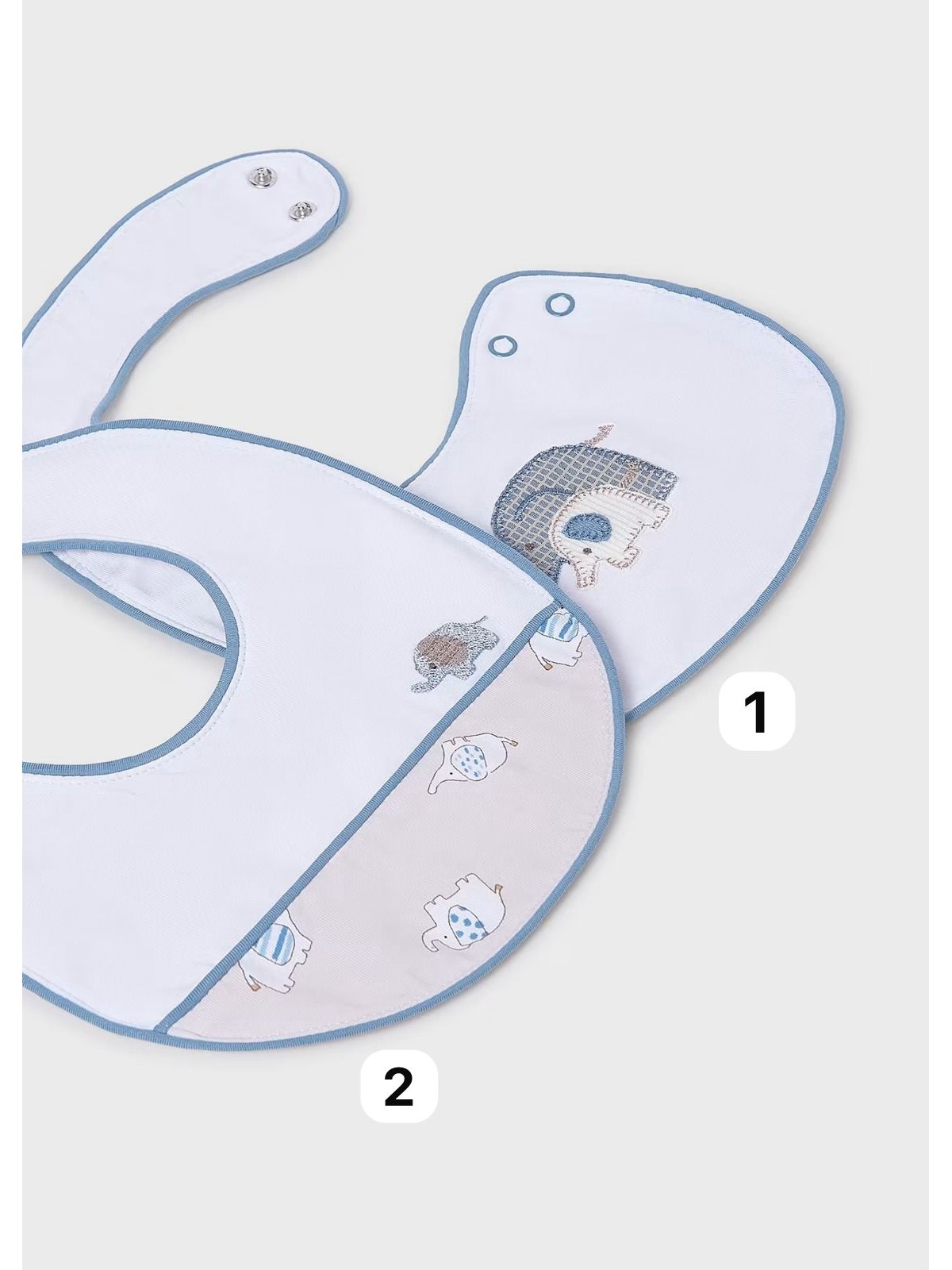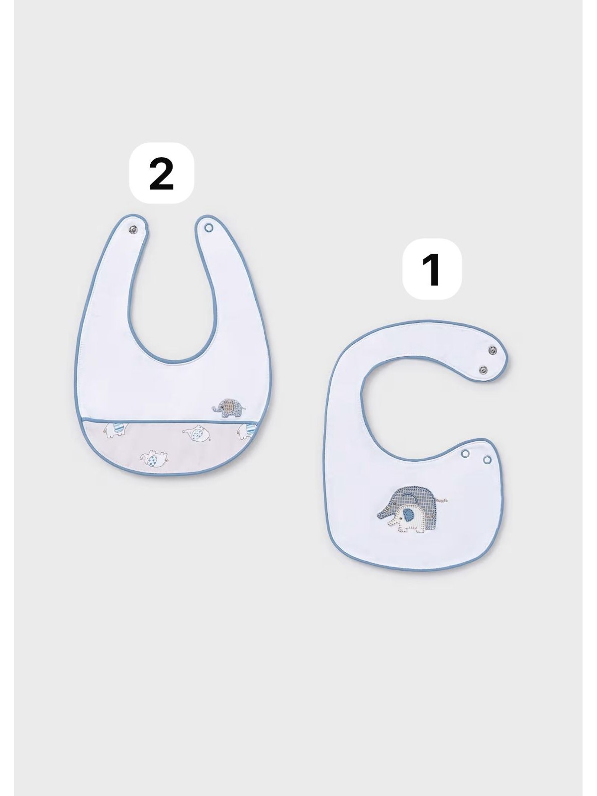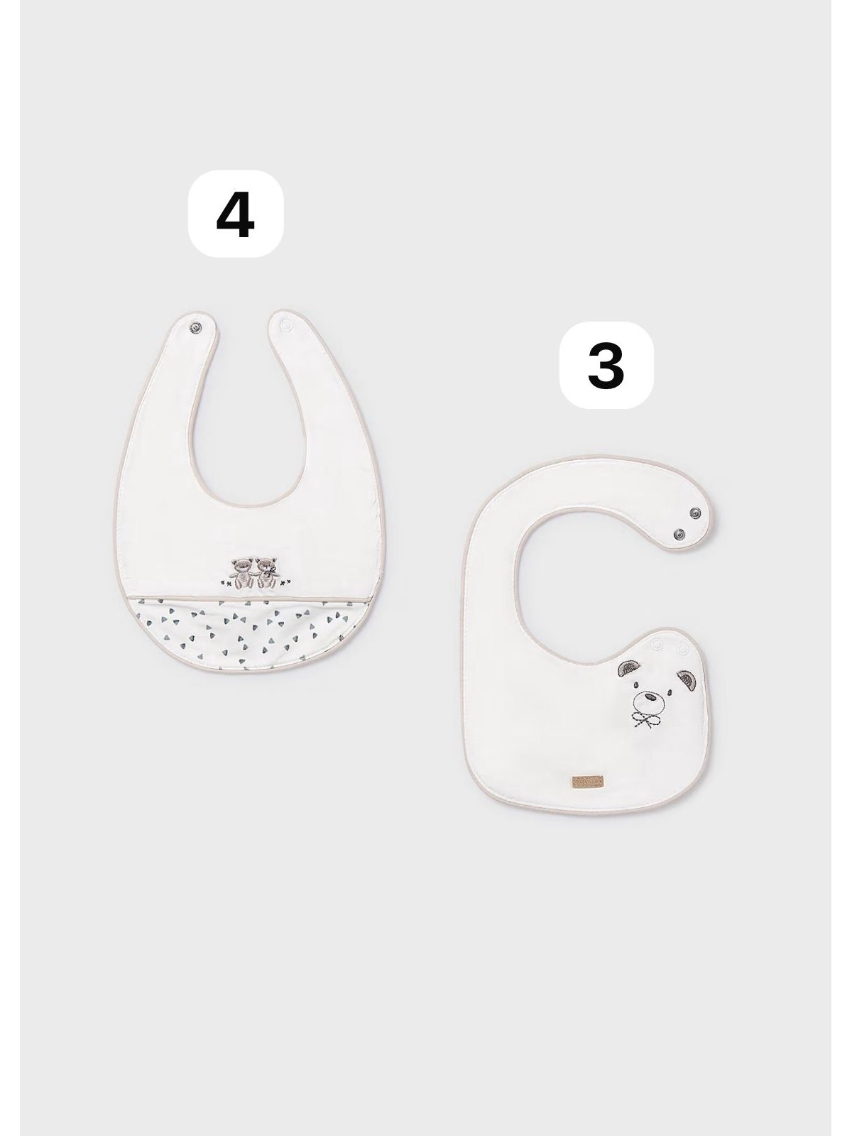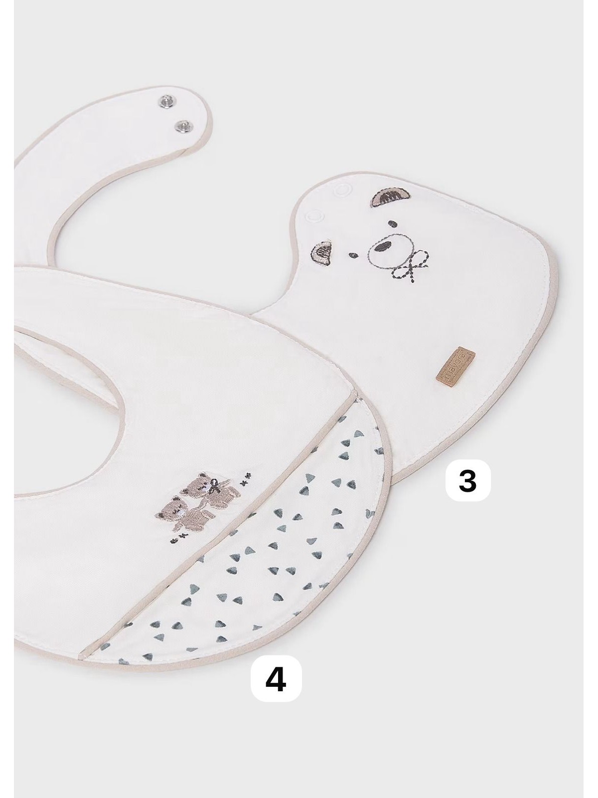 Dolce e comodo bavaglino bebé, quattro varianti disponibili. Bottone a pressione sul colletto per facilitare la vestibilità del capo.