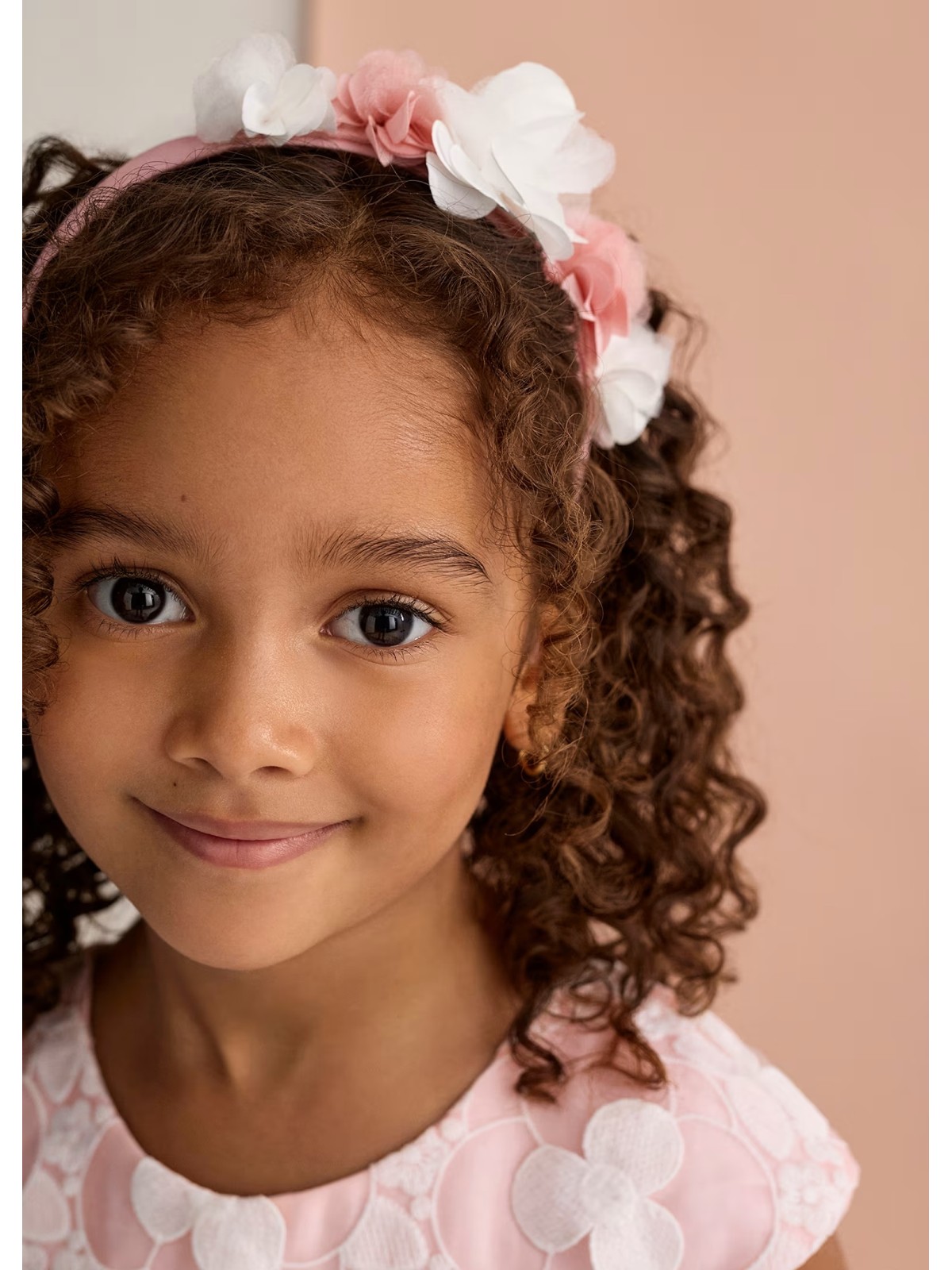 Incantevole cerchietto per bambina firmato Abel & Lula per bambina, ideale per cerimonie primaverili. La struttura rigida con passamaneria a vista sostiene una sequenza di fiori tridimensionali che alternano il bianco candido al rosa pesca. Realizzati con petali di velo e tulle, questi fiori donano volume e leggerezza, rendendo l'accessorio perfetto per abiti vaporosi o in pizzo.