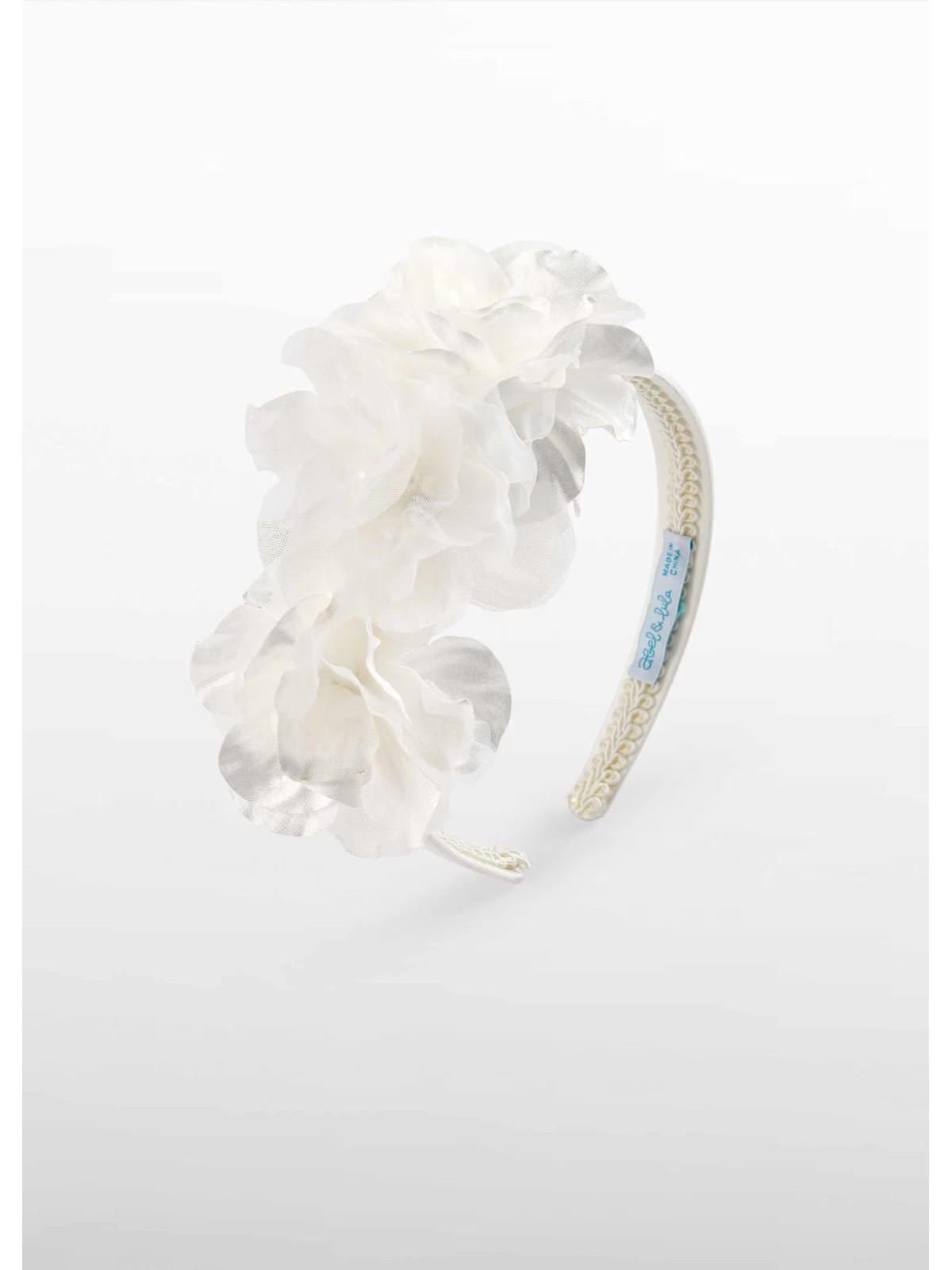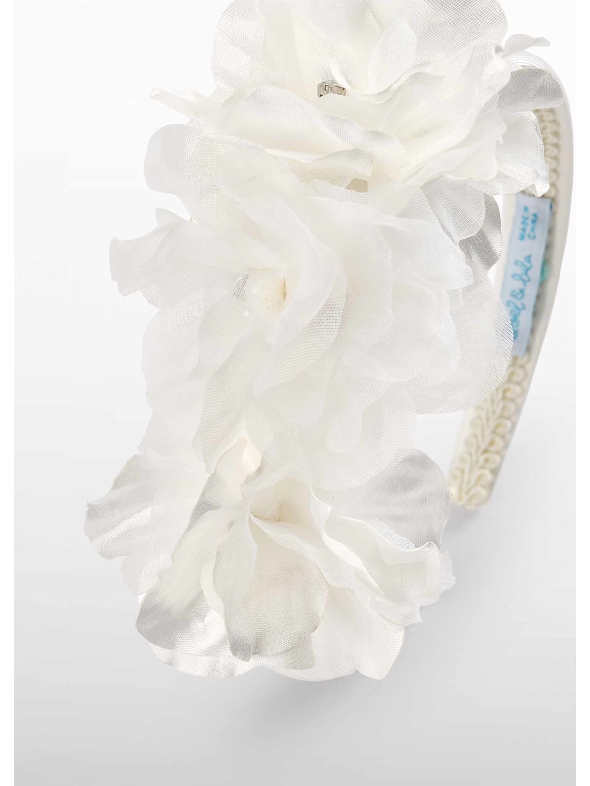 Raffinato cerchietto Abel & Lula per bambina. La base è arricchita da una passamaneria intrecciata a rilievo. L'accessorio si distingue per la composizione laterale di fiori in satin e tulle leggero, impreziositi al centro da delicate perle bianche e piccoli punti luce, creando un effetto romantico e scenografico.