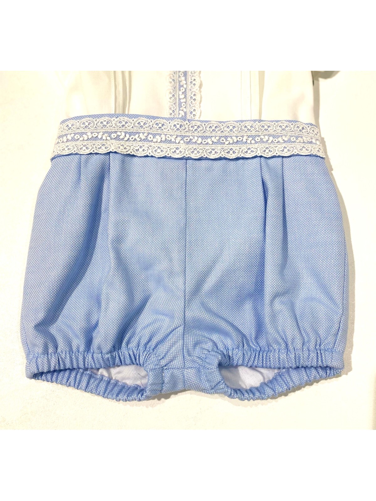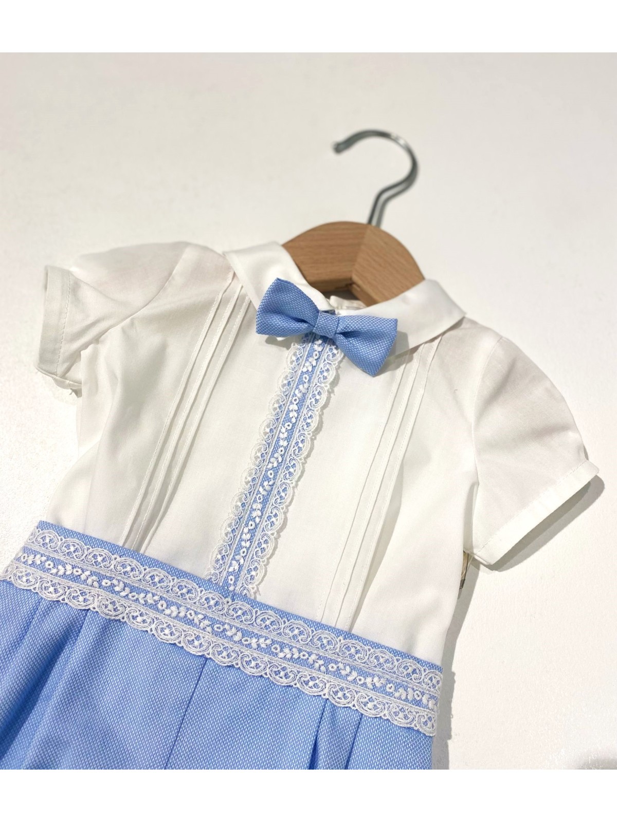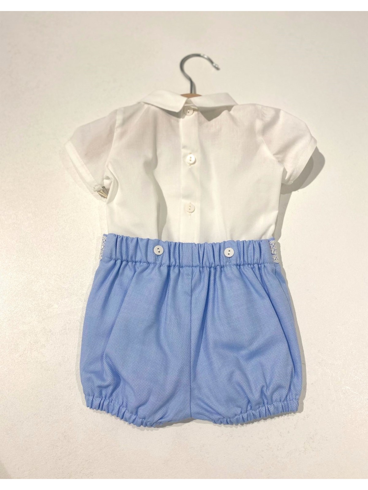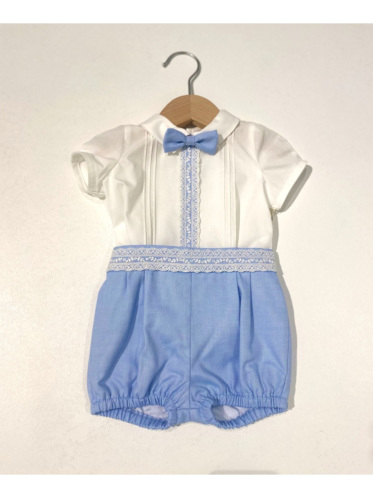 Completo 3 pezzi in misto cotone composto da camicia, bermuda e papillon. Camicia con ricamo centrale , ed apertura sul retro con bottoni. Bermuda con pence e cintura applicata , asole nascoste per fermare la camicia. Papillon con elastico , removibile.