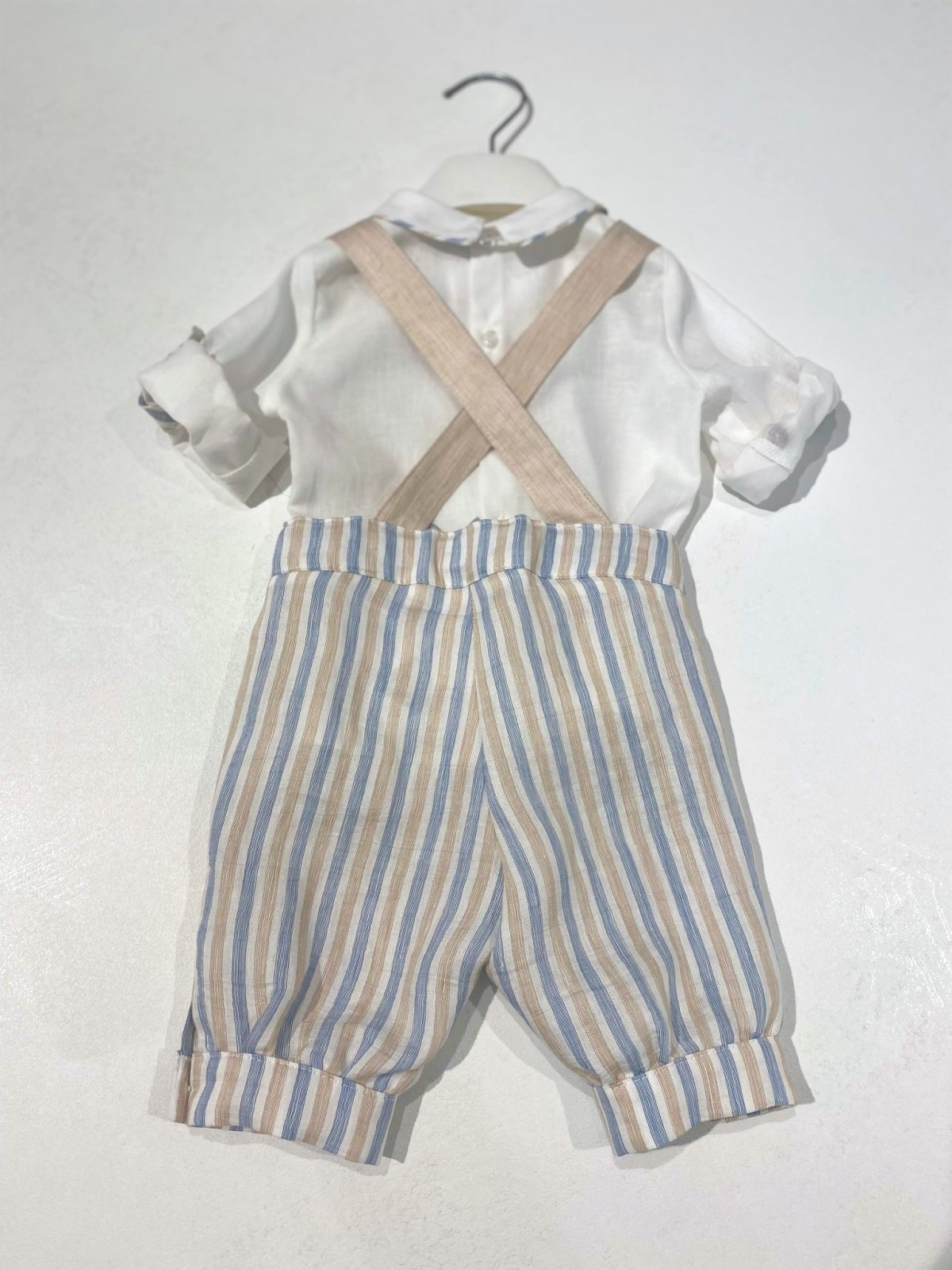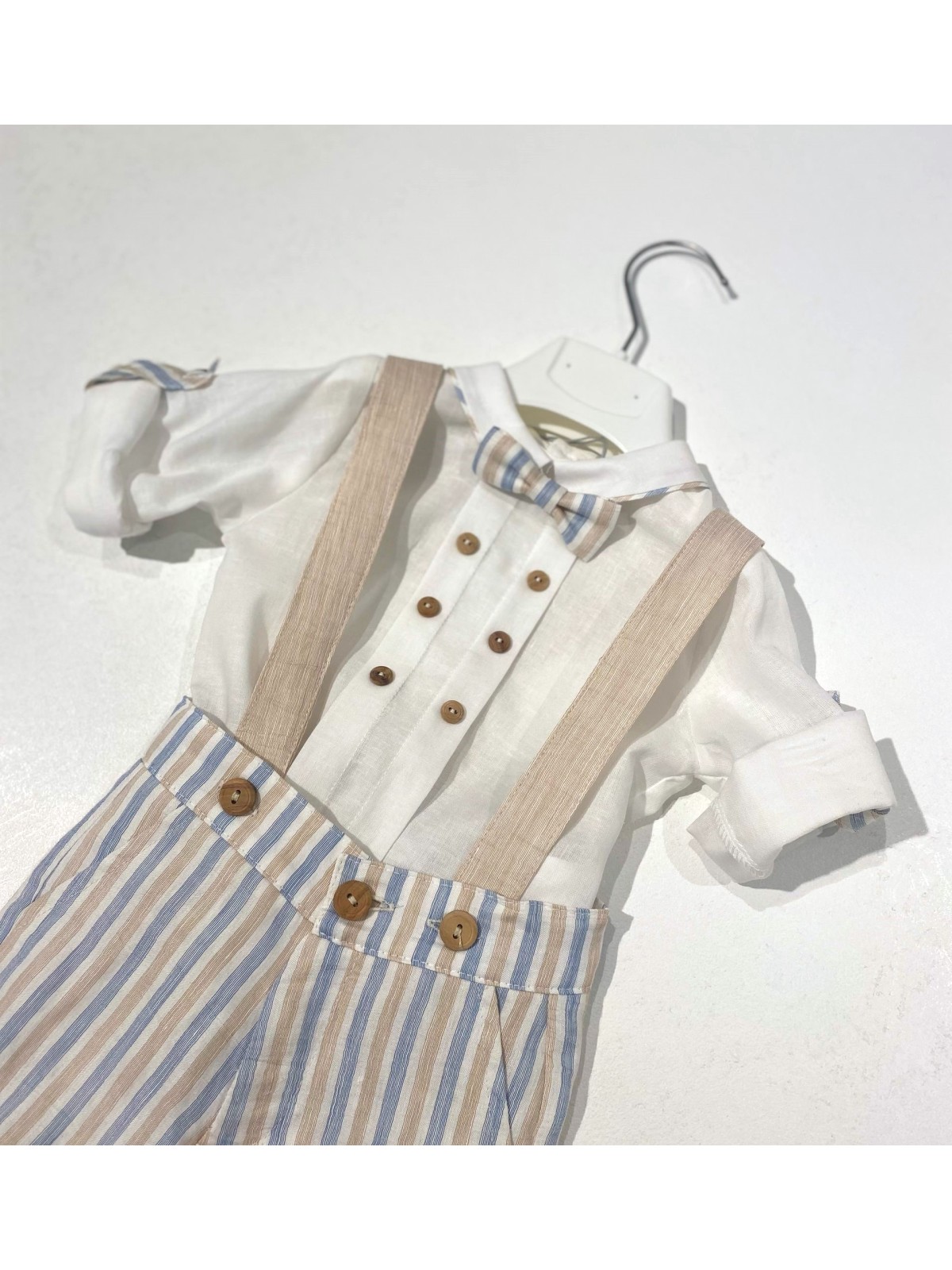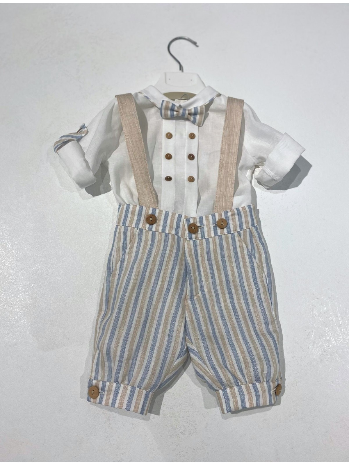 Completo battesimo composto da camicia bermuda e papillon. Camicia manica lunga con fettuccia per risvolto , con lavorazione centrale e bottoni in madreperla, ed apertura sul retro. Bermuda elegante , bretelle con asole per regolare la lunghezza, e bottoni in tinta . Papillon abbinato , removibile