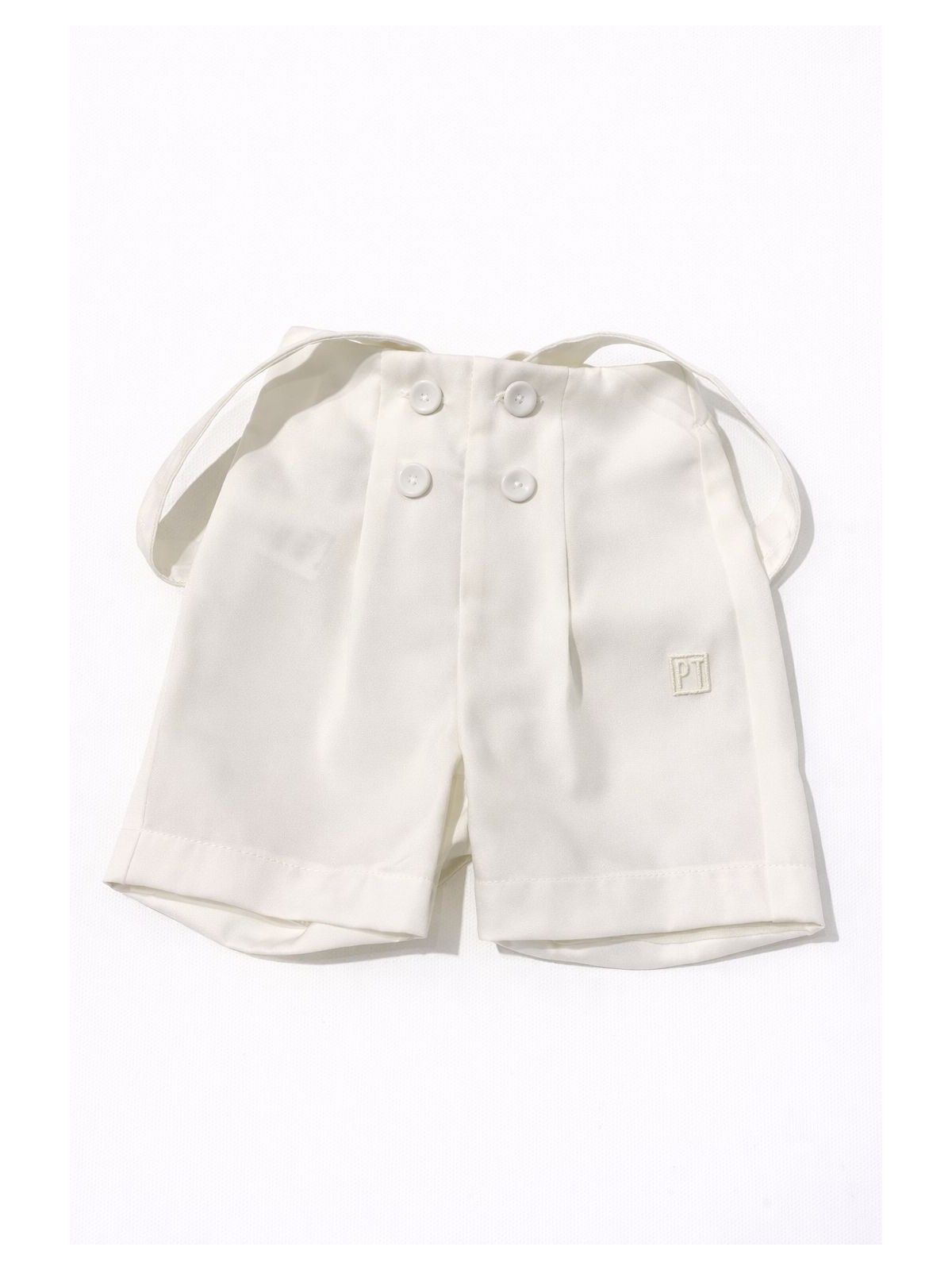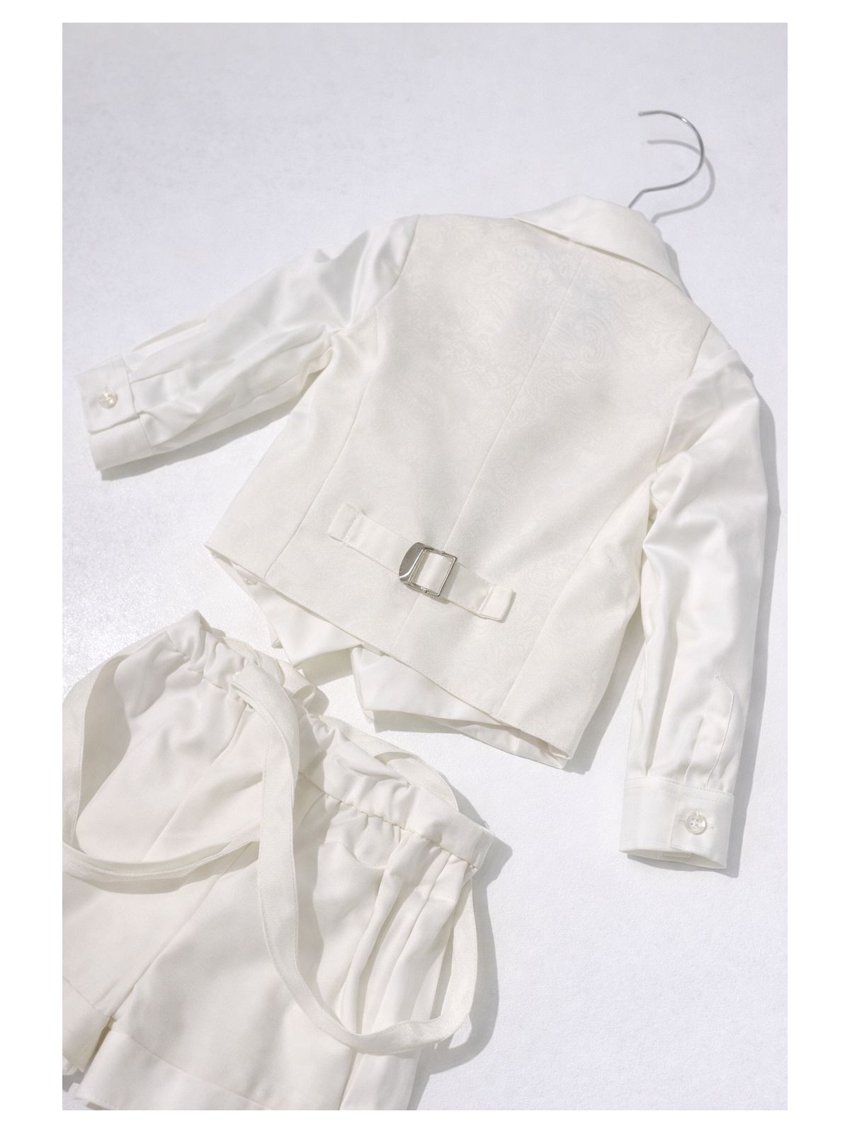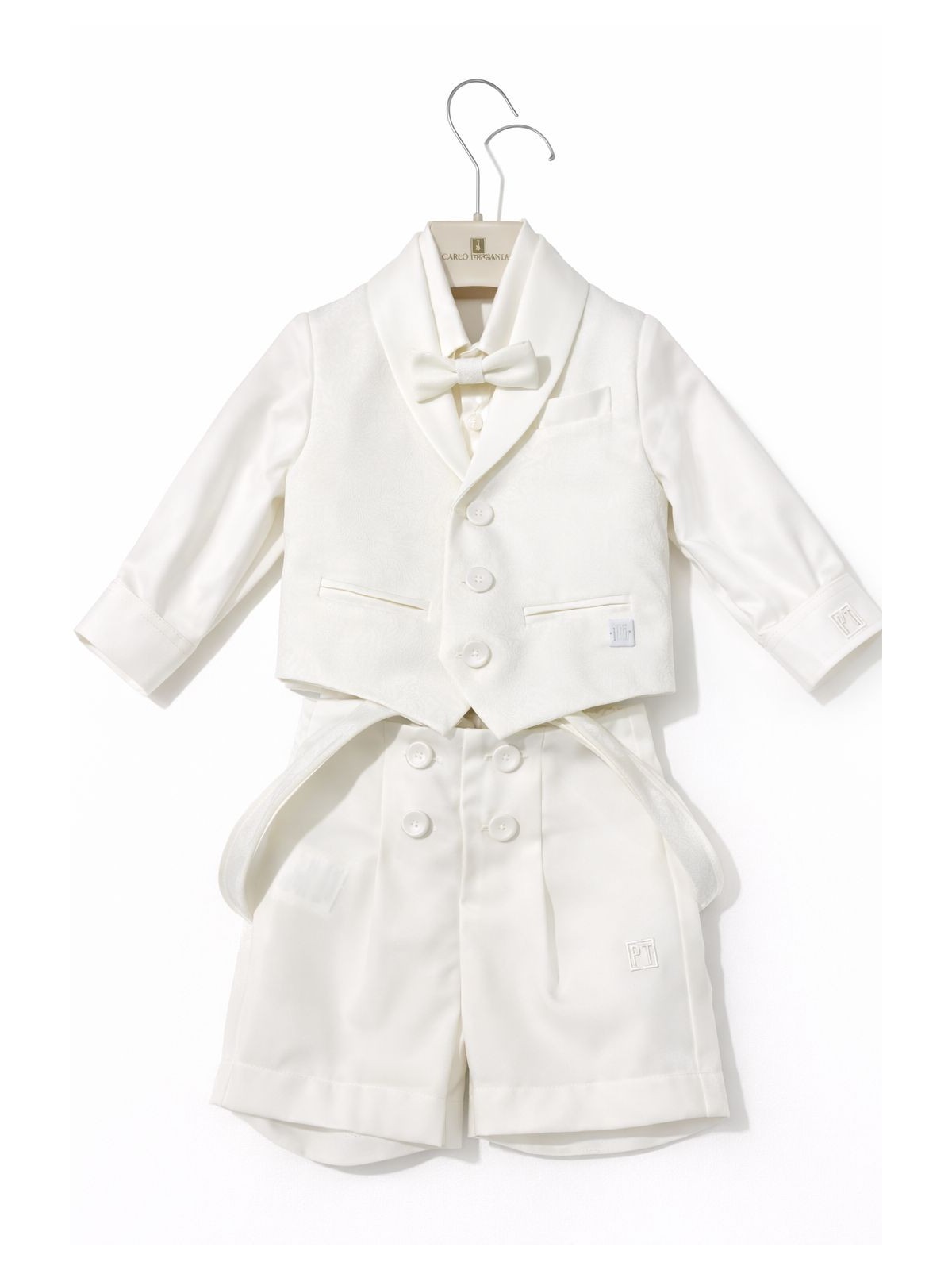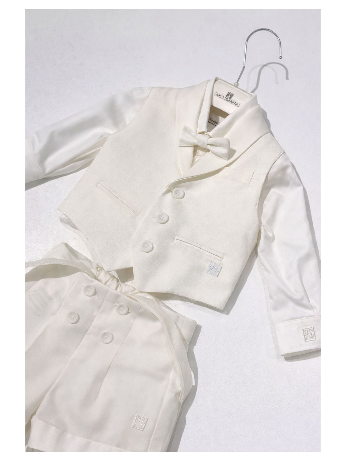 Completo da battesimo 4 pezzi composto da : Gilet con microfantasia damascata tinta su tinta e collo sciallato. Camicia manica lunga , apertura frontale con bottoni e fettuccia per risvoltare la manica . Pantalone lunghezza ginocchio con bretelle , elastico sul retro e bottoni frontali . Papillon abbinato removibile