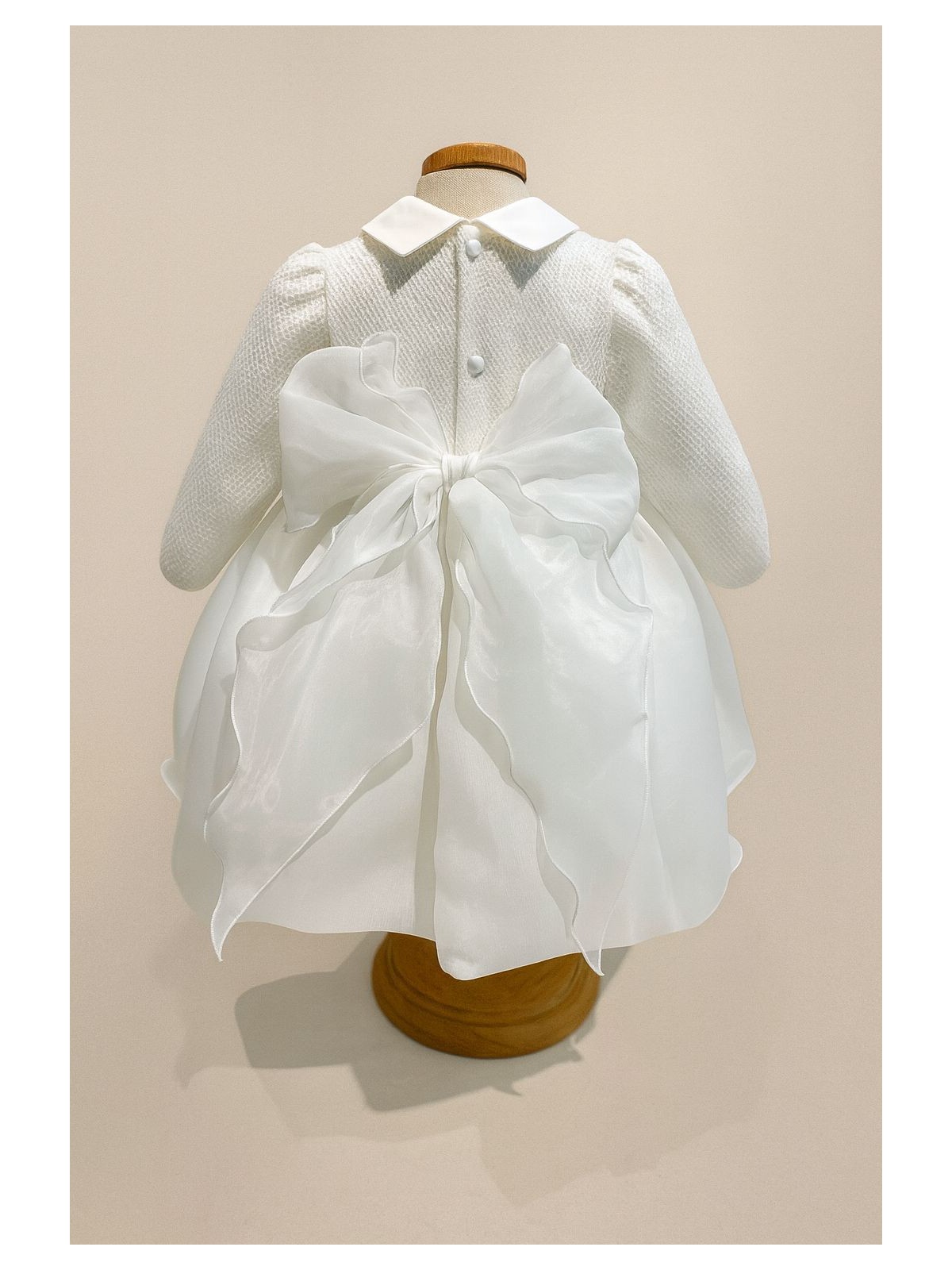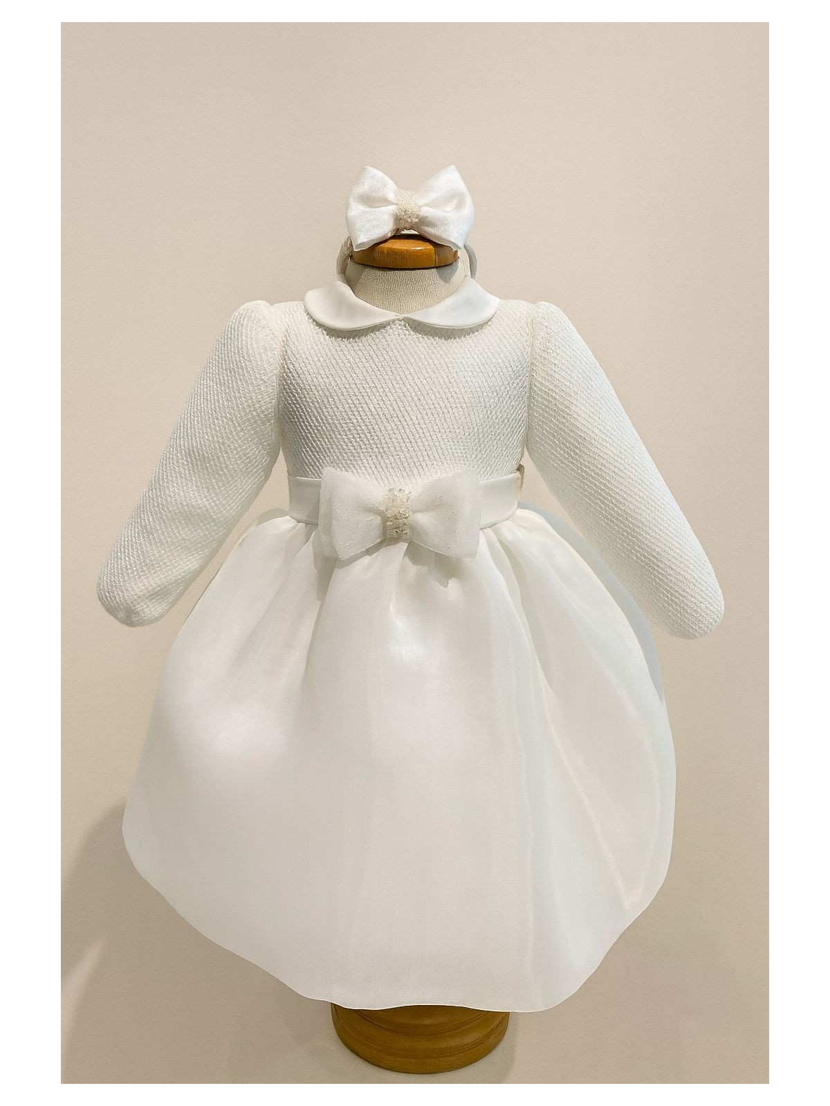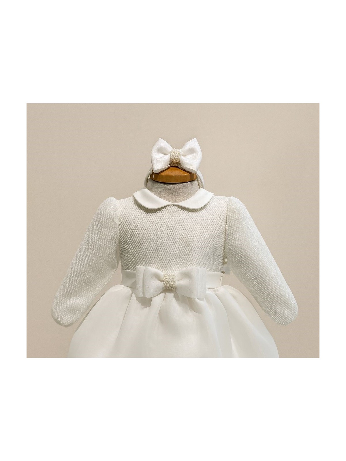 Abito da battesimo sartoriale Made in Italy , manica lunga con colletto. . Corpetto con paillettes ,, fiocco glitter applicato , e chiusura sul retro con bottoni. Gonna e fascia in vita in organza. Coulotte con elastico in vita per agevoalre la vestibilità. Completa l'outfit con fascia per capelli art10430