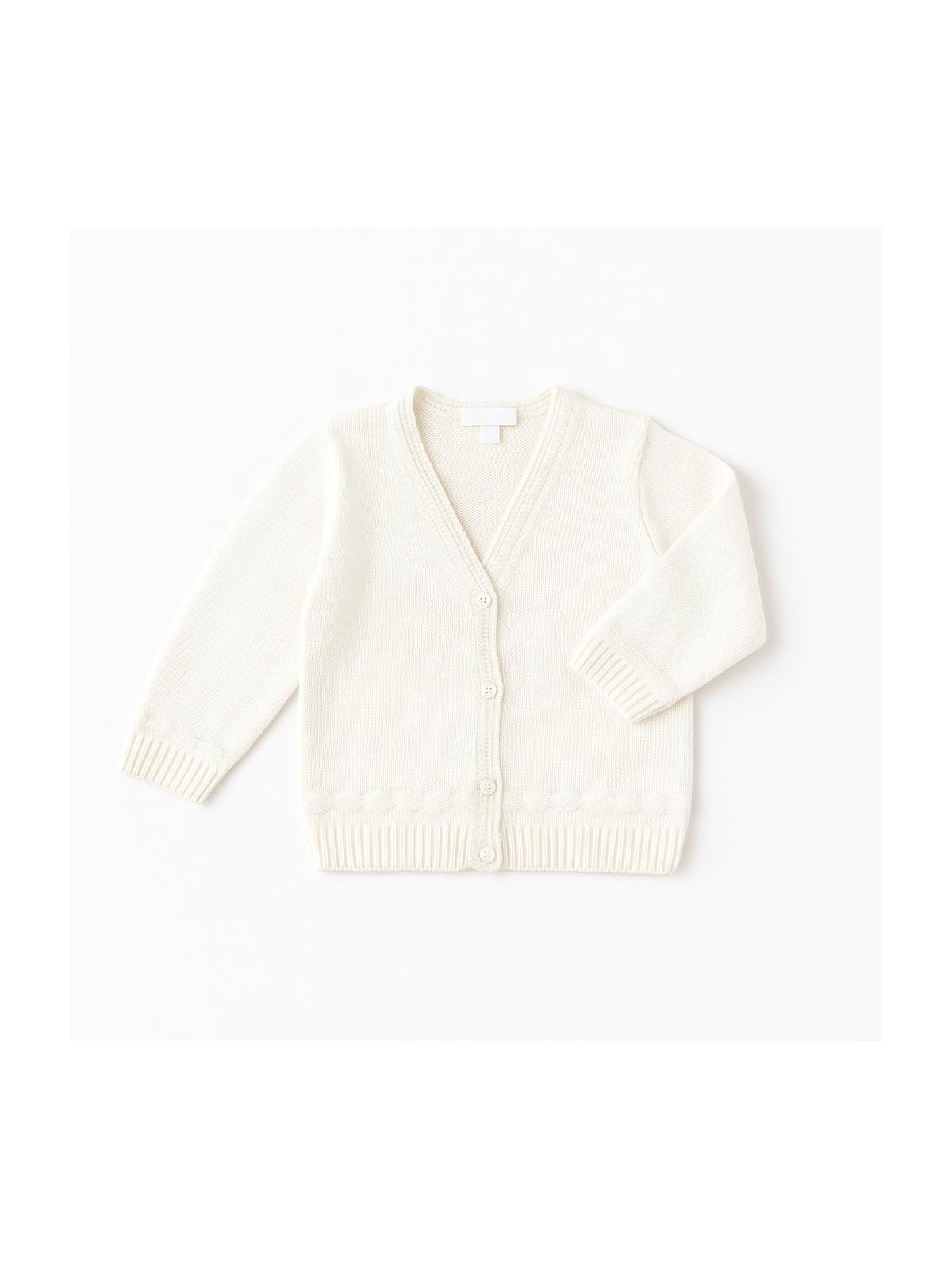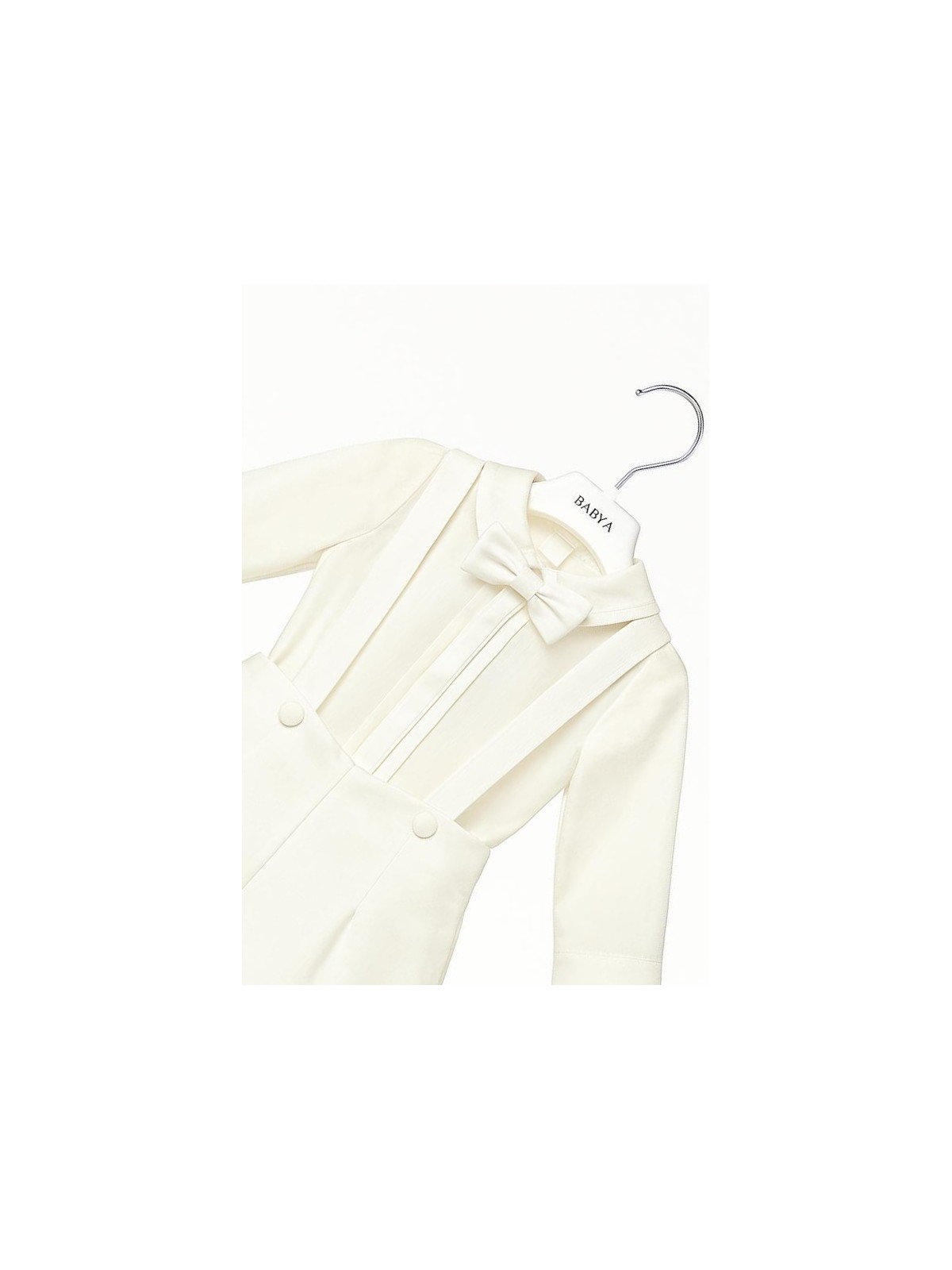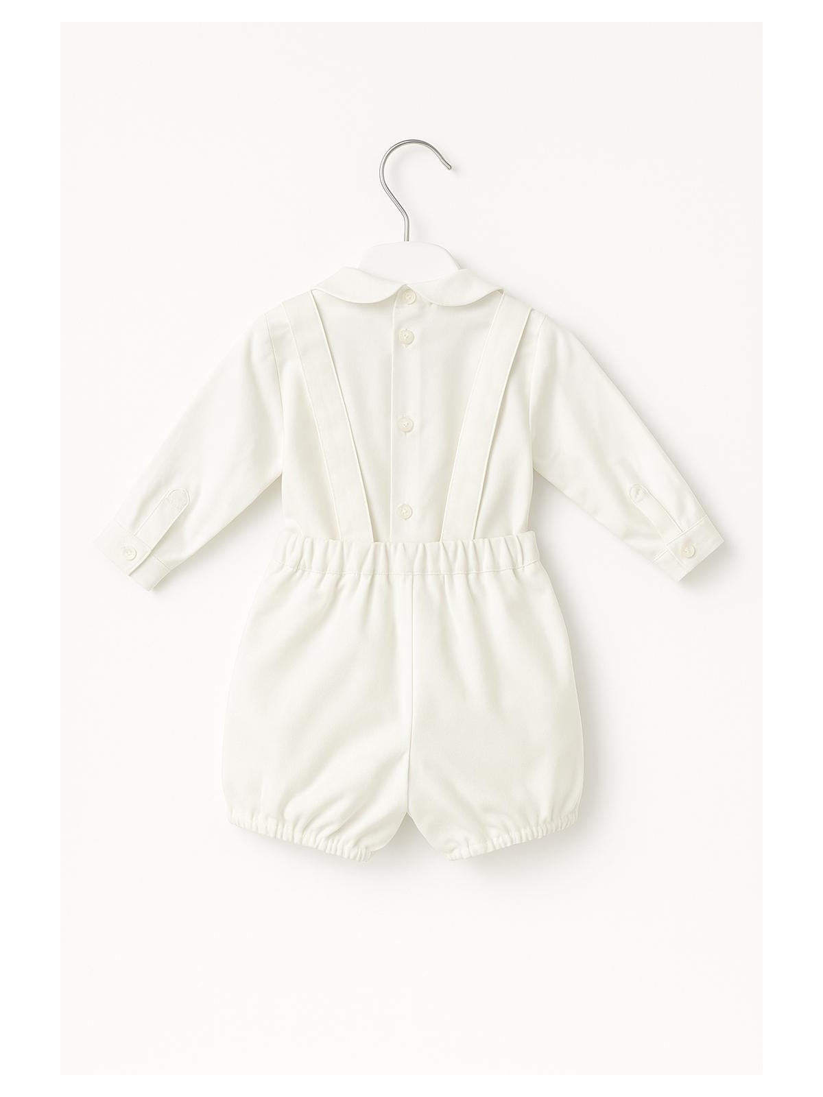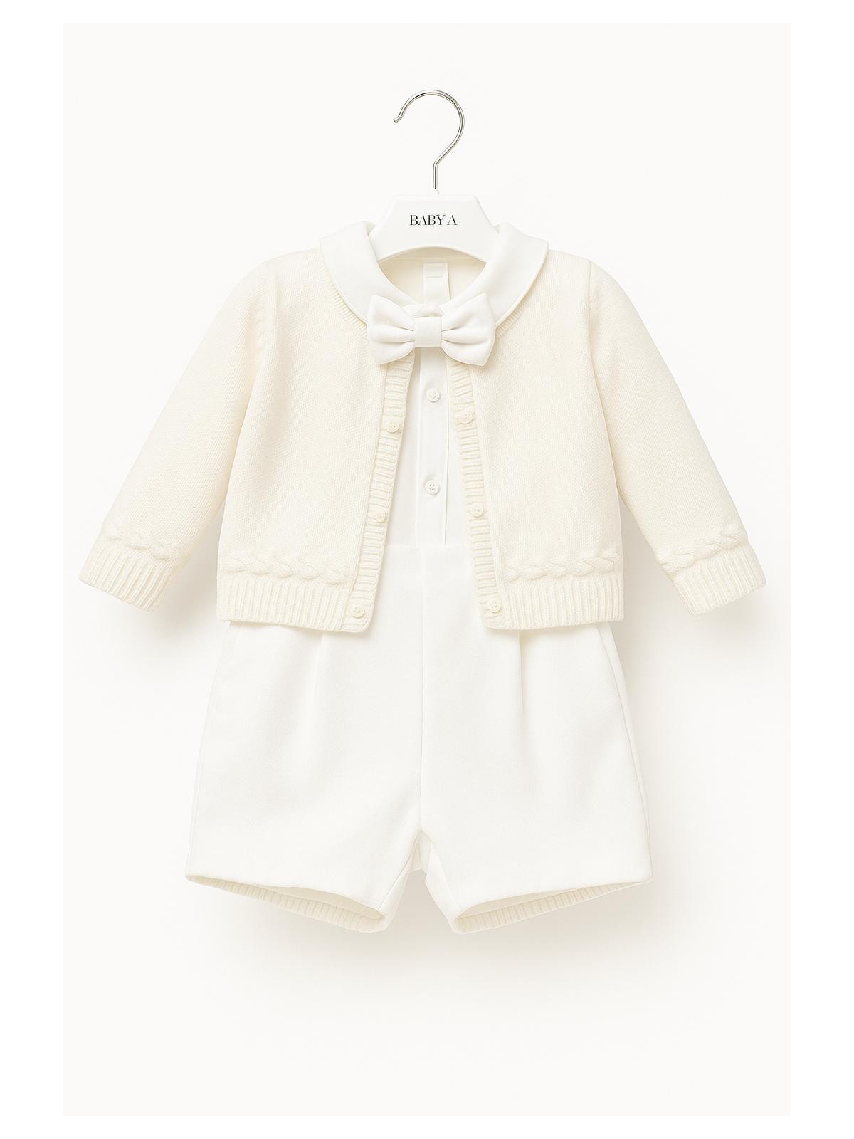Completo battesimale 4 pezzi composto da camicia, bermuda papillon e cardigan. Camicia body in caldo cotone con pieghe frontali ed apertura sul retro con bottoni. Bermuda con bretelle . Papillon cucito. Cardigan apertura frontale con bottoni per completare l'outfit.