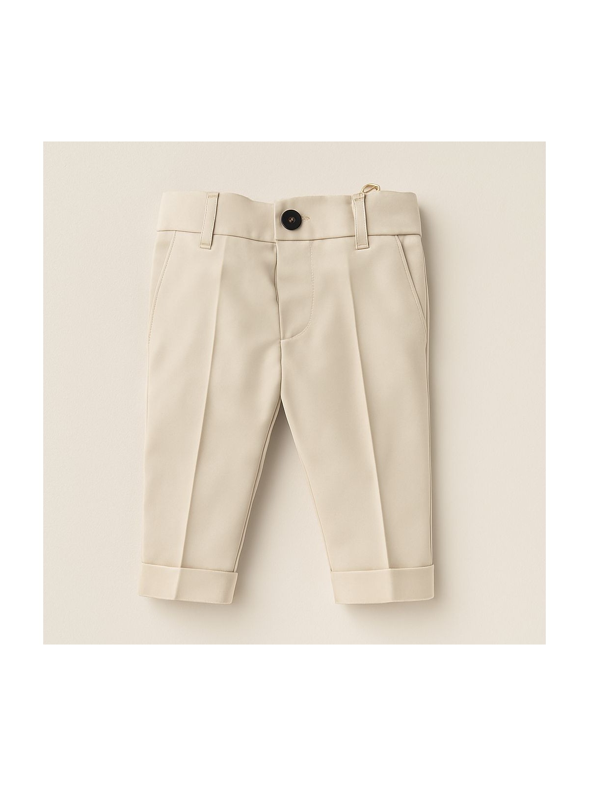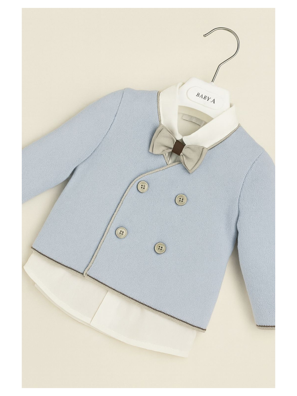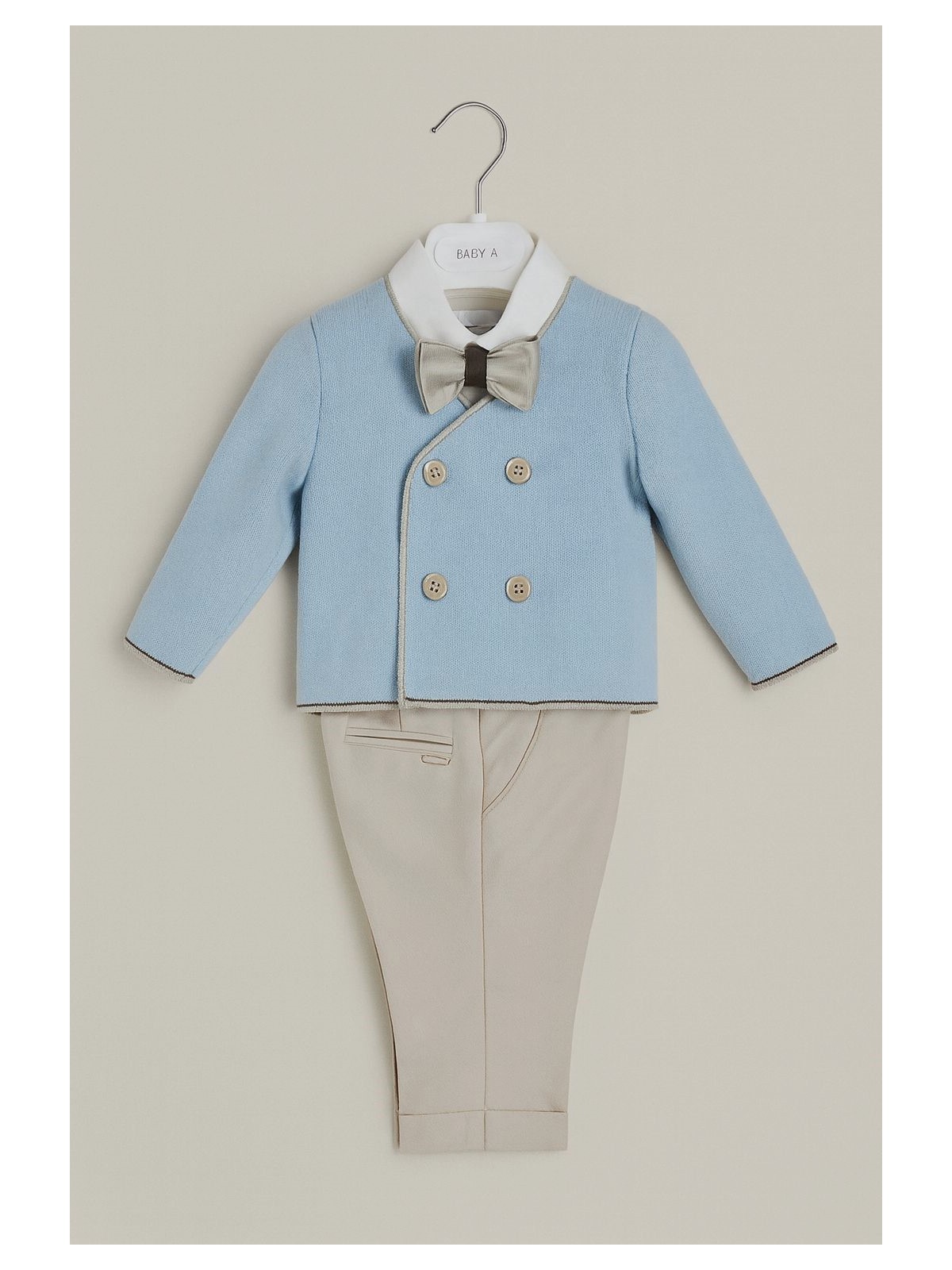 Completo elegante per Battesimo 4 pezzi neonato. Composto da camicia bianca con papillon beige rifinito da dettaglio marrone, pantaloni beige sartoriali e cardigan a doppiopetto celeste con bordi a contrasto. Lavorazione in maglia fine e taglio raffinato per un outfit da cerimonia comodo e di grande stile.