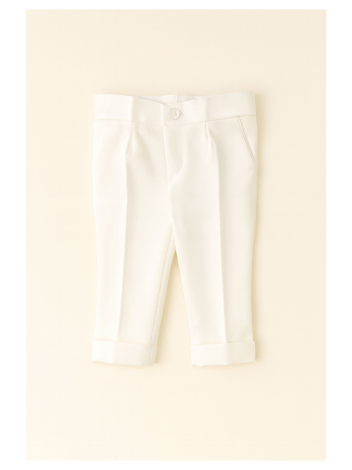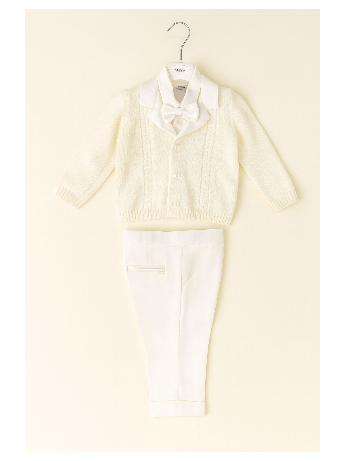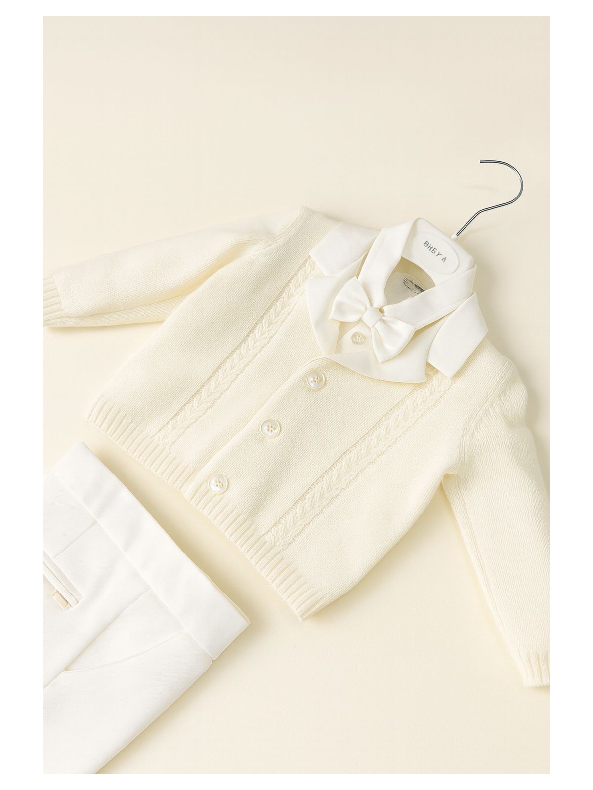 Completo elegante per Battesimo 4 pezzi neonato. Composto da camicia bianca con papillon rimovibile, Pantaloni panna sartoriali , e cardigan taglio giacca, trecce frontali e rever in raso a contrasto.