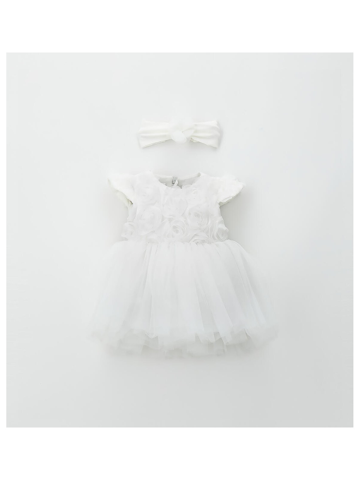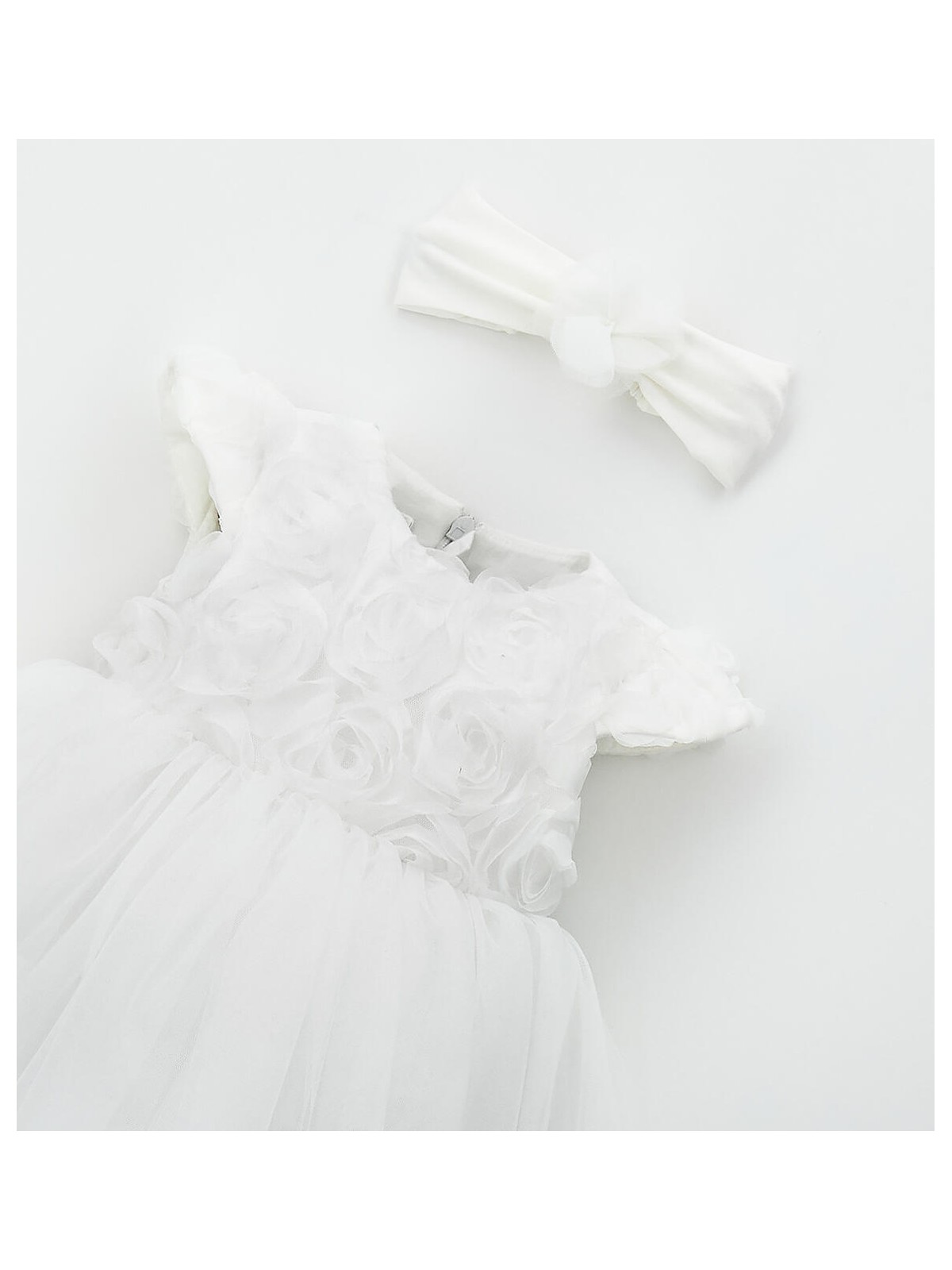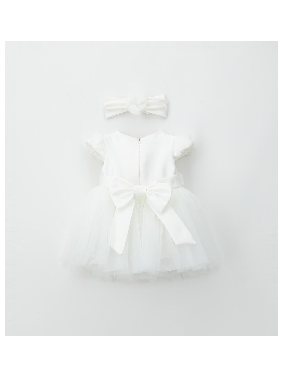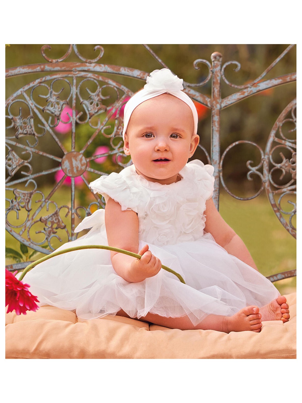 Elegante abito Minibanda per noenata realizzato in tulle con fodera in cotone. Modello smanicato con lunghezza al ginocchio. Fiocco dietro. Apertura dietro con zip invisibile. Graziosa fascia per capelli in abbinamento, realizzata in jersey di cotone con fiore in tulle