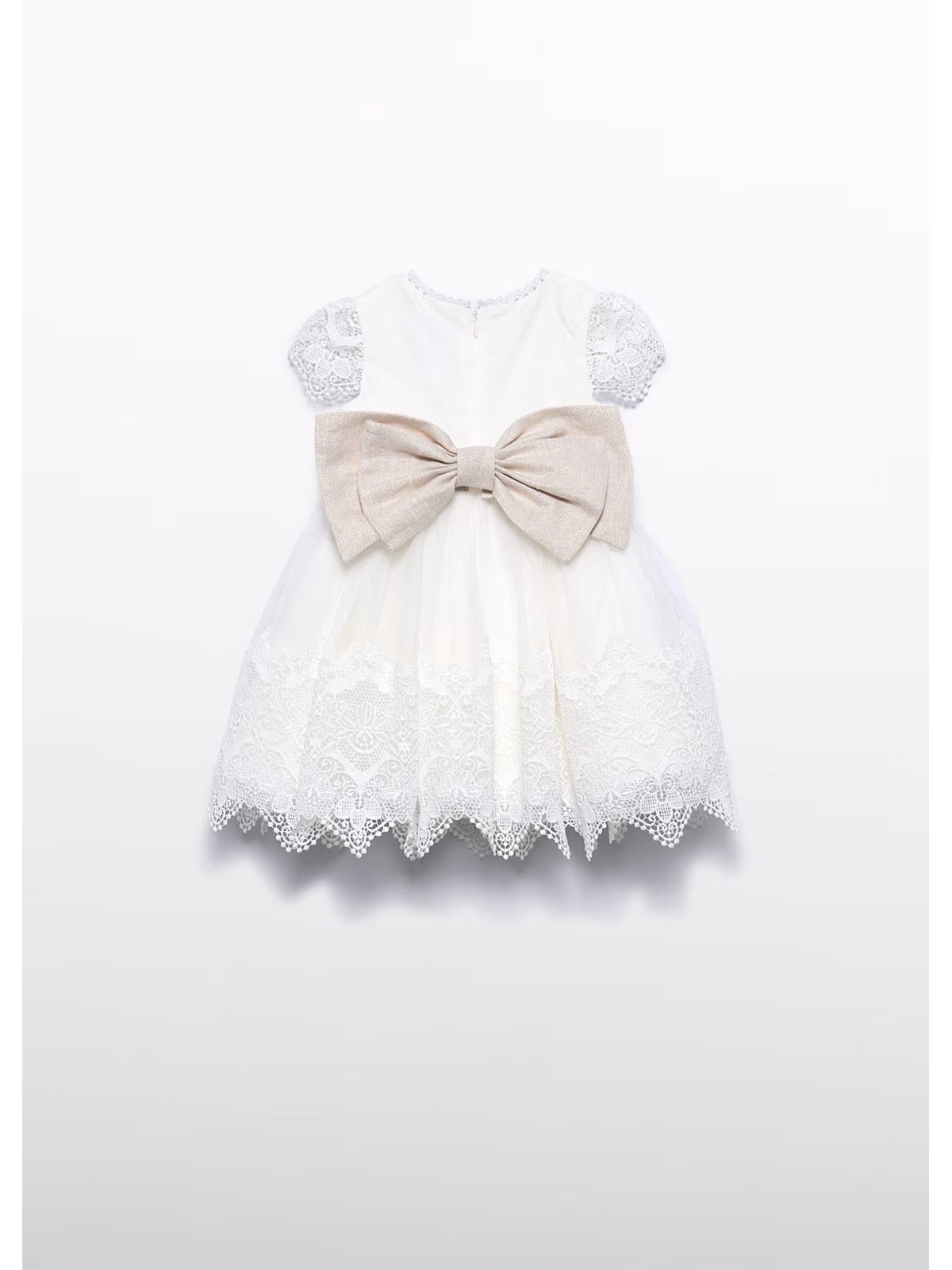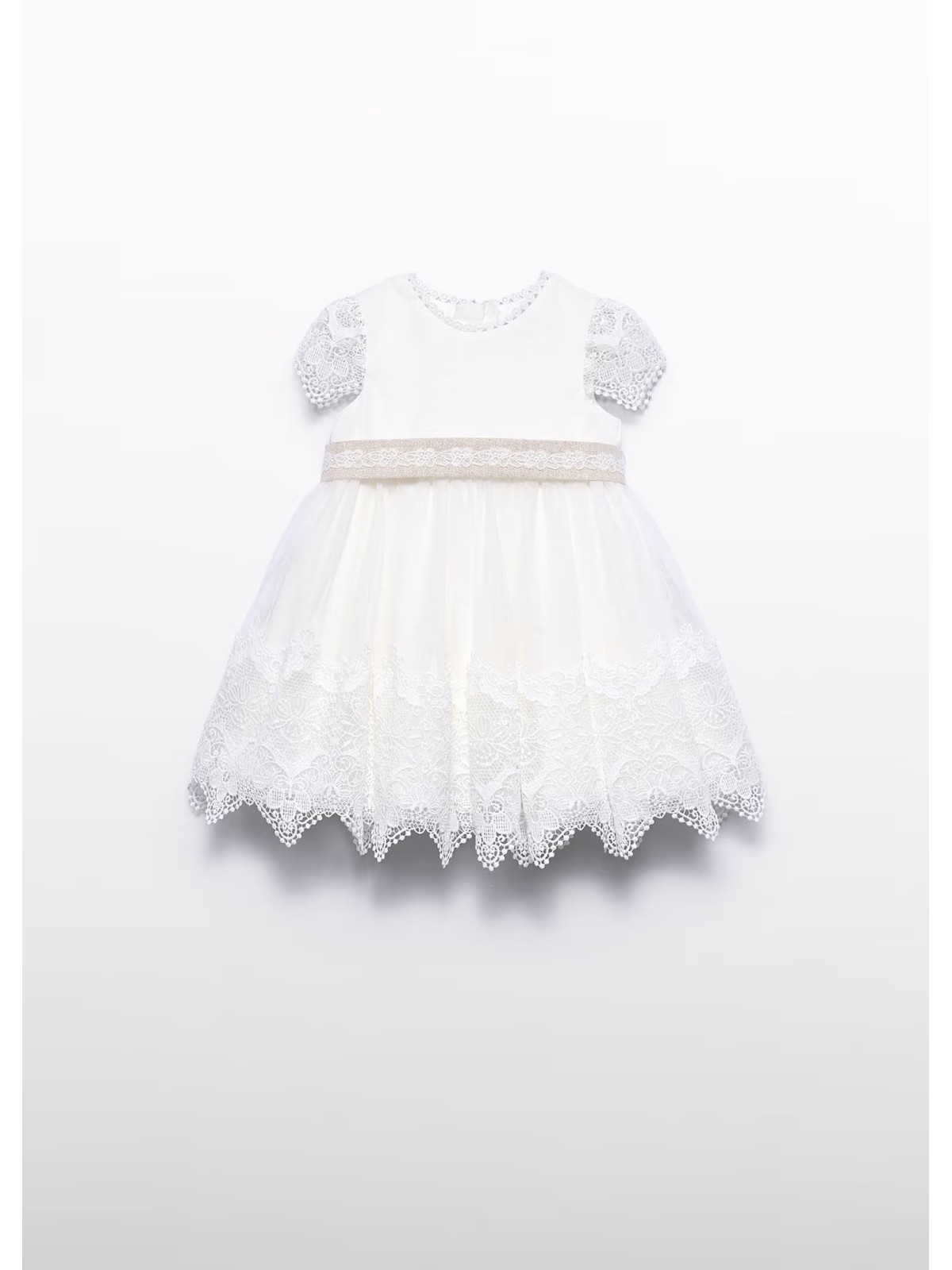 Abito Abel & Lula da battesimo mezzamanica. Modello in tulle , con pizzo sui bordi e sulle maniche. Con Cintura glitter in in vita in organza ,e fiocco sul retro. Chiusura con cerniera sul retro.