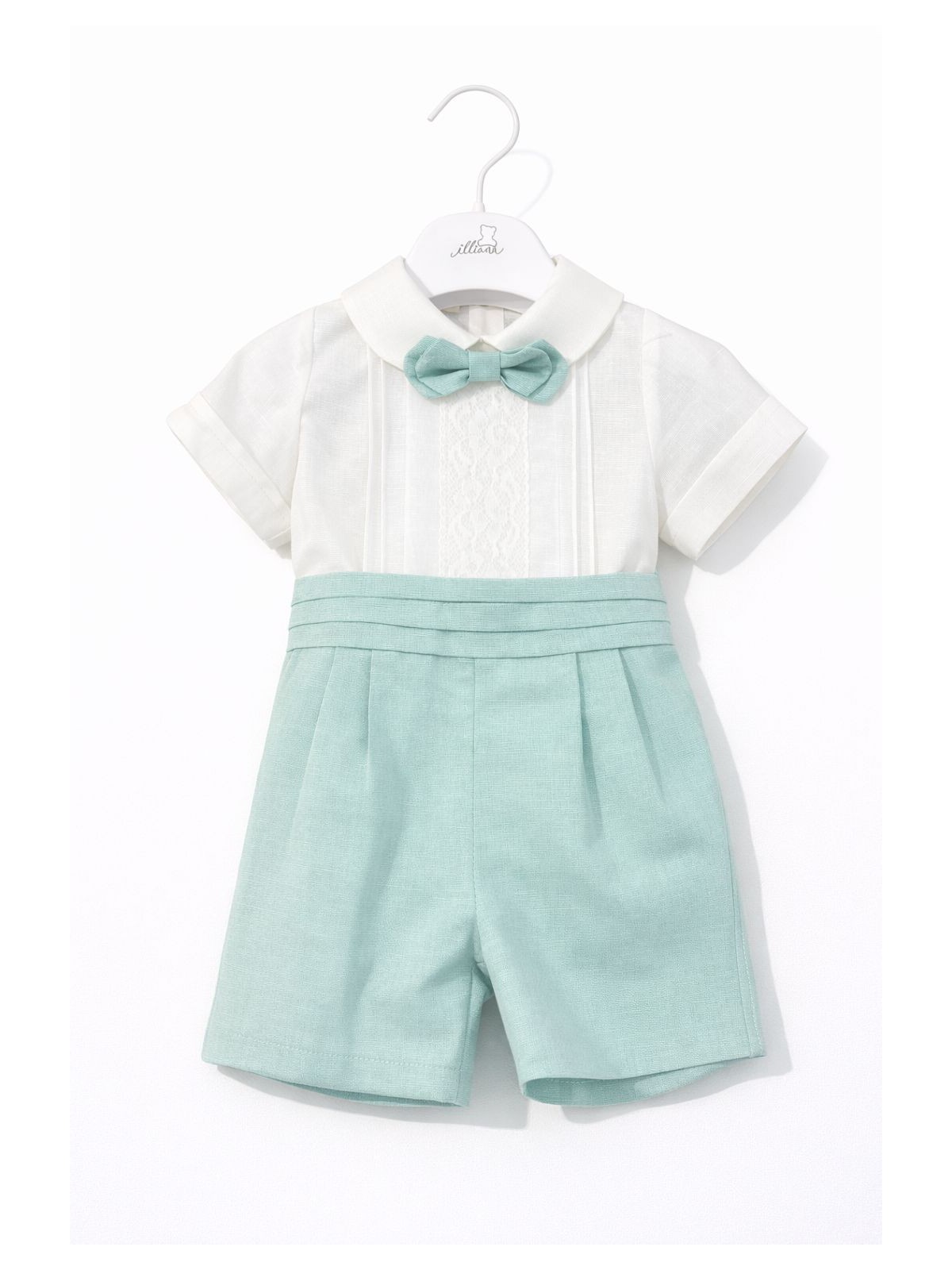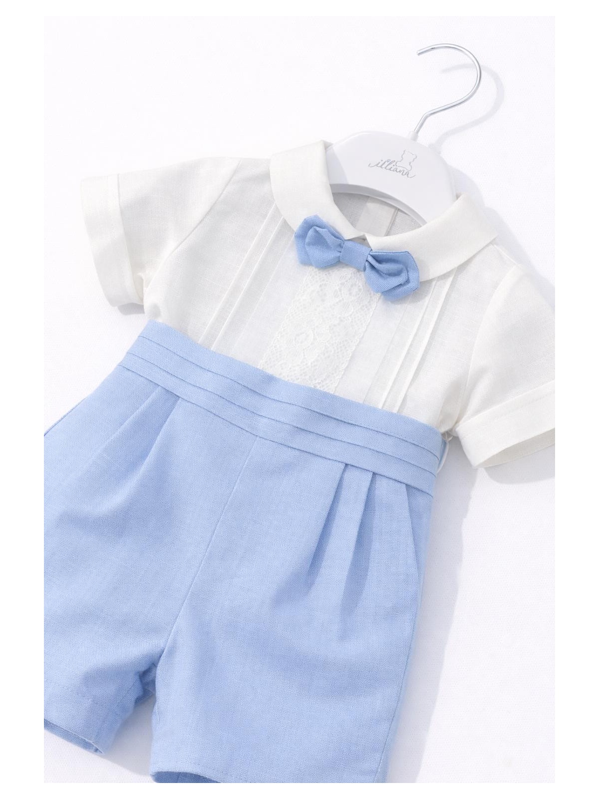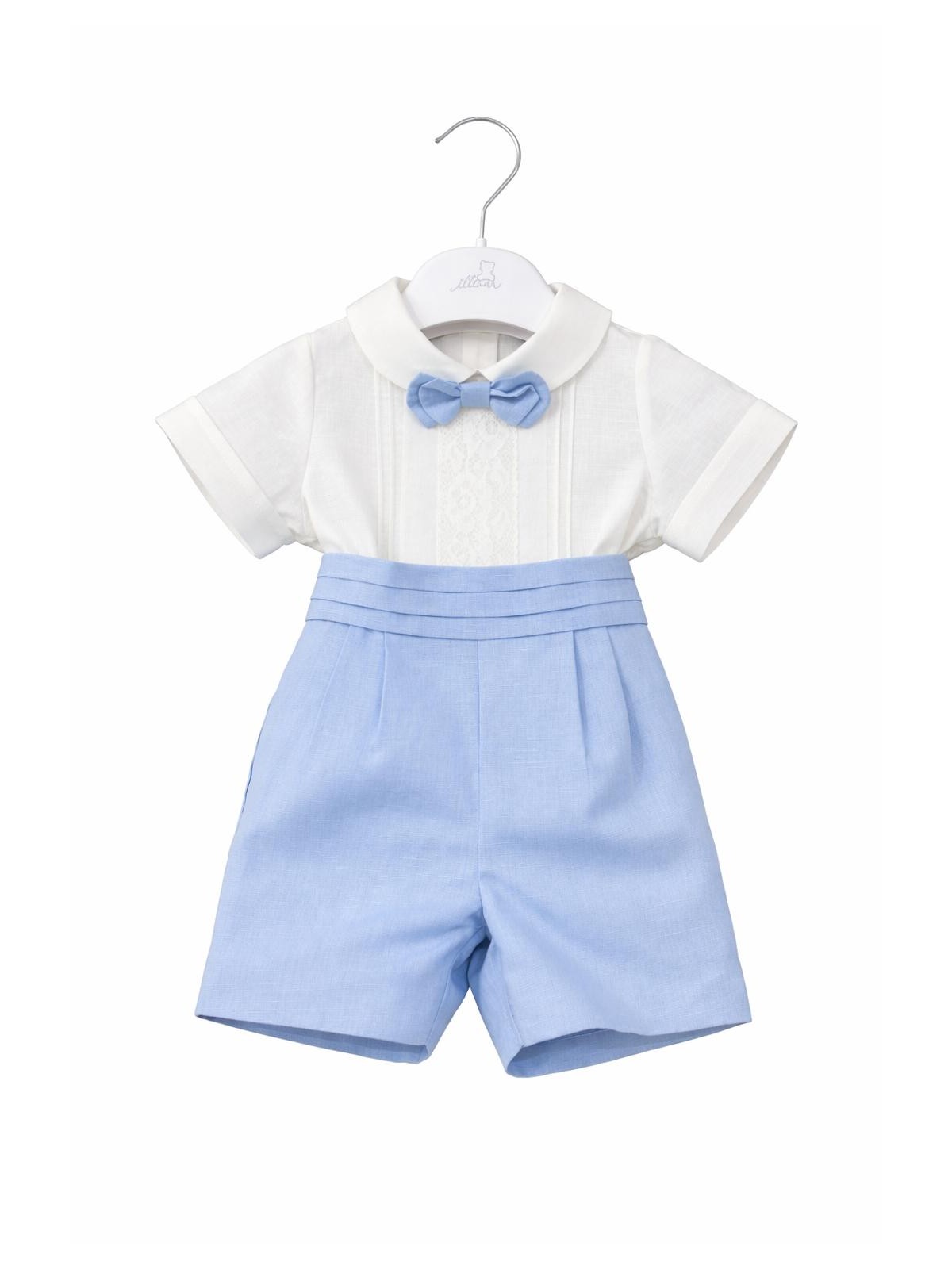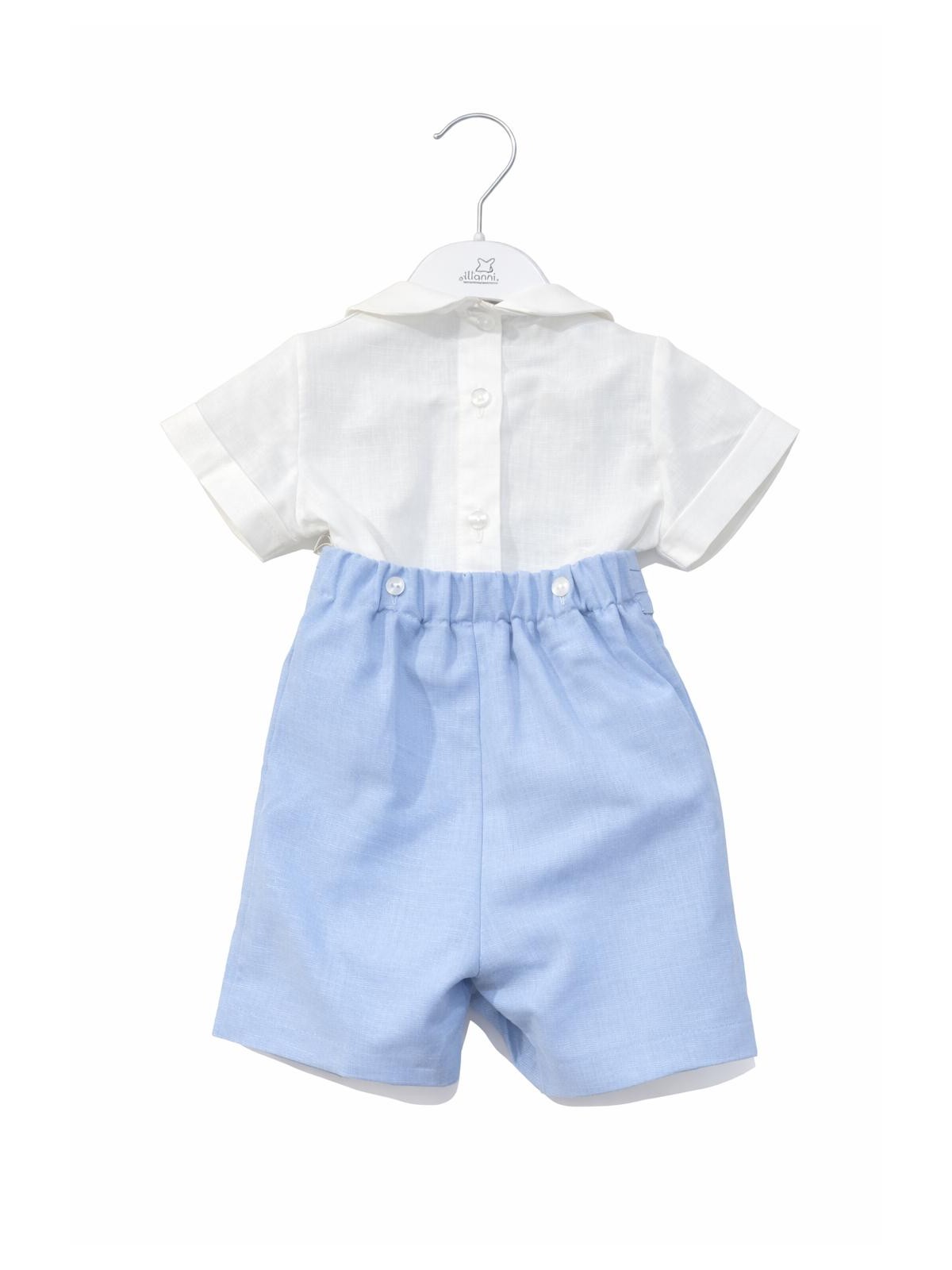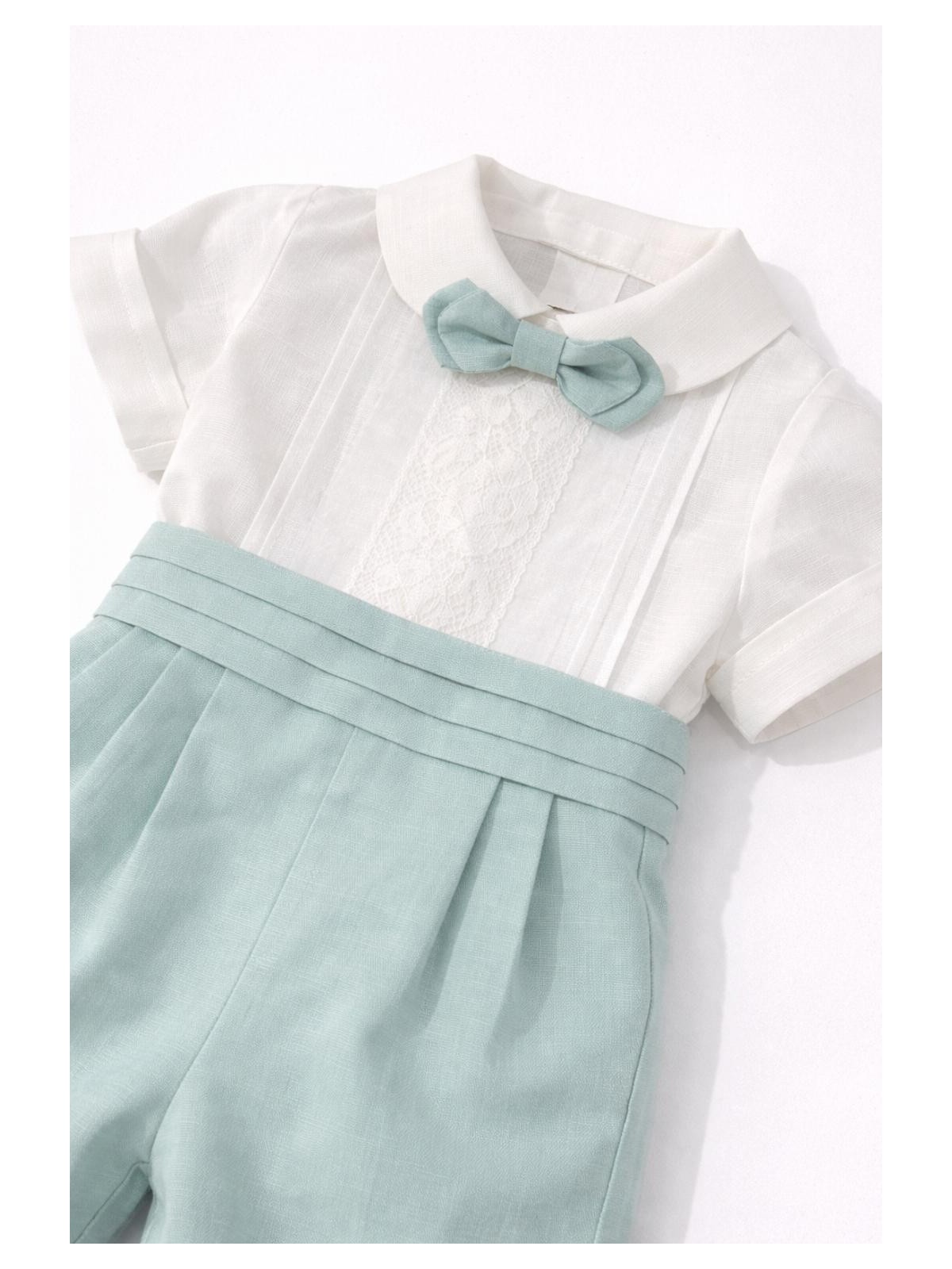 Completo 3 pezzi in lino composto da camicia, bermuda e papillon. Camicia con ricamo centrale , ed apertura sul retro con bottoni. Bermuda con pence e cintura applicata , asole nascoste per fermare la camicia. Papillon con elastico , removibile.