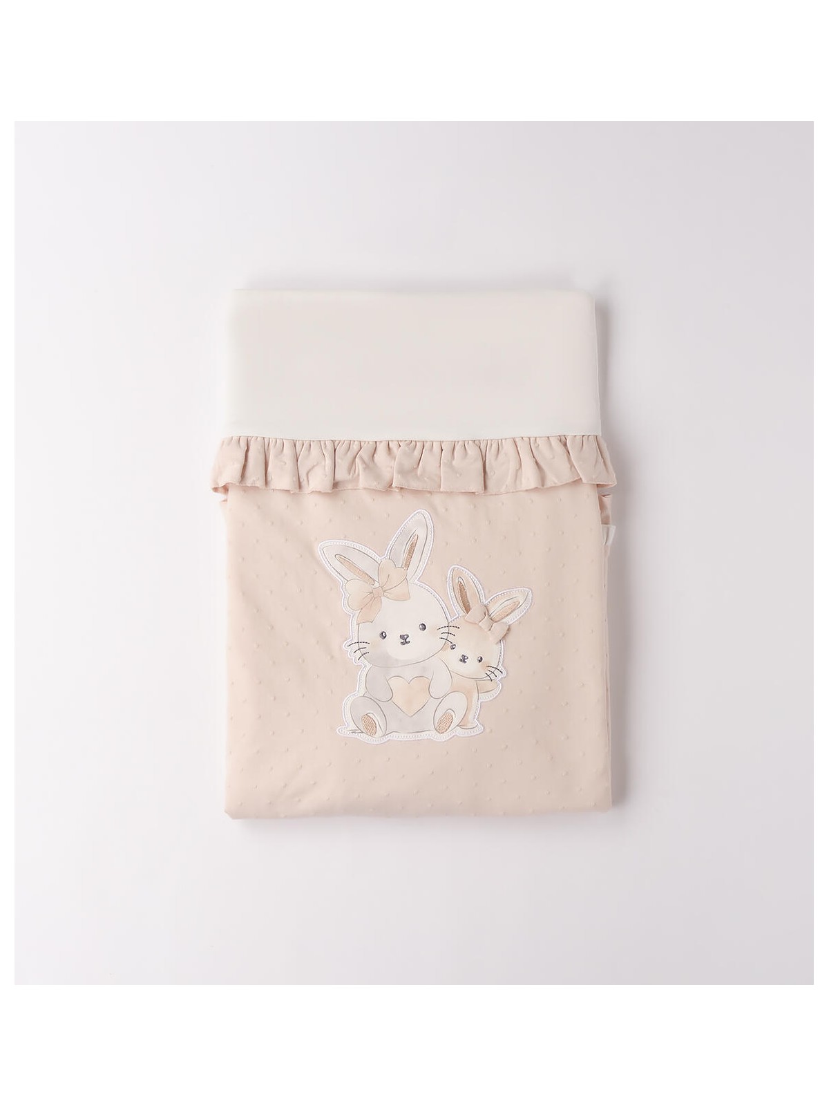 Copertina per neonata realizzata in jersey stretch di cotone con lavorazione a pois, e applicazione stampa coniglietti con ricamo. Leggera imbottitura in ovatta. Misure per culla: lunghezza 100 cm e larghezza 75 cm. La coeprtina è confezionata in una pratica scatolina