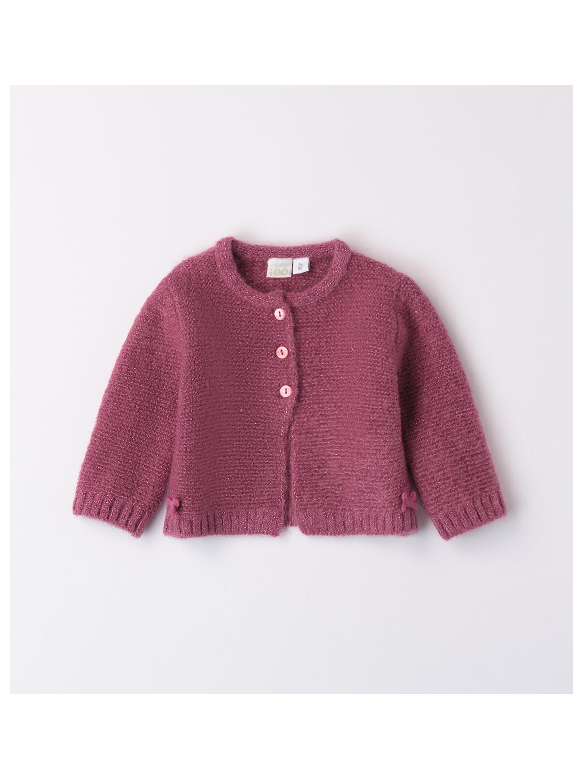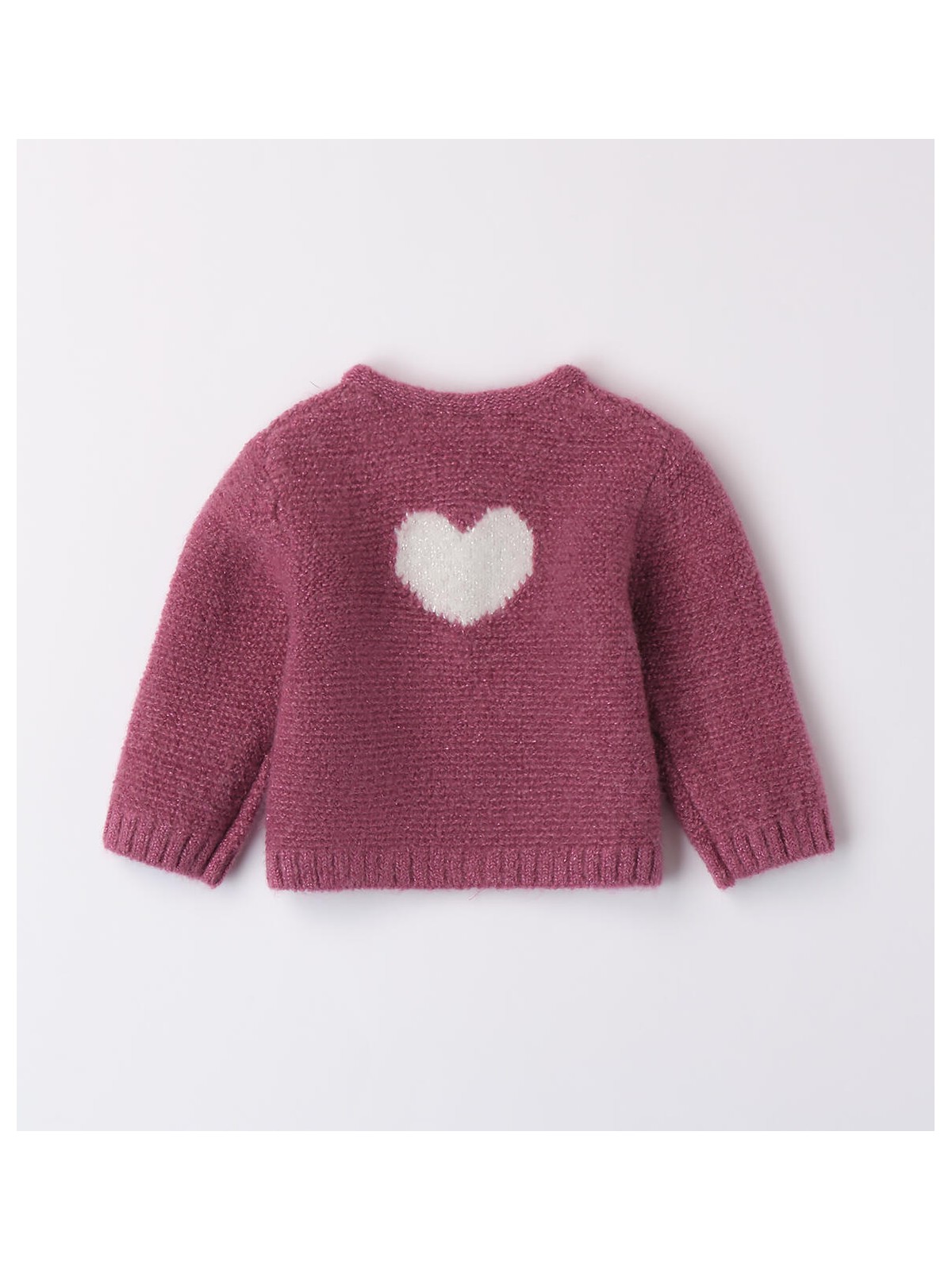 Cardigan per bimba realizzato in tessuto di tricot lurex con ricamo cuore sulla schiena. Il modello presenta apertura sul davanti con bottoni.