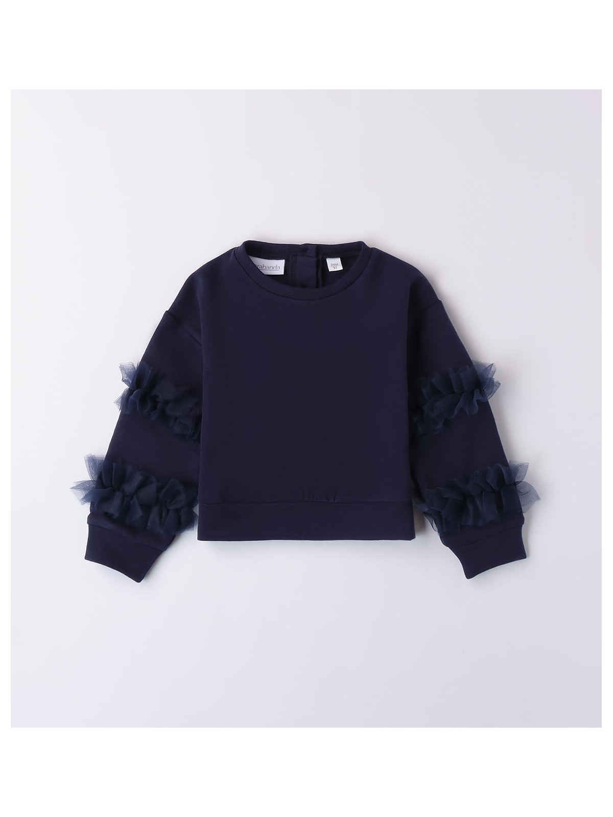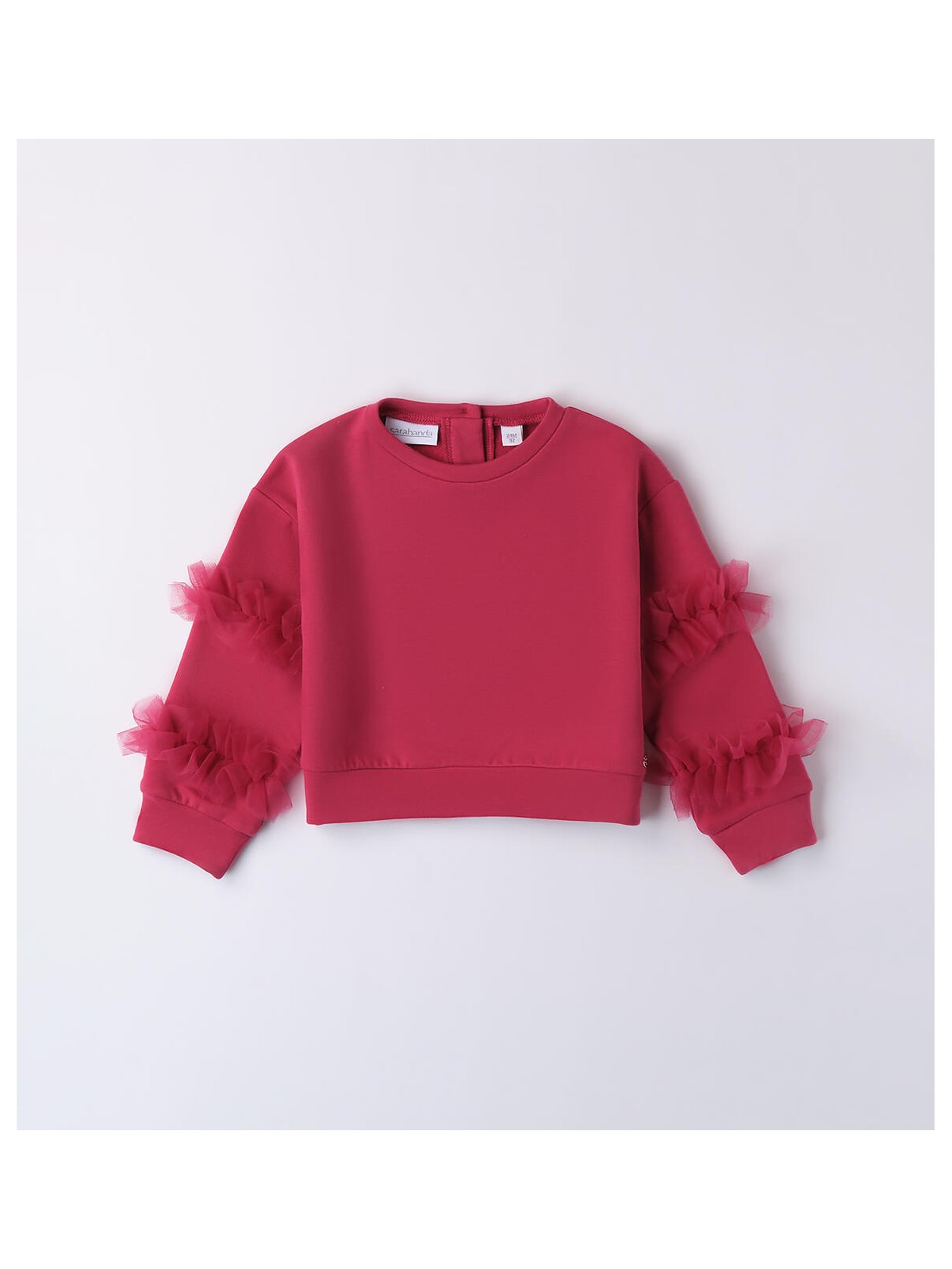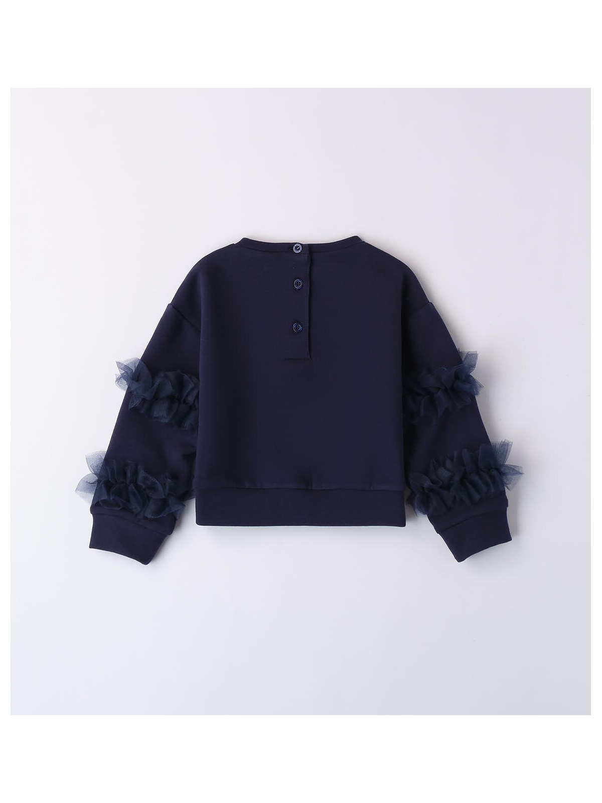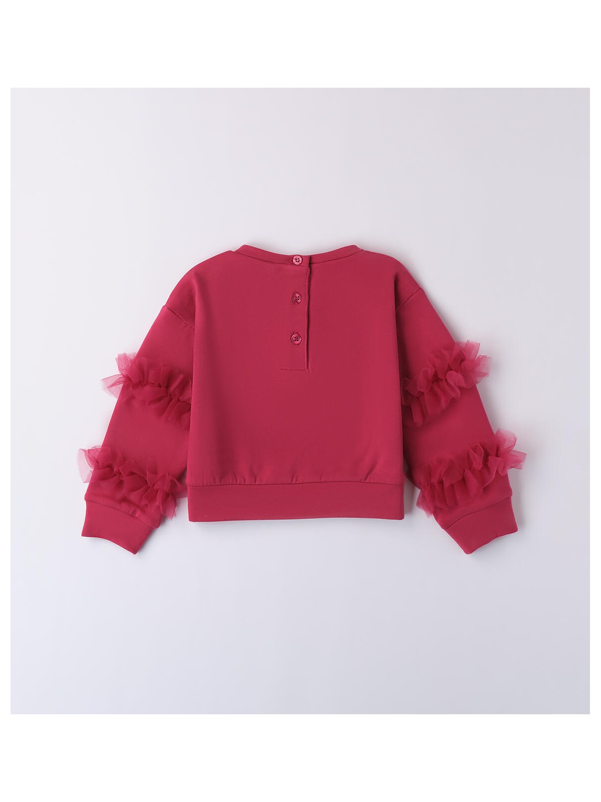 Felpa bambina Sarabanda 9 mesi - 8 anni realizzata in tessuto stretch felpato. Il modello presenta apertura sul retro con bottoni e maniche con applicazione ruches in tulle.