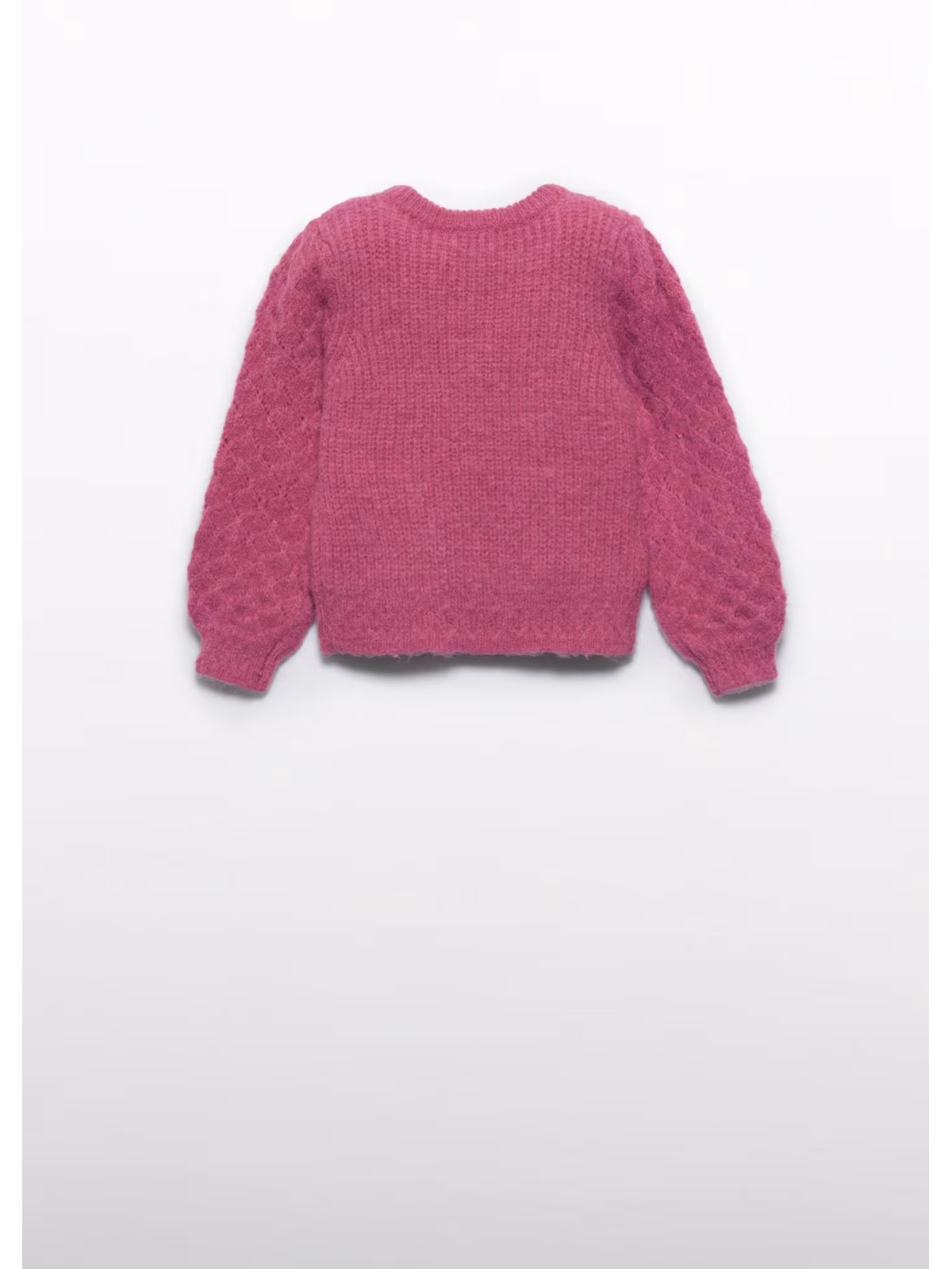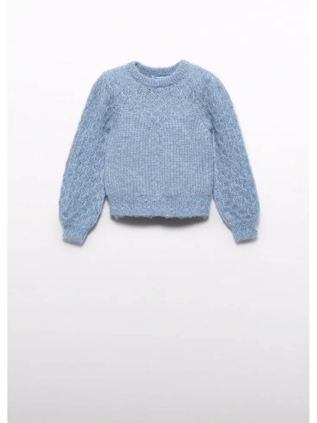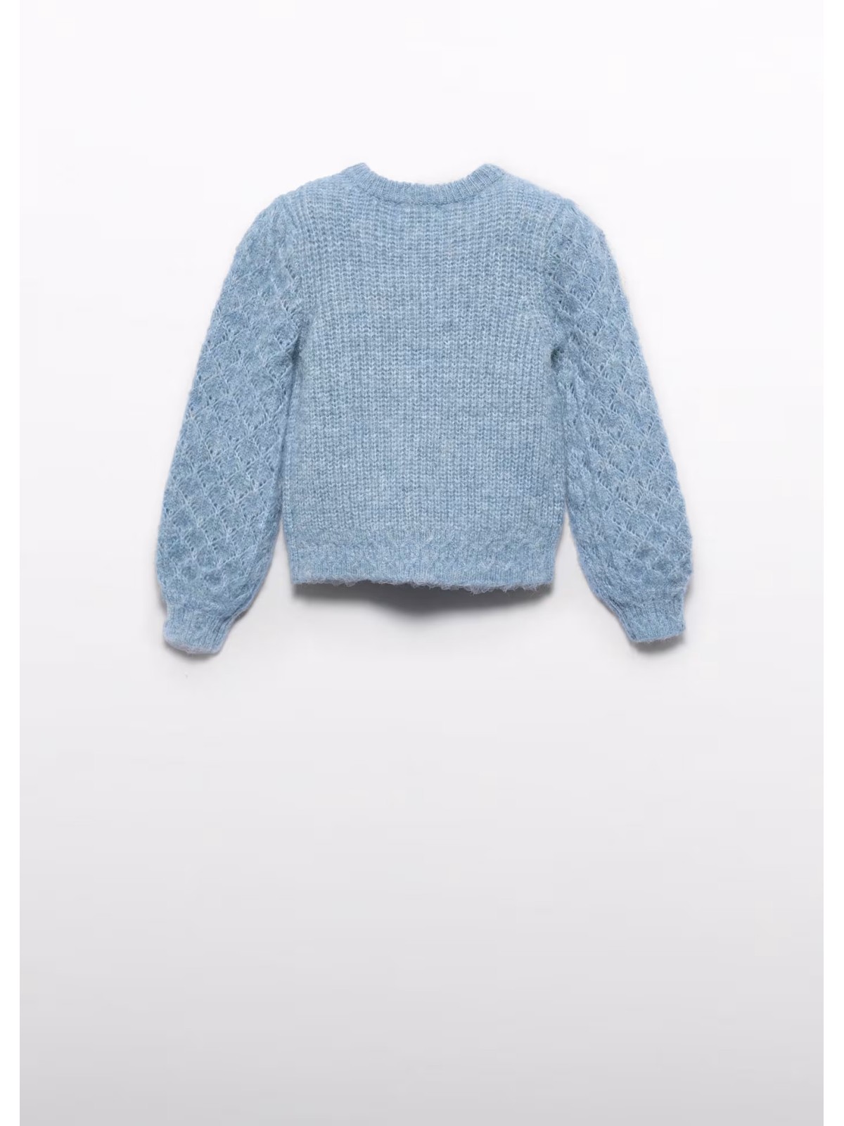 Maglione effetto traforato bambina. Modello girocollo con polsini ed elastico sul fondo