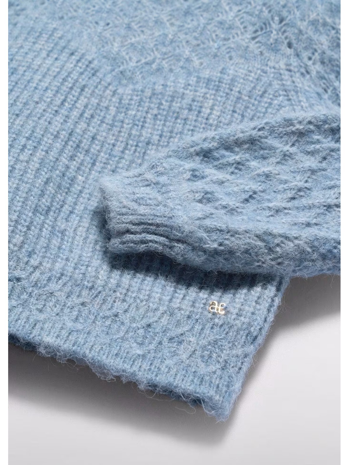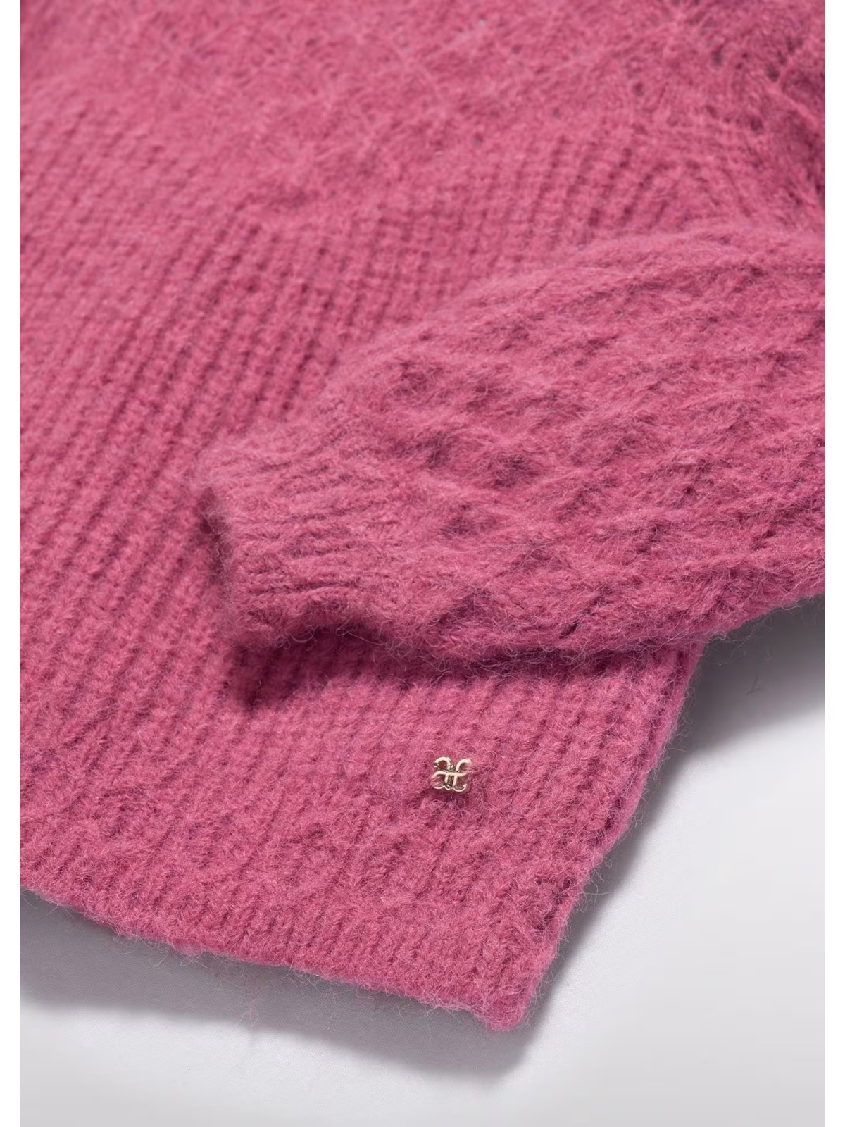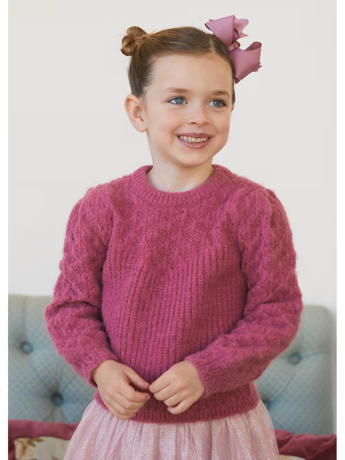 Maglione effetto traforato bambina. Modello girocollo con polsini ed elastico sul fondo