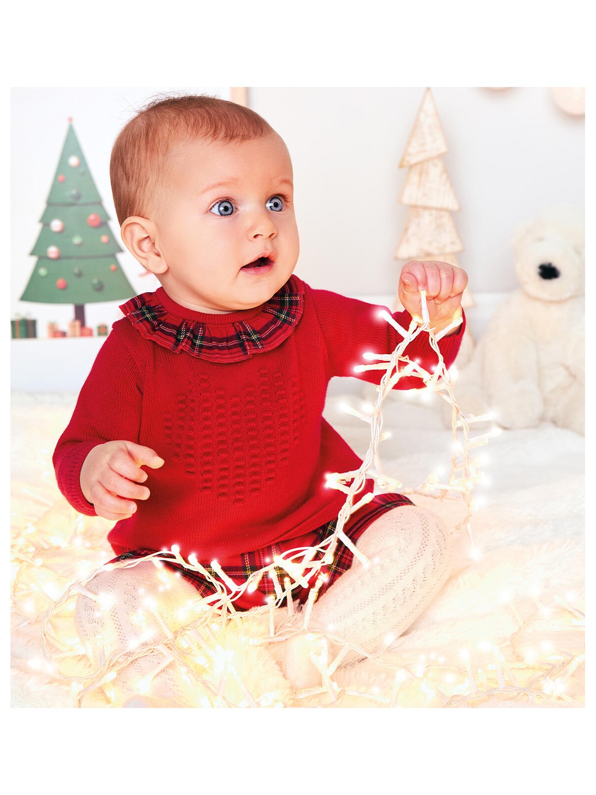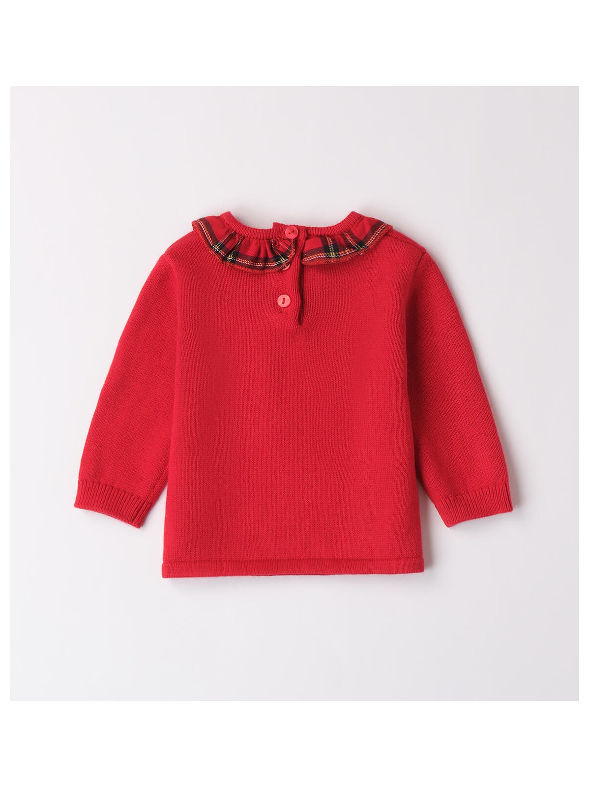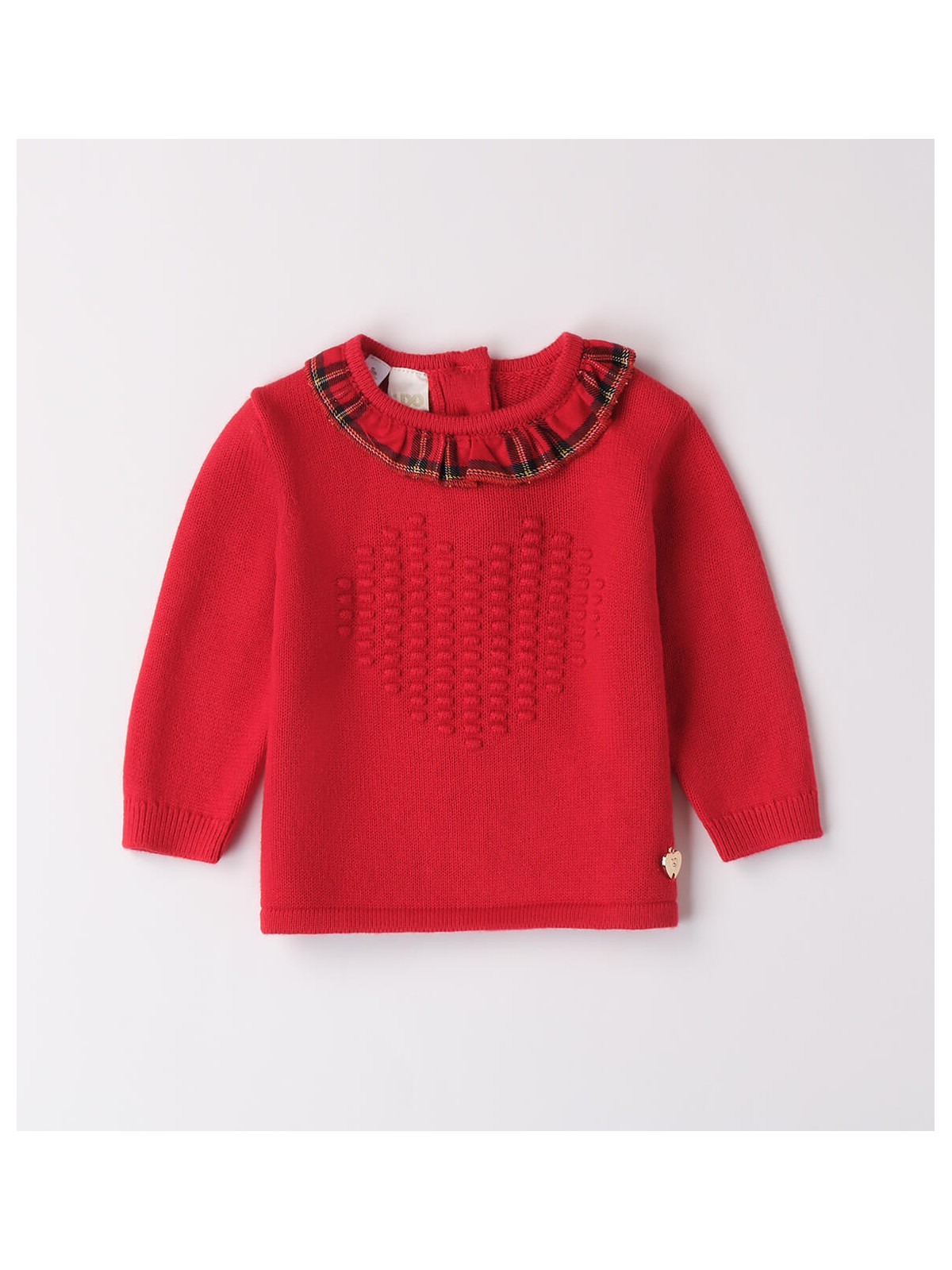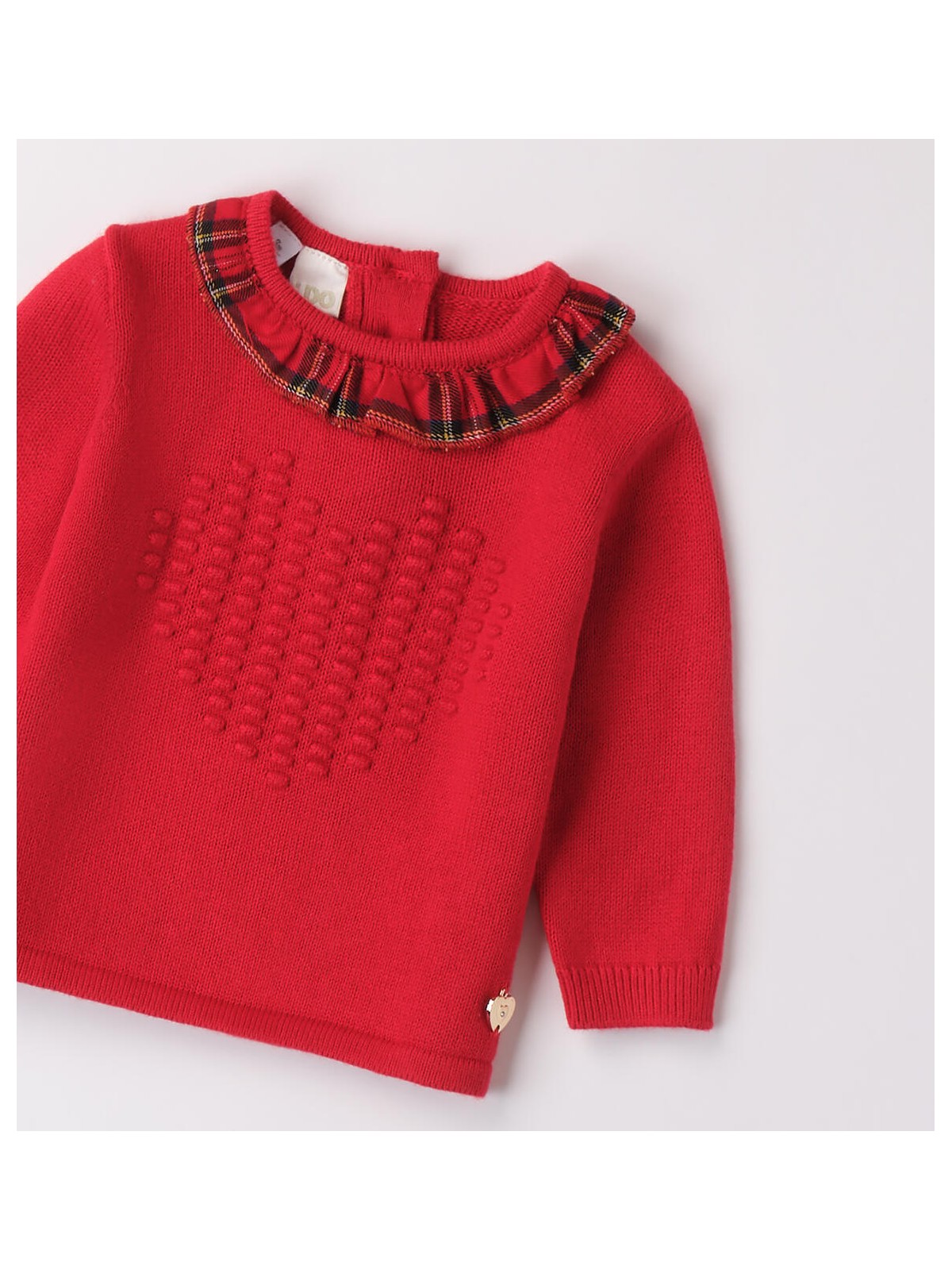 Maglioncino per neonata realizzato in tricot cotone e lana. Il modello presenta apertura sul retro con bottoni, fantasia tinta unita ruches in tartan in arricchimento e particolare lavorazione davanti a forma di cuore.