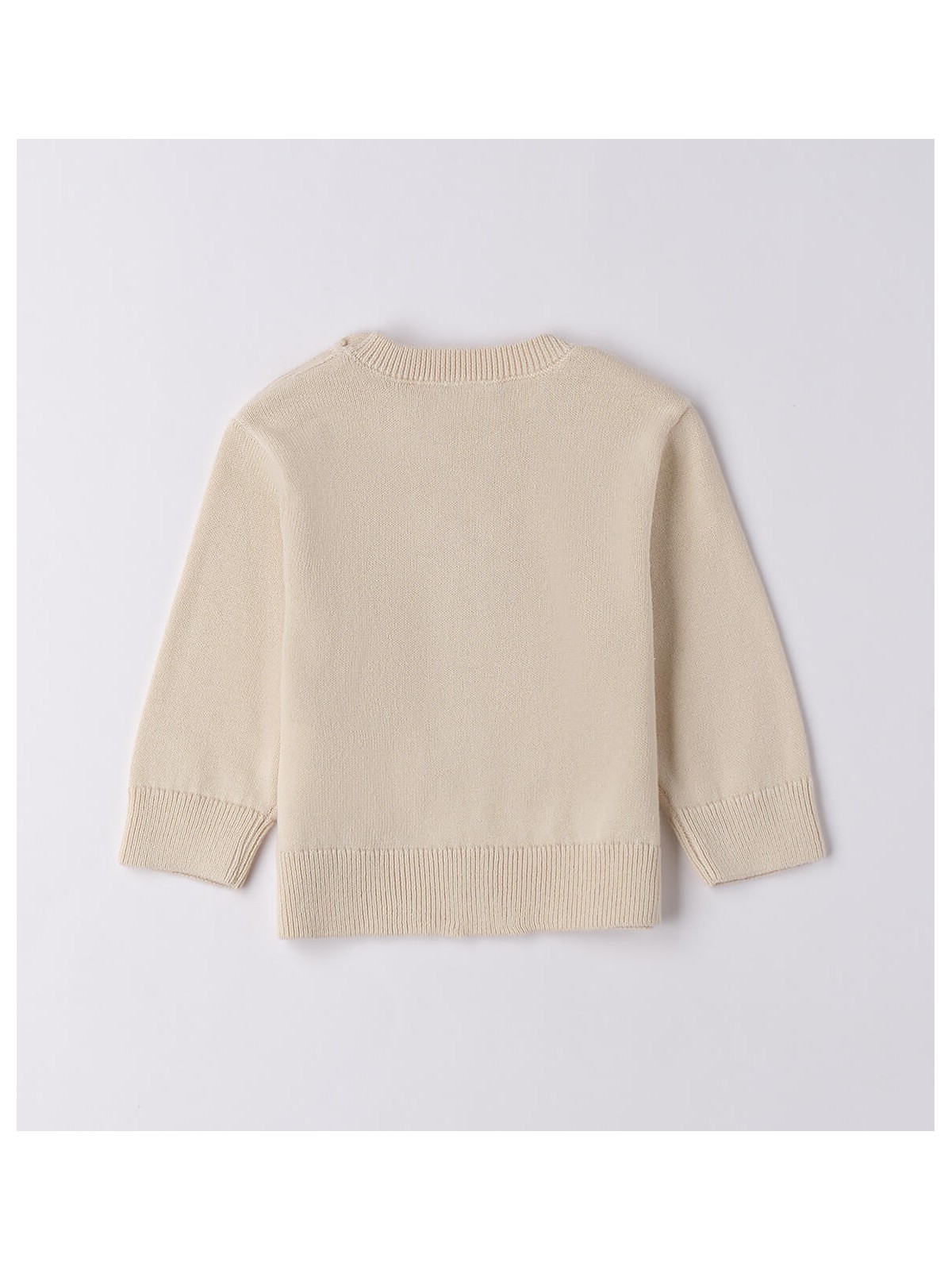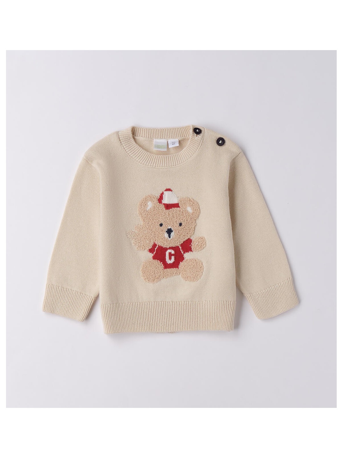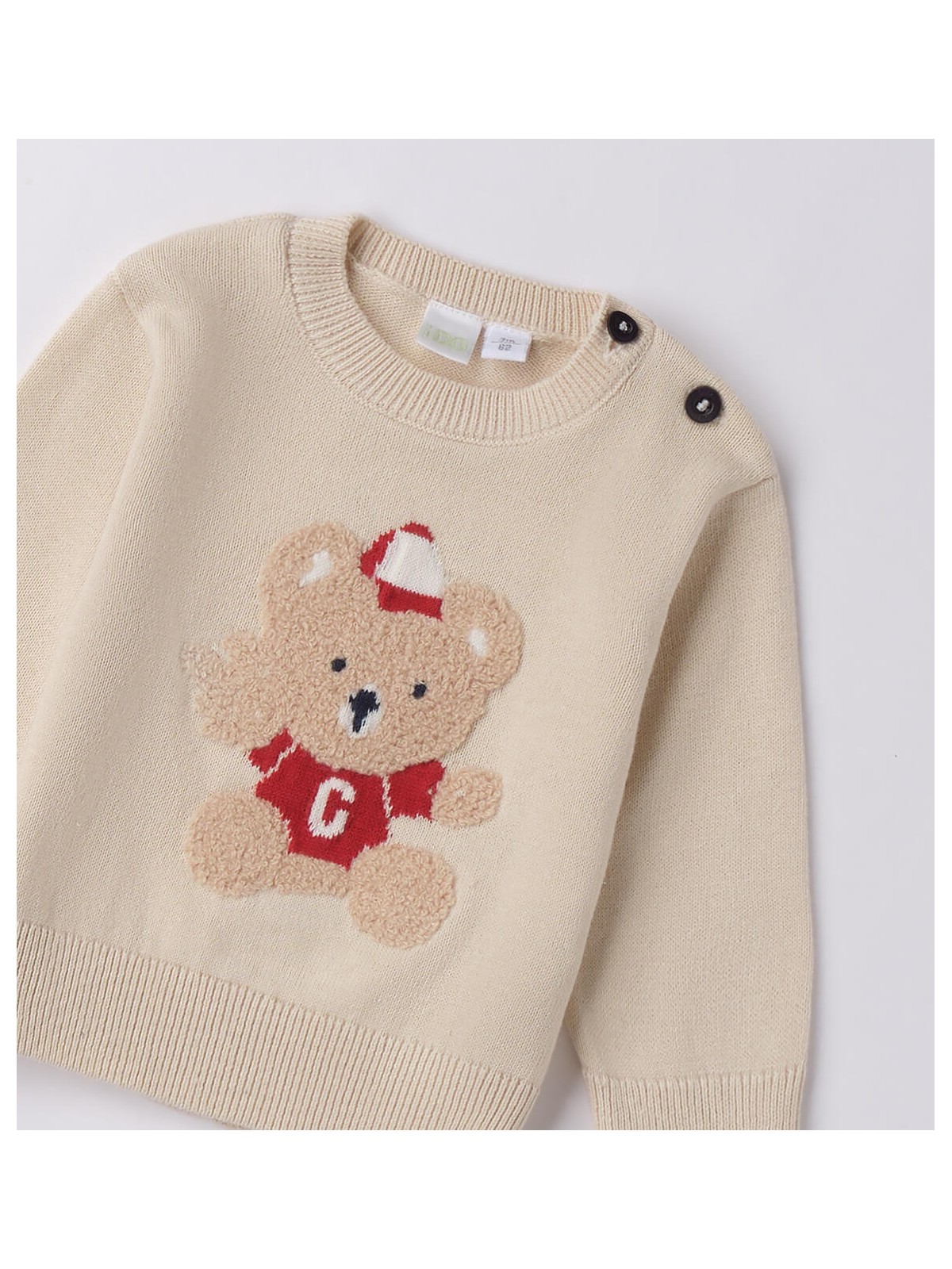 Maglioncino per bimbo realizzato in tricot . Il modello presenta apertura sulla spalla con bottoni e fantasia tinta unita con orsetto.
