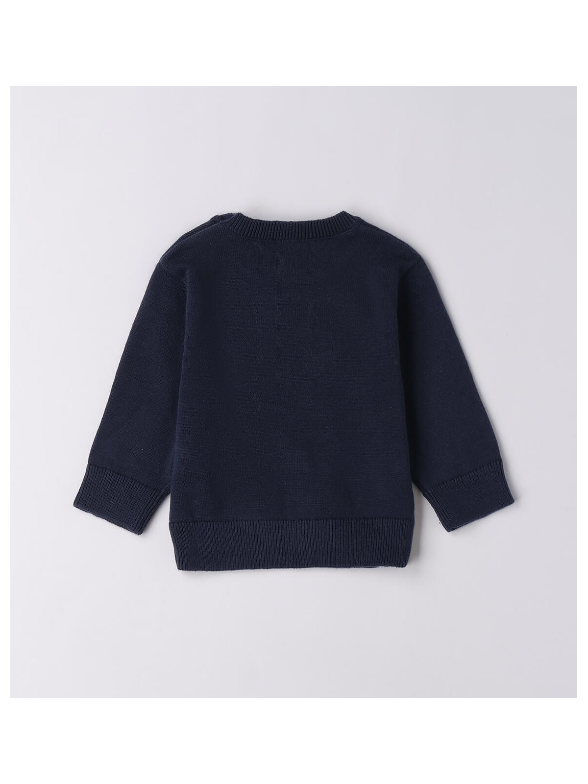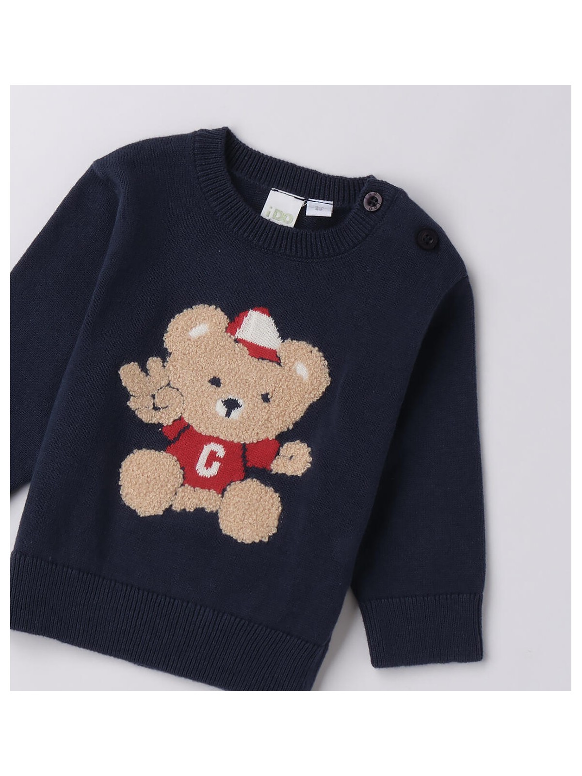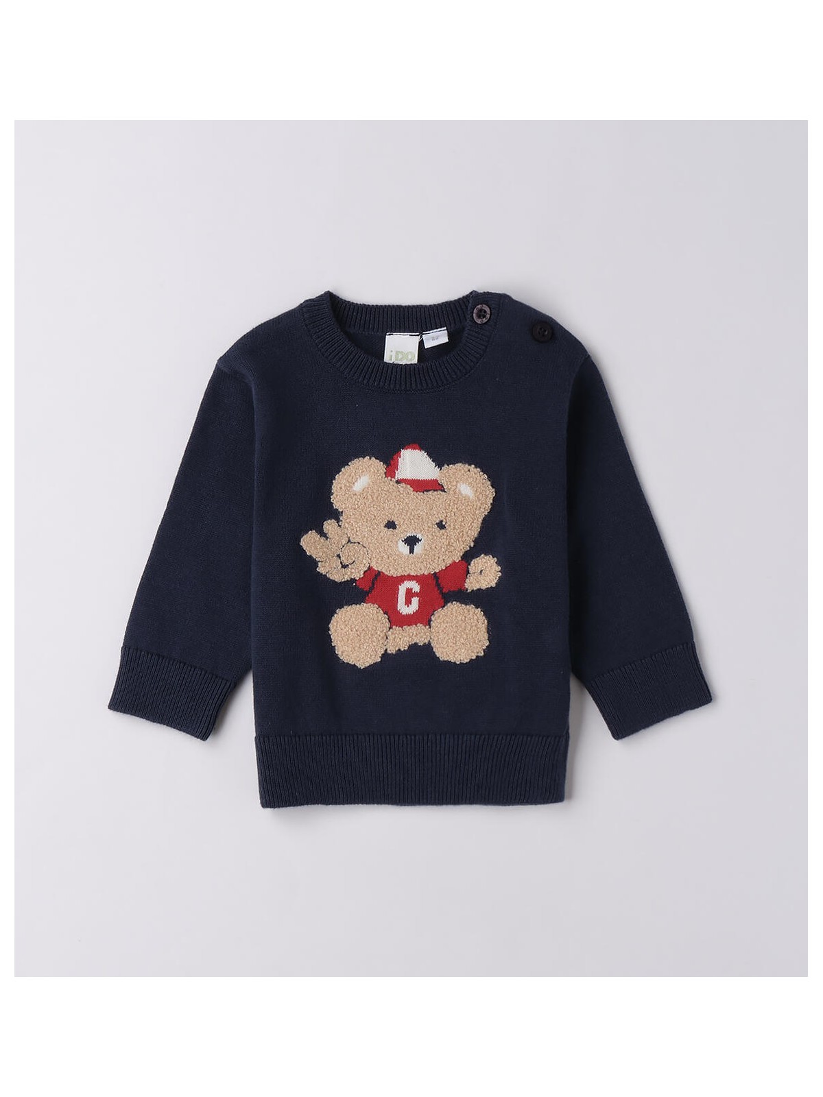 Maglioncino per bimbo realizzato in tricot . Il modello presenta apertura sulla spalla con bottoni e fantasia tinta unita con orsetto.