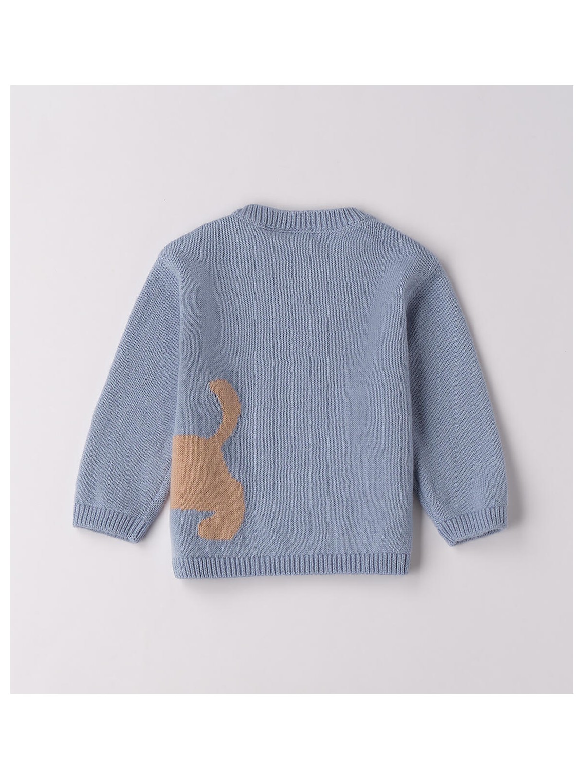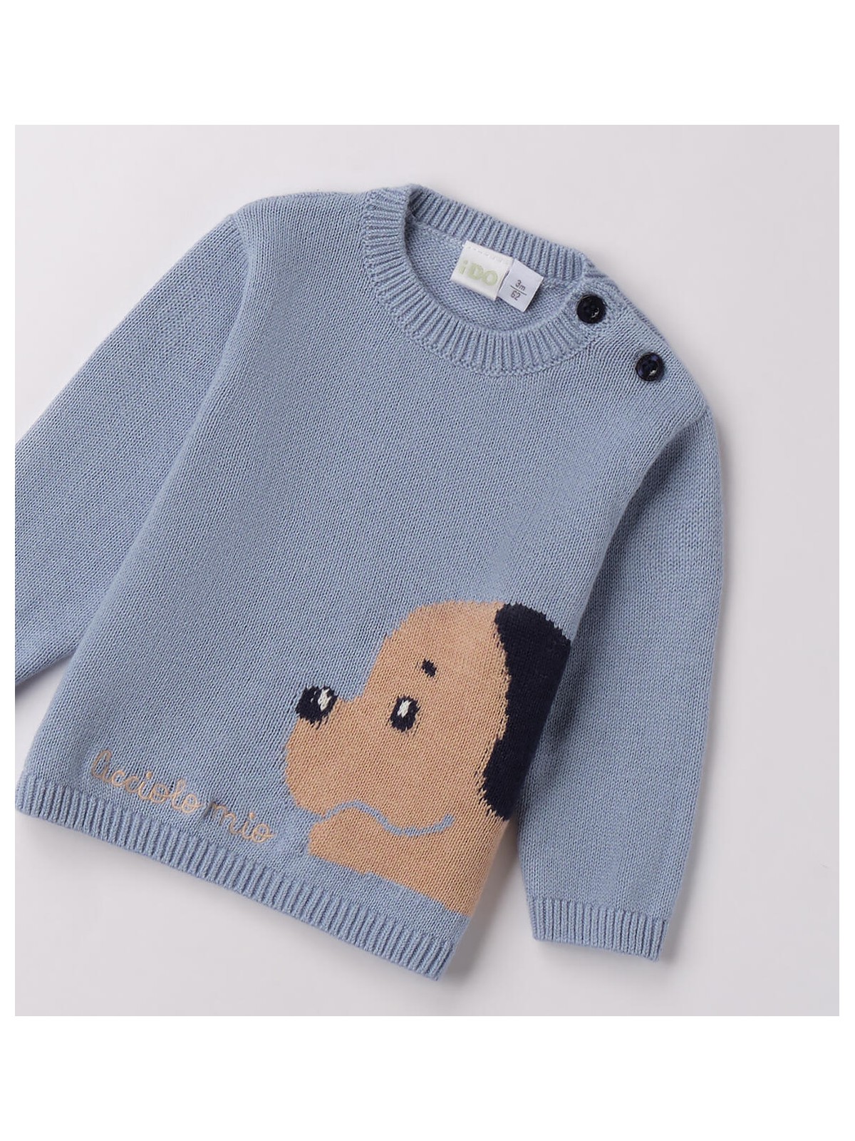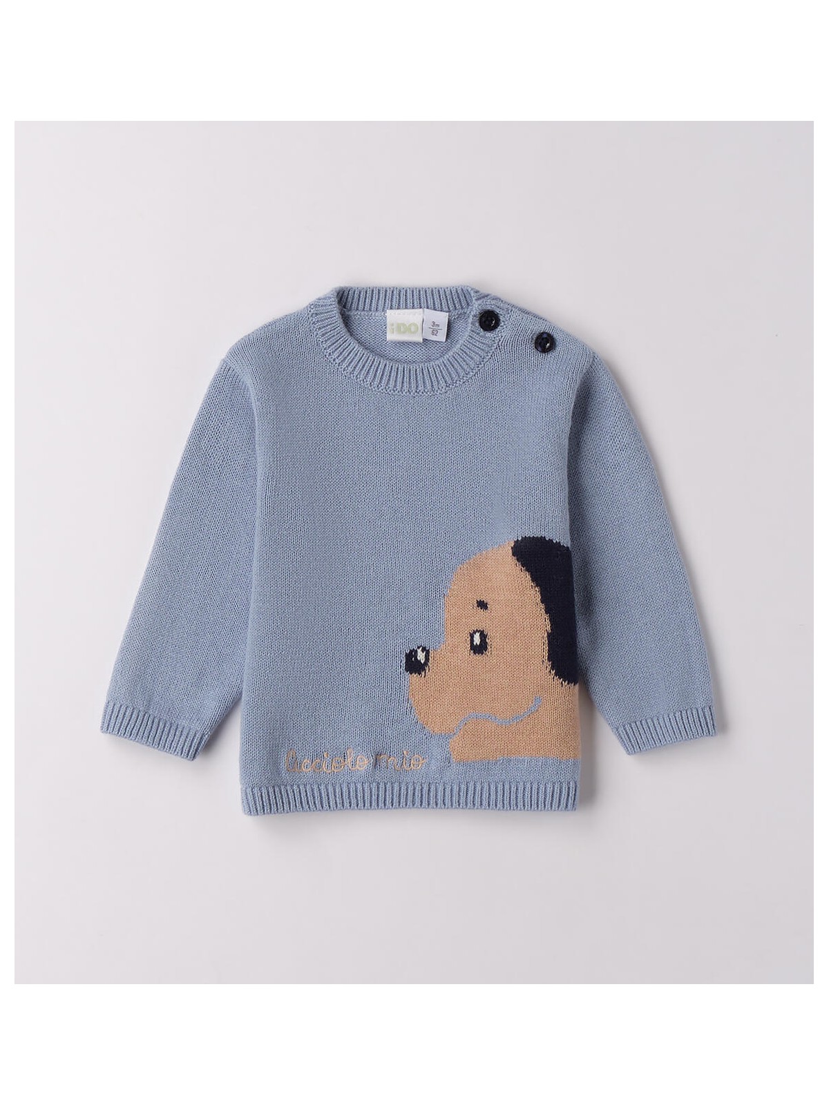 Maglioncino per bimbo realizzato in tricot di cotone misto lana. Il modello presenta apertura sulla spalla con bottoni e fantasia tinta unita con ricamo intarsio.